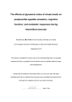 The effects of glycaemic index of mixed meals on postprandial appetite sensation, cognitive function; and metabolic responses during intermittent exercise Submitted by Mei Yi Wu to the University of Exeter as a thesis for the degree of Doctor of Philosophy in Sport and Health Sciences September 2013 This thesis is available for Library use on the understanding that it is copyright material and that no quotation from the thesis may be published without proper acknowledgement. I certify that all material in this thesis which is not my own work has been identified and that no material has previously been submitted and approved for the award of a degree by this or any other University. ……………………………………..Mei Yi Wu ABSTRACT Glucose is the primary fuel for the brain and also important for exercising muscle. The purpose of the thesis was to investigate the effects of the glycaemic index (GI) of mixed meals on appetite, cognitive performances and metabolic responses during intermittent exercise in recreationally active adults. Study one investigated whether a low GI (LGI) breakfast (GI = 42.5) could suppress appetite and reduce energy intake (EI) of 12 recreationally active females (28.2 ± 8.0 years) more than a high GI (HGI) breakfast (GI = 73.5). Area under the curve of the appetite score (AS AUC) following LGI breakfast was significantly greater than the HGI trial during the 60-min postprandial (pp) period (2568 ± 1027 vs. 2198 ± 821 mm∙min, p = 0.025). The HGI breakfast facilitated a stronger appetite suppressing effect up to eight hours post breakfast than the LGI trial (18834 ± 3906 vs. 21278 ± 3610 mm∙min, p = 0.028). The EI on the LGI trial day was significantly higher than on the pre-trial day (2,215 ± 576 vs. 1,748 ± 464 kcal, corrected p = 0.008). Fourteen recreationally active males (34.5 ± 8.9 years) in study two consumed the LGI (GI = 41.3) and HGI (GI = 74.3) breakfasts in the laboratory and then prescribed LGI and HGI meals in the free living environment. In line with study one, the AS AUC was significantly smaller following HGI than LGI breakfast over the 60-min pp period (2,989 ± 1,390 vs. 3,758 ± 1,290 mm∙min, p = 0.027). The HGI meals (GI = 76.9) suppressed appetite more than the LGI meals (GI = 39.6) over 12 hours on the trial day (35,454 ± 9,730 vs. 41,244 ± 8,829 mm∙min, p = 0.009) although energy balance was not different between trials. Study three investigated whether following a LGI breakfast (GI = 42.2) providing 1 g CHO kg-1 BM could result in a better vigilance and attention than a HGI breakfast (GI = 72.4), and reduced lunch EI in 16 recreationally active males (24.4 ± 3.6 years). A significant trial x time effect in the interference time of the Stroop Colour Word Task (SCWT) (p = 0.039) showed that the LGI breakfast maintained the attentional performance up to 90-min pp. Both high pre-task glucose concentration ([Glucose]) at 15-min pp and low pre-task [Glucose] at 105-min pp in the HGI trial were associated with unfavourable outcomes in vigilance in the Rapid Information Processing Task (RIPT). The LGI pre-task [Glucose] returning back to fasting level at 60-min pp was associated positively with the response time. The pre-lunch AS was a significant predictor of the lunch EI per fat free mass which explained 21% and 26% of variance in the LGI and HGI trials respectively. No significant difference was found in the ad libitum lunch EI between trials. Sixteen recreationally active males (27.8 ± 7.7 years) in study four consumed a LGI (GI = 42) and a HGI breakfast (GI = 72.8) providing 1.2 g CHO kg-1 BM consumed 60 minutes prior to intermittent running on two separate mornings. 1 Better attentional performance at 150-min pp was found following LGI than HGI breakfast. The significant trial x time interaction in the SCWT (p = 0.045) showed the shortest interference time performed after the last exercise session in the LGI trial. The amounts of CHO and fat being oxidized were comparable between trials in i n 16-min in mi n nnin i n in n i 65 2max. In conclusion, the pre-meal appetite sensation is more predictive of the subsequent meal EI than the pre-meal [Glucose]. The meal strategy for weight management in recreationally active adults may focus on greater appetite suppression by selecting HGI foods whilst maintaining healthy eating guidelines. Recreationally active males performing sports requiring high levels of vigilance and selective attention with low physical activity levels can benefit up to 60–90 min pp from the LGI breakfast. Their attentional performance can benefit from the LGI breakfast with moderate to high intermittent intensities in the late exercise period at 150–min pp. Recreationally active adults should consider the timing of meal consumption in relation to performing intermittent exercise, in order to maximize the advantages from the LGI or HGI breakfasts for cognitive performance or appetite suppression. They may be more liberal in pre-exercise food choices if substrate oxidation during intermittent running is only of their concern. 2 ACKNOWLEDGEMENT By this opportunity I would like to thank all who led me to complete my Ph.D.. Without their huge supports, the path to the doctorate would have never ended. First and foremost, I would like to express my gratitude to Professor Craig Williams and Dr. Jo Bowtell. It was a very difficult decision to start a new research project one year after I started the Ph.D. study. I am fortunate to have Craig as my new first supervisor. This thesis would not have been completed without his insightful guidance and support. Although Jo became my second supervisor halfway through my study, her positivity and constructive advice are invaluable in speeding up my progress. I would also like to thank to the staff at the Sport and Health Sciences, particularly David Childs, James Blackwell, Len Maurer and Dr. Sarah Jackman; and Dr. Jonathan Fulford from the University of Exe