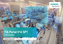 TIA Portal V14 SP1 Technical slides Unrestricted © Siemens AG 2017 TIA Portal Highlights of TIA Portal V14 SP1 1. Hardware configuration Details 2. STEP 7 - Innovations Support for new hardware components - CPU1511T(F) / CPU1515T(F) - Power Supply 60W 24/48/60V DC HF 6. TIA Portal options Freely editable comments for array and UDT New functions for the operability TIA updater: Fast mass update New instructions Openness: Ex/Import HW +IO via AutomationML Single block comparison ProDiag: Criteria analysis for S7-Graph User comments visible directly in the code Safety: Consistent Hardware- and Software Upload Option handling with S7-1500F F-IO-Status function block New technology object for SIMATIC Ident 5. System functions 3. WinCC - Innovations Windows 10 support Integration of SINUMERIK Operate in Runtime Advanced OPC UA DA client for WinCC Runtime Professional 4. Startdrive - Innovations Password API User-defined filters for cross-references WinCC WebUX- Auto Login for WinCC RT Professional Unrestricted © Siemens AG 2017 Page 2 March 2017 Optimized and extended commissioning wizard Online/offline comparison of parameter values Library handling Hardware configuration S7-1500 CPU Portfolio has been enlarged by T-CPU Compact CPU Standard CPU 1511C-1 PN 1512C-1 PN 1511F-1 PN 1513F-1 PN 1 1 1 1 1 1 1 1 1 1 Program/ Data memory 175 KB 1 MB 250 KB 1 MB 150/225 KB 1 MB 300/450 KB 1.5 MB 500/750 KB 3 MB 1/1.5 MB 5 MB Bit-Performance 60 ns 48 ns 60 ns 40 ns 30 ns Width 85mm 110mm 35mm 35mm 5 10 5 10 5 10 800 800 800 CPU-types Interfaces Positioning axis typical 2) maximum 3) Motion Control Ressources 4) 1) 20 MB additional memory for ODK application 4) Ressources for Motion Control technology objects (examples): 5) Additional Number of Cam´s: 1511T: 20; 1515T: 60; 1517T: 128 Unrestricted © Siemens AG 2017 Page 3 March 2017 1515F-2 PN New ODKCPU Technology CPU 1516F-3 PN/DP 1518F-4 PN/DP 1 1 2 1 1 1 3 1 1 2/3 MB 8 MB 4/6 MB 20 MB 225/225 KB 1 MB 750/750 KB 3 MB 3/3 MB 8 MB 4/6 MB 20 MB1) 10 ns 2 ns 1 ns 60 ns 30 ns 2 ns 1 ns 70mm 70mm 175mm 175mm 35mm 70mm 175mm 175mm 5 10 7 30 7 30 70 128 128 128 5 10 7 30 70 128 128 128 800 2400 2400 10240 10240 800 5) 2400 5) 10240 5) 10240 2 1 2 1 2 1 1511TF-1 1515TF-2 1517TF-3 PN PN PN 1518F-4 PN/DP ODK 1517F-3 PN/DP 2) at 4ms Servo/IPO cycle time and 35% CPU load due to Motion Control 2 1 2 1 1 2 1 3 3) no further TO´s applicable Speed setpoint: 40; Positioning: 80; Gearing: 160; Output cam: 20; Output camtrack: 160; Measuring input: 40 1 PROFINET IO with IRT 2 PROFINET IO with RT 3 PROFINET basic services PROFIBUS Hardware configuration Configuration of the System Power Supply PS 60W 24/48/60V DC HF Highlights with PS 60W 24/48/60V DC HF Infeed of 60W into the backplane bus, integrated power balancing in the TIA Portal, connection to 24/48/60 V DC Energy buffering for data backup (up to 20 MB) in the CPU Can be used with standard- and fail-safe CPUs 105mm width (can be plugged only on the left, next to the CPU) I&M 0 … 3 („electronic rating plate“ with article number, version, etc.) Customer benefits: Easy handling of huge data amounts, which has to be kept retentive, e.g. in order to save settings or parameterization data during power off on the CPU. Migration of S7-400 applications in factory automation is possible Unrestricted © Siemens AG 2017 Page 4 March 2017 Hardware configuration Configuration of the System Power Supply PS 60W 24/48/60V DC HF Precondition for Configuration Configuration in STEP 7 V14 SP1 CPU firmware: V2.1, power supply for the CPU is done via the backplane bus Can be used with the following S7-1500 CPUs: CPU 1511(F/T) up to CPU 1516(F) with article number: 6ES751x-xyy01-0AB0 (starting with FS01) CPU 1511C and CPU 1512C (starting with FS01) CPU 1517(F) and CPU 1518(F) starting with FS03 FS: Hardware functional state Unrestricted © Siemens AG 2017 Page 5 March 2017 Hardware configuration Configuration of the System Power Supply PS 60W 24/48/60V DC HF Increased quantity structure for retentive data Identical handling of retentive data like before Unrestricted © Siemens AG 2017 Page 6 March 2017 Hardware configuration Configure all IO channels of a module in a grid Configure all I/O channels of a module in a grid: All of the channels of the ET200MP DI&DQ HF can be configured in one grid. Improved overview and helpful functions like auto fill, copy & paste for diagnostics & IO parameters Unrestricted © Siemens AG 2017 Page 7 March 2017 Hardware configuration Direct renaming of device names in the network and topology view Direct renaming of device names in the network and topology view Time savings thanks to direct renaming in the network and topology view without opening the device properties Renaming via F2 shortcut, shortcut menu or by double-clicking on the device label Unrestricted © Siemens AG 2017 Page 8 March 2017 Hardware configuration Optimized (multi-)selection via shift key for network and device editor Optimized selection for network and device editor Quick (multi-)selection of several devices and modules with only two mouse clicks 1st click Support of device and network editor in all views Shift key + 2nd click Unrestricted © Siemens AG 2017 Page 9 March 2017 Hardware configuration Overview of IO tags of the complete IO station Overview of all IO tags of a complete IO station Additional display for the IO tags of the complete IO station that are used Display structured according to modules for easy assignment of the IO tags to the hardware Unrestricted © Siemens AG 2017 Page 10 March 2017 Hardware configuration Easy removal of unused GSD files Easy removal of unused GSD files in the project 1 Cleaning up of references to unused GSD files in the project Easy removing of unused GSDs from project with 3 clicks 3 2 Unrestricted © Siemens AG 2017 Page 11 March 2017 Hardware configuration Improved zoom and overview navigation for the device and network editor Improved zoom and overview navigation for the devic