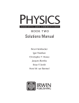 B OOK TWO Solutions Manual Brian Heimbecker Igor Nowikow Christopher T. Howes Jacques Mantha Brian P. Smith Henri M. van Bemmel Physics: Concepts and Connections Book Two Solutions Manual Authors Brian Heimbecker Igor Nowikow Christopher T. Howes Jacques Mantha Brian P. Smith Henri M. van Bemmel NELSON Director of Publishing David Steele First Folio Resource Group Project Management Robert Templeton Publisher Kevin Martindale Composition Tom Dart Project Editor Lina Mockus-O’Brien Proofreading and Copy Editing Christine Szentgyorgi Patricia Trudell Editor Kevin Linder COPYRIGHT © 2003 by Nelson, a division of Thomson Canada Limited. Printed and bound in Canada. 1 2 3 4 05 04 03 02 For more information contact Nelson, 1120 Birchmount Road Toronto, Ontario, M1K 5G4. Or you can visit our Internet site at http://www.nelson.com Illustrations Greg Duhaney Claire Milne ALL RIGHTS RESERVED. No part of this work covered by the copyright hereon may be reproduced, transcribed, or used in any form or by any means—graphic, electronic, or mechanical, including photocopying, recording, taping, Web distribution, or information storage and retrieval systems—without the written permission of the publisher. For permission to use material from this text or product, contact us by Tel 1-800-730-2214 Fax 1-800-730-2215 www.thomsonrights.com Every effort has been made to trace ownership of all copyrighted material and to secure permission from copyright holders. In the event of any question arising as to the use of any material, we will be pleased to make the necessary corrections in future printings. Table of Contents I Solutions to Applying the Concepts Questions Chapter 1 Section 1.3 1.4 1.6 1.7 1.8 1.11 1.12 1.13 1.14 1.15 1 1 1 3 3 4 5 6 6 7 Chapter 2 Section 2.1 2.2 2.3 2.4 2.5 2.6 2.7 2.8 8 9 10 11 12 13 14 15 Chapter 3 Section 3.3 3.4 3.5 3.6 3.7 3.8 3.9 17 18 18 20 21 22 22 Chapter 4 Section 4.2 4.3 4.4 4.5 4.6 24 24 25 25 26 Chapter 5 Section 5.2 5.3 5.4 5.5 5.6 5.7 28 28 29 29 30 31 Chapter 6 Section 6.1 6.2 6.3 33 33 34 Chapter 7 Section 7.2 7.3 7.4 7.5 7.6 7.7 7.8 7.9 7.10 7.11 36 36 36 37 38 38 38 39 39 40 Chapter 8 Section 8.4 8.5 8.6 8.7 8.8 8.9 41 41 42 43 44 44 Chapter 9 Section 9.5 45 Chapter 10 Section 10.2 10.3 10.4 10.5 47 47 48 48 Chapter 11 Section 11.4 11.5 11.6 11.8 11.9 11.10 49 49 49 49 50 51 Chapter 12 Section 12.2 12.3 12.4 12.5 12.6 12.8 52 52 52 53 53 54 Chapter 13 Section 13.1 13.2 13.3 13.4 13.5 13.6 13.7 13.8 55 55 55 56 56 57 57 58 Chapter 14 Section 14.1 14.2 14.3 14.4 14.5 14.6 14.7 14.8 59 59 59 59 59 60 60 60 Table of Contents II Answers to End-of-chapter Conceptual Questions Chapter 1 Chapter 2 Chapter 3 Chapter 4 Chapter 5 Chapter 6 Chapter 7 Chapter 8 Chapter 9 Chapter 10 Chapter 11 Chapter 12 Chapter 13 Chapter 14 61 63 65 66 67 68 69 71 75 77 79 80 81 83 III Solutions to Endof-chapter Problems Chapter 1 Chapter 2 Chapter 3 Chapter 4 Chapter 5 Chapter 6 Chapter 7 Chapter 8 Chapter 9 Chapter 10 Chapter 11 Chapter 12 Chapter 13 Chapter 14 87 95 107 120 126 134 140 151 160 165 170 178 183 191 iii PART 1 Solutions to Applying the Concepts In this section, solutions have been provided only for problems requiring calculation. Section 1.3 60 s 24 h 60 min 1. (30 days) 1h 1 day 1 min 2.6 106 s (units cancel to give answer in seconds) 1 mile 1 km 2. (7 furlongs) 1.4 km 8 furlong 0.63 mile (units cancel to give answer in kilometres) 27.5 mL 20 oz 3. (1 quart) 1 quart 1 oz 5.5 102 mL (units cancel to give answer in millilitres) Section 1.4 1. Since the question is asking for velocity, the answer must include a direction. Since the direction in which the train travels is constant, d vavg t 2.5 104 m [N] vavg 1.8 103 s vavg 14 m/s [N] 2. a) Since the question is asking for average speed, direction is not required. d vavg t 8.0 km vavg 5.0 h vavg 1.6 km/h b) Since the question is asking for average velocity, direction is required. d vavg t 3.0 km [W] 5.0 km [E] vavg 5.0 h 3.0 km [E] 5.0 km [E] vavg 5.0 h 2.0 km [E] vavg 5.0 h vavg 0.40 km/h [E] 3. a) Since the question asks for the car’s velocity, direction is important. Since the direction is constant, d vavg t 9.0 m [E] 0 m [E] vavg 8.0 s vavg 1.1 m/s [E] b) The car’s instantaneous velocity at 5 s can be approximated by the difference between the distance travelled after 6 s and the distance travelled after 5 s, divided by the time during that interval: d vavg t 8.0 m [E] 8.0 m [E] vavg 6.0 s 5.0 s vavg 0 m/s Section 1.6 1. v22 v12 2ad v22 v12 d 2a (600 m/s)2 (350 m/s)2 d 2(12.6 m/s2) d 9.4 103 m 2. 10 cm 1.0 101 m (v1 v2)t d 2 2d v 1 v2 t 2(1.0 101 m) v1 0.05 m/s 3.0 s v1 1.7 102 m/s 3. a) Igor: dI vIt 1 Brian: dB aBt2 2 If they meet, dI dB 8.0 m 1 vIt 8.0 m aBt2 2 1 0 (2.8 m/s2)t2 (7.0 m/s)t 8.0 m 2 0 (1.4 m/s2)t2 (7.0 m/s)t 8.0 m Solutions to Applying the Concepts 1 2 b bac 4 t 2a 7.0 m/s (7.0 m/s) 4(1 .4 m/s )(8.0 m) t 2(1.4 m/s2) 2 2 7.0 m/s 2.05 m/s t 2.8 m/s2 t 3.2 s or t 1.8 s We will take the lower value: t 1.8 s. 1 b) dB (2.8 m/s2)(1.8 s)2 2 dB 4.4 m 4. 8.0 cm 8.0 102 m v22 v12 2ad v22 v12 a 2d (0 m/s)2 (350 m/s)2 a 2(8.0 102 m) a 7.7 105 m/s2 5. ttotal t1 t2 t3 ttotal 3.0 s 6.0 s 10 s ttotal 19.0 s In the first 3.0 s, the truck travels a distance of: 1 d1 (v1 v2)t1 2 1 d1 (0 m/s 8.0 m/s)(3.0 s) 2 d1 12 m Since the truck travels at a constant speed over the second interval, d2 v2t2 d2 (8.0 m/s)(6.0 s) d2 48 m For the final interval, 1 d3 v1t3 at32 2 1 d3 (8.0 m/s)(10 s) (2.5 m/s2)(10 s)2 2 2 d3 2.1 10 m dtotal d1 d2 d3 dtotal 12 m 48 m 2.1 102 m dtotal 2.7 102 m dtotal vavg ttotal 2.7 102 m vavg 19.0 s vavg 14 m/s 2 6. 100 km/h 27.8 m/s 1 d v1t at2 2 1 500 m (27.8 m/s)t (30 m/s2)t2 2 0 (15 m/s2)t2 (27.8 m/s)t 500 m 27.8 m/s (27.8 m/s) 4(1 5 m/s )(50 0 m) t 2(15 m/s2) 2 2 t 4.9 s 1 7. a) d v1t at2 2 1 80 m (17 m/s)t (9.8 m/s2)t2 2 2 2 0 (4.9 m/s )t (17 m/s)t 80 m 17 m/s (17 m /s) 4(4.9 m/s )(80 m) t 2(4.9 m/s2) 2 2 t 2.7 s b) v22 v12 2ad 2 v2 vad 1 2 2 v2 (17 /s) m 2(9.8 (80 m/s2)) m v2 43 m/s v2 v1 8. a) a t 