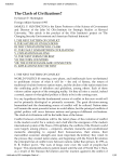 8/8/2010 103 Huntington Clash of Civilizations fu… The Clash of Civilizations? by Samuel P. Huntington Foreign Affairs Summer 1993 SAMUEL P. HUNTINGTON is the Eaton Professor of the Science of Government and Director of the John M. Olin Institute for Strategic Studies at Harvard University. This article is the product of the Olin Institute's project on "The Changing Security Environment and American National Interests." I. THE NEXT PATTERN OF CONFLICT II. THE NATURE OF CIVILIZATIONS III. WHY CIVILIZATIONS WILL CLASH IV. THE FAULT LINES BETWEEN CIVILIZATIONS V. CIVILIZATION RALLYING VI. THE WEST VERSUS THE REST VII. THE TORN COUNTRIES VIII. THE CONFUCIAN-ISLAMIC CONNECTION IX. IMPLICATIONS FOR THE WEST I. THE NEXT PATTERN OF CONFLICT WORLD POLITICS IS entering a new phase, and intellectuals have not hesitated to proliferate visions of what it will be -- the end of history, the return of traditional rivalries between nation states, and the decline of the nation state from the conflicting pulls of tribalism and globalism, among others. Each of these visions catches aspects of the emerging reality. Yet they all miss a crucial, indeed a central, aspect of what global politics is likely to be in the coming years. It is my hypothesis that the fundamental source of conflict in this new world will not be primarily ideological or primarily economic. The great divisions among humankind and the dominating source of conflict will be cultural. Nation states will remain the most powerful actors in world affairs, but the principal conflicts of global politics will occur between nations and groups of different civilizations. The clash of civilizations will be the battle lines of the future. Conflict between civilizations will be the latest phase of the evolution of conflict in the modern world. For a century and a half after the emergence of the modern international system of the Peace of Westphalia, the conflicts of the Western world were largely among princes -- emperors, absolute monarchs and constitutional monarchs attempting to expand their bureaucracies, their armies, their mercantilist economic strength and, most important, the territory they ruled. In the process they created nation states, and beginning with the French Revolution the principal lines of conflict were between nations rather than princes. In 1793, as R. R. Palmer put it, "The wars of kings were over; the ward of peoples had begun." This nineteenth-century pattern lasted until the end of World War I. Then, as a result of the Russian Revolution and the reaction against it, the conflict of …fatih.edu.tr/103 Huntington Clash of … 1/20 8/8/2010 103 Huntington Clash of Civilizations fu… nations yielded to the conflict of ideologies, first among communism, fascismNazism and liberal democracy, and then between communism and liberal democracy. During the Cold War, this latter conflict became embodied in the struggle between the two superpowers, neither of which was a nation state in the classical European sense and each of which defined its identity in terms of ideology. These conflicts between princes, nation states and ideologies were primarily conflicts within Western civilization, "Western civil wars," as William Lind has labeled them. This was as true of the Cold War as it was of the world wars and the earlier wars of the seventeenth, eighteenth and nineteenth centuries. With the end of the Cold War, international politics moves out of its Western phase, and its center-piece becomes the interaction between the West and non-Western civilizations and among non-Western civilizations. In the politics of civilizations, the people and governments of non-Western civilizations no longer remain the objects of history as targets of Western colonialism but join the West as movers and shapers of history. II. THE NATURE OF CIVILIZATIONS DURING THE COLD WAR the world was divided into the First, Second and Third Worlds. Those divisions are no longer relevant. It is far more meaningful now to group countries not in terms of their political or economic systems or in terms of their level of economic development but rather in terms of their culture and civilization. What do we mean when we talk of a civilization? A civilization is a cultural entity. Villages, regions, ethnic groups, nationalities, religious groups, all have distinct cultures at different levels of cultural heterogeneity. The culture of a village in southern Italy may be different from that of a village in northern Italy, but both will share in a common Italian culture that distinguishes them from German villages. European communities, in turn, will share cultural features that distinguish them from Arab or Chinese communities. Arabs, Chinese and Westerners, however, are not part of any broader cultural entity. They constitute civilizations. A civilization is thus the highest cultural grouping of people and the broadest level of cultural identity people have short of that which distinguishes humans from other species. It is defined both by common objective elements, such as language, history, religion, customs, institutions, and by the subjective self-identification of people. People have levels of identity: a resident of Rome may define himself with varying degrees of intensity as a Roman, an Italian, a Catholic, a Christian, a European, a Westerner. The civilization to which he belongs is the broadest level of identification with which he intensely identifies. People can and do redefine their identities and, as a result, the composition and boundaries of civilizations change. Civilizations may involve a large number of people, as with China ("a civilization pretending to be a state," as Lucian Pye put it), or a very small number of people, such as the Anglophone Caribbean. A civilization may include several nation …fatih.edu.tr/103 Huntington Clash of … 2/20 8/8/2010 103 Huntington Clash of Civilizations fu… states, as is the case with Western, Latin American and Arab civi