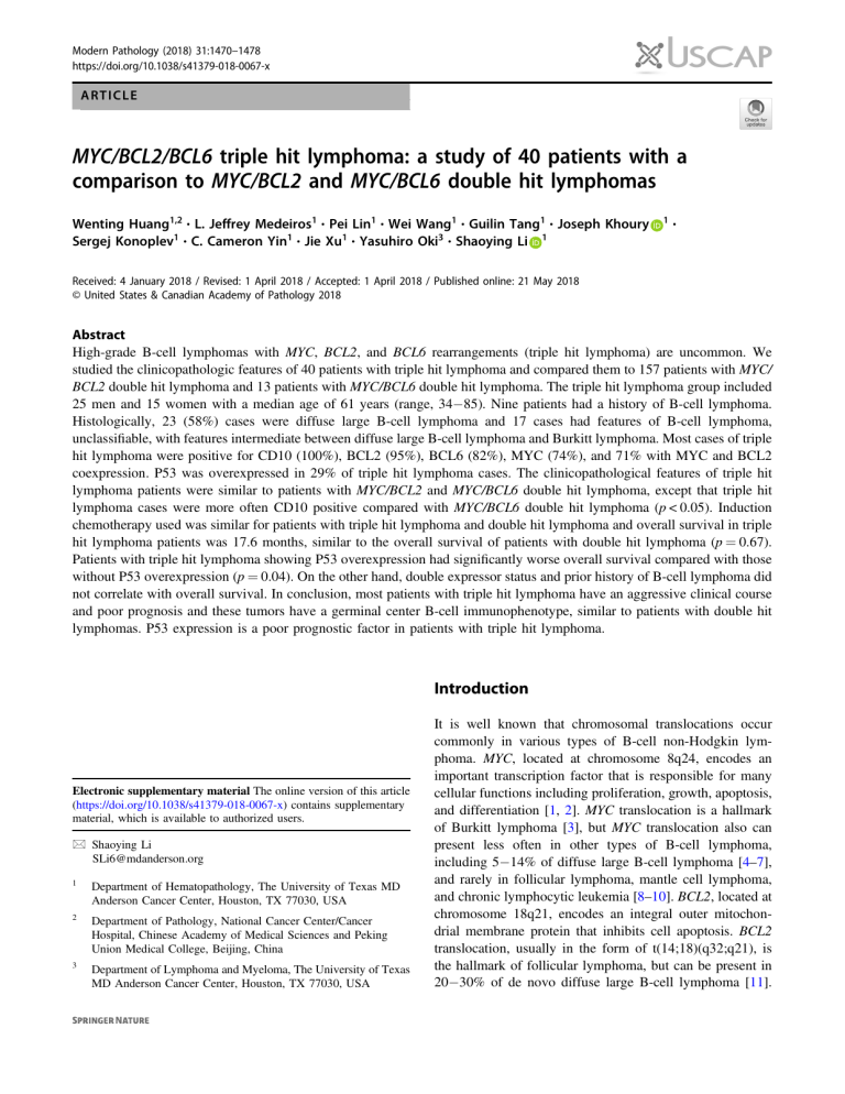 Modern Pathology (2018) 31:1470–1478 https://doi.org/10.1038/s41379-018-0067-x ARTICLE MYC/BCL2/BCL6 triple hit lymphoma: a study of 40 patients with a comparison to MYC/BCL2 and MYC/BCL6 double hit lymphomas Wenting Huang1,2 L. Jeffrey Medeiros1 Pei Lin1 Wei Wang1 Guilin Tang1 Joseph Khoury Sergej Konoplev1 C. Cameron Yin1 Jie Xu1 Yasuhiro Oki3 Shaoying Li 1 ● ● ● ● ● ● ● ● 1 ● ● 1234567890();,: 1234567890();,: Received: 4 January 2018 / Revised: 1 April 2018 / Accepted: 1 April 2018 / Published online: 21 May 2018 © United States & Canadian Academy of Pathology 2018 Abstract High-grade B-cell lymphomas with MYC, BCL2, and BCL6 rearrangements (triple hit lymphoma) are uncommon. We studied the clinicopathologic features of 40 patients with triple hit lymphoma and compared them to 157 patients with MYC/ BCL2 double hit lymphoma and 13 patients with MYC/BCL6 double hit lymphoma. The triple hit lymphoma group included 25 men and 15 women with a median age of 61 years (range, 34−85). Nine patients had a history of B-cell lymphoma. Histologically, 23 (58%) cases were diffuse large B-cell lymphoma and 17 cases had features of B-cell lymphoma, unclassifiable, with features intermediate between diffuse large B-cell lymphoma and Burkitt lymphoma. Most cases of triple hit lymphoma were positive for CD10 (100%), BCL2 (95%), BCL6 (82%), MYC (74%), and 71% with MYC and BCL2 coexpression. P53 was overexpressed in 29% of triple hit lymphoma cases. The clinicopathological features of triple hit lymphoma patients were similar to patients with MYC/BCL2 and MYC/BCL6 double hit lymphoma, except that triple hit lymphoma cases were more often CD10 positive compared with MYC/BCL6 double hit lymphoma (p < 0.05). Induction chemotherapy used was similar for patients with triple hit lymphoma and double hit lymphoma and overall survival in triple hit lymphoma patients was 17.6 months, similar to the overall survival of patients with double hit lymphoma (p = 0.67). Patients with triple hit lymphoma showing P53 overexpression had significantly worse overall survival compared with those without P53 overexpression (p = 0.04). On the other hand, double expressor status and prior history of B-cell lymphoma did not correlate with overall survival. In conclusion, most patients with triple hit lymphoma have an aggressive clinical course and poor prognosis and these tumors have a germinal center B-cell immunophenotype, similar to patients with double hit lymphomas. P53 expression is a poor prognostic factor in patients with triple hit lymphoma. Introduction Electronic supplementary material The online version of this article (https://doi.org/10.1038/s41379-018-0067-x) contains supplementary material, which is available to authorized users. * Shaoying Li SLi6@mdanderson.org 1 Department of Hematopathology, The University of Texas MD Anderson Cancer Center, Houston, TX 77030, USA 2 Department of Pathology, National Cancer Center/Cancer Hospital, Chinese Academy of Medical Sciences and Peking Union Medical College, Beijing, China 3 Department of Lymphoma and Myeloma, The University of Texas MD Anderson Cancer Center, Houston, TX 77030, USA It is well known that chromosomal translocations occur commonly in various types of B-cell non-Hodgkin lymphoma. MYC, located at chromosome 8q24, encodes an important transcription factor that is responsible for many cellular functions including proliferation, growth, apoptosis, and differentiation [1, 2]. MYC translocation is a hallmark of Burkitt lymphoma [3], but MYC translocation also can present less often in other types of B-cell lymphoma, including 5−14% of diffuse large B-cell lymphoma [4–7], and rarely in follicular lymphoma, mantle cell lymphoma, and chronic lymphocytic leukemia [8–10]. BCL2, located at chromosome 18q21, encodes an integral outer mitochondrial membrane protein that inhibits cell apoptosis. BCL2 translocation, usually in the form of t(14;18)(q32;q21), is the hallmark of follicular lymphoma, but can be present in 20−30% of de novo diffuse large B-cell lymphoma [11]. MYC/BCL2/BCL6 triple hit lymphoma: a study of 40 patients with a comparison to MYC/BCL2 and MYC/BCL6. . . BCL6 encodes a transcriptional repressor within germinal center B cells mediating lymphomagenesis through aberrant proliferation, apoptosis, and differentiation blockade and is located at chromosome 3q27. BCL6 translocation is the most common genetic abnormality in diffuse large B-cell lymphoma, in approximately 30−40% of cases [12, 13]. MYC translocation can be associated with BCL2 or BCL6 translocations in about 5−10% of cases of large B-cell lymphoma, also known as double hit lymphoma, of either MYC/BCL2 or MYC/BCL6 type. Large B-cell lymphomas with concurrent MYC, BCL2, and BCL6 translocations are also designated as triple hit lymphoma [14]. MYC/BCL2 double hit lymphoma is much more common than MYC/ BCL6 double hit lymphoma or triple hit lymphoma. Using 2008 World Health Organization (WHO) classification, most cases of double hit lymphoma and triple hit lymphoma were classified as either diffuse large B-cell lymphoma or as B-cell lymphoma, unclassifiable, with features intermediate between diffuse large B-cell lymphoma and Burkitt lymphoma. In the 2017 revision of the WHO classification, double hit lymphoma/triple hit lymphoma is placed in a new category designated as high-grade B-cell lymphoma with rearrangements of MYC and BCL2 and/or BCL6 [14]. Multiple retrospective studies have shown that patients with double hit lymphoma usually have an aggressive clinical course and very poor outcome [15–24]. Extranodal disease, a high serum lactate dehydrogenase level, bone marrow and central nervous system involvement and a higher international prognostic index score are frequent in double hit lymphoma patients. To date, many case series of double hit lymphoma, especially MYC/BCL2 double hit lymphoma, have been reported in the literature, but relatively few cases of t