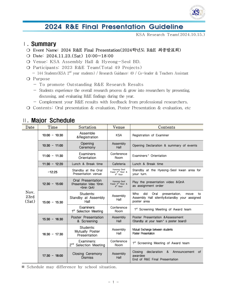 2024 R&E Final Presentation Guideline KSA Research Team(2024.10.15.) Ⅰ. Summary ❍ Event Name: 2024 R&E Final Presentation(2024학년도 R&E 최종발표회) ❍ Date: 2024.11.23.(Sat) 10:00~18:00 ❍ Venue: KSA Assembly Hall & Hyeong-Seol BD. ❍ Participants: 2023 R&E Team(Total 49 Projects) - 144 Students(KSA 2nd year students) / Research Guidance: 49 / Co-leader & Teachers Assistant ❍ Purpose - To promote Outstanding R&E Research Results - Students experience the overall research process & grow into researchers by presenting, discussing, and evaluating R&E findings during the year. - Complement your R&E results with feedback from professional researchers. ❍ Contents: Oral presentation & evaluation, Poster Presentation & evaluation, etc Ⅱ. Major Schedule Date Time Sortation Venue 10:00 ~ 10:30 Assemble &Registration KSA 10:30 ~ 11:00 Opening Ceremony Assembly Hall Opening Declaration & summary of events 11:00 ~ 11:30 Examiners Orientation Conference Room Examiners’Orientation 11:30 ~ 12:20 Lunch & Break time Cafeteria Lunch & Break time Standby at the Oral Presentation venue Hyeong-Seol Kwan 3rd floor & 4th floor Standby at the Hyeong-Seol kwan area for your turn. Hyeong-Seol Kwan 3rd floor & 4th floor Play the presentation video &QnA as assignment order ~12:25 Oral Presentation 12:30 ~ 15:00 Nov. 23rd (Sat) 15:00 ~ 15:30 15:30 ~ 16:30 16:30 ~ 17:30 17:30 ~ 18:00 (Presentation Video 10min +5min QnA) Contents Registration of Examiner Students: Standby at Assembly Hall Assembly Hall Who did Oral presentation, move to Assembly Hall silently&standby your assigned poster area Examiners: 1st Selection Meeting Conference Room 1st Screening Meeting of Award team Poster Presentation & Screening Assembly Hall Poster Presentation &Assessment (Standby at your team’s poster board) Students: Mutually Poster Presentation Assembly Hall Mutual Exchange between students Poster Presentation Examiners: 2nd Selection Meeting Conference Room 1st Screening Meeting of Award team Closing Ceremony Dismiss Assembly Hall Closing declaration & Announcement awardee End of R&E Final Presentation ※ Schedule may difference by school situation. - 1 - of Ⅲ. List of Pre-Submission Request [By R&E Student Team Leader] : Keeping Deadline is essential ! ❍ R&E Abstract : - Must 1 page only. - Form: https://drive.google.com/drive/folders/1xQjadf0qVw3YXEw357vqr8bmcPlR3T0X?usp=sharing - Deadline: ~ 11.10. (Sun) 23:59 Upload here: https://drive.google.com/drive/folders/19fm00kVeBfww_ZeEqwKloyxdeNl8Ggpe?usp=sharing ❍ Research Note: All notes need to get signature of Research Guidance - Deadline: 11.18. (Mon) 17:00, At the Research Team office All note needs to gather by student team leader. - Research note is a essential part of assessment. - Who did not get signature from Research Guidance due to special case(Online, COVID and so on), please download the letter of explanation below. and submit to Research note. if not, you will miss the point. - Who use Electronic Research Note, Please make as a book and submit to Research. PDF is not enough for assessment. All cover fee can support by R&E expenditure. Keep you receipt and submit to your Research Guidance. - Letter of Explanation Form : ( https://drive.google.com/file/d/1dpoaIIaSvutif3zyq0U_h_1a5EX3UewV/view?usp=sharing) ❍ R&E Final Presentation Poster(A1 size, PDF): - Deadline: ~11.14.(Thu) 23:59 - Upload here: https://drive.google.com/drive/folders/1tXJ7N9R5WXu2HvCw1NvhGKB7lhDFC8WD?usp=sharing - Need to insert all institutes logo in the Poster. Check poster example. - 2 - ❍ R&E Oral PPT & Recording oral presentaion submission: - Deadline: ~ 11.18(Mon) 23:59, - Upload here: https://drive.google.com/drive/folders/1QAWAARPVOlI13QbVSJakWGD00zi2pmVt?usp=sharing - Must record with 10minutes(In case of over the time limit, “0”point. ❍ R&E Final Report: After confirm from Research guidance and upload it. - 3 - - Form: https://drive.google.com/drive/folders/1wHfbbPrdSyK6L0_kFVOV2QqJ7c0CwkCF?usp=sharing - Deadline: ~ 11. 18(Mon) 23:59 - Upload here: https://drive.google.com/drive/folders/1xh3XSW5vxk2PtjKRrbsLo4Sm7DsT8lyV?usp=sharing Ⅳ. Assessment Session - It was assigned by Research guidance’s major & communication. 세션 과제번호 과제수 평가위원 (섭외 중) 발표장 A 수학 수학01 수학02 수학03 수학04 수학05 5 / 추후 배정 B 정보 /융합 정보01 정보02 정보03 융합06 융합09 5 / - C 물리 물리01 물리02 물리03 물리04 물리05 물리06 물리08 물리09 8 / - D 물리 /지구 /융합 물리07 물리10 지구01 지구02 융합03 융합11 융합12 7 / - E 화학 화학01 화학02 화학03 화학04 화학05 화학06 화학07 화학08 화학09 9 / - F 생물 생물01 생물02 생물03 생물04 생물05 생물06 생물07 생물08 8 / - 융합 융합01 융합02 융합04 융합05 융합07 융합08 융합10 7 / - G - 4 -