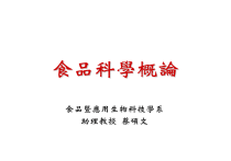 食品科學概論 食品暨應用生物科技學系 助理教授 蔡碩文 水的科學 • 水是極性分子 • 水分子間氫鍵 • 水分子與其他分子間氫鍵 • 水活性 • 水中的非極性分子 • 雜談 Electronegativity1 •中譯為「電負度」或「陰電性」。 •是一個以人為評定數值來表示元素原子在分子中 對共價鍵電子吸引能力的方式。 •元素電負度數值越大,原子在形成化學鍵時對共 價鍵電子的吸引力越強(共享電子偏向高電負度的原子核)。 雖然是共享電子,但這個共享並不平均 補充 Electronegativity2 原子核中質子數多,對電子的吸引力強 氧原子與氮原子是常見 於生物性分子中的原子 原 子 大 , 但 對 最 外 層 電 子 吸 引 力 弱 補充 Polarity of Small Molecules bond polarity molecular polarity 水 氨 二氧化碳 The polarity of a molecule depends both on the polarity of its covalent bonds and its geometry. 補充 水的科學 • 水是極性分子 • 水分子間氫鍵 • 水分子與其他分子間氫鍵 • 水活性 • 水中的非極性分子 • 雜談 Hydrogen Bonds between Atoms 強電負度原子 N,O,S N,O,S 強電負度原子 請注意原子間的距離配置,太近 變成電子共享,太遠無影響力。 • A hydrogen bond can form when the hydrogen atom covalently bonded to a strongly electronegative atom lies approximately 0.2 nm from another strongly electronegative atom that has an unshared electron pair. 補充 Hydrogen Bond Between Two Water Molecules • The polarity is the key to many of water’s unique physical properties. • Hydrogen bond traditional shown as a simple electrostatic attraction between oppositely charged particles. 注意氫原子在兩個氧原子 間的相對距離;距離太近 變成共享電子 (共價鍵), 太遠則作用力減弱 • This means the hydrogen bond is directionally. 2-087 Hydrogen Bond Between Water Molecules1 In liquid water, a single water molecule can form hydrogen bonds with up to four other water molecules. 2-087 Hydrogen Bond Between Water Molecules2 兩種被提出以解釋水分子間相互關係的模型 (未定論) • Isotropic model & Cluster model •The lifetime of the bonds are extremely short. •The structure of water is continuously flickering as water molecules rotates, bend, and reorient themselves. in pico (10-12) second Hydrogen Bond Between Water Molecules3 相同水分子數目 water ice 為什麼冰的密度比水小? In ice, each water molecule does deed form hydrogen bonds with four other water molecules. 補充 結冰過程中水分子的移動與排列 •急速冷凍時因水分子來不及跑到可結晶 的規律位置即降溫到難以移動,故冰晶 不大(例如冰淇淋)。 •但若頻繁開關門或保溫不當導致溫度升 降,水分子開始移動,就可以觀察到儲 存期間冰晶變大。 補充 如何避免冰晶破壞滑順口感? 通過最大冰晶生成帶的時間越長,冰晶會長大 時間和設備的冷凍能力有關 這就是家用設備做出的成品比不上專業設備做出成品的原因 3-011 水的科學 • 水是極性分子 • 水分子間氫鍵 • 水分子與其他分子間氫鍵 • 水活性 • 水中的非極性分子 • 雜談 水分子之外其他多種形式的氫鍵 Hydrogen bonds readily form between an electronegative atom (the hydrogen acceptor, usually oxygen or nitrogen with a lone pair of electrons) and a hydrogen atom covalently bonded to another electronegative atom (the hydrogen donor) in the same or another molecule. 補充 緊密鍵結在生物分子表面的水分子 紅色表示水分子 Hemoglobin 補充 與生物分子緊密結合的水分子 • 紅色標示胺基酸表示在內圈 直接與糖分子有交互作用 • 綠色標示胺基酸表示在外圈 與內圈胺基酸或透過水與糖 分子有交互作用 注意看此蛋白質 (arabinose binding protein, 藍色背景),與水分子和糖分子間的氫鍵 補充 Water Molecules Bound to Food 2. 距離巨分子較遠的水分子僅和 周圍的水分子發生交互作用, 可自由移動旋轉,自由度大, 故稱自由水 (free water)。 3. 排列固定的結合水可視為巨分子 的延伸,藉由交互作用仍有一定 的控制力,故這些較不自由的水 分子被稱為 intermediate layer。 1. 靠近巨分子的水分子與巨分子的官能基發生交互作用,因此方位角度距離較固定, 結合力強,安定,因此被稱為結合水 (bound water)。 4. 食品中的水,依其與食品分子的結合強度 (也就是水的能量位階,energy state), 分成自由水 (free water) 和結合水 (bound water),結合水可依結合的強度再細分。 2-087 水的科學 • 水是極性分子 • 水分子間氫鍵 • 水分子與其他分子間氫鍵 • 水活性 • 水中的非極性分子 • 雜談 Vapor Pressure Vapor pressure is the pressure exerted by a vapor in thermodynamic equilibrium with its condensed phases (solid or liquid) at a given temperature in a closed system. 溫度越高,蒸氣壓越高 因為必須達到平衡,所以有時又被稱為飽和蒸汽壓 補充 Water Activity 1. 蒸氣壓與系統中分子的能量狀態有關。分子能量高時變成氣態貢獻蒸氣壓,故溫度高時 蒸氣壓大。 2. 因食品中溶質 (此例是葡萄糖) 與水分子發生交互作用,使得杯中液體水的能量位階出現 差異,區分為結合水與自由水。自由水的量比加入糖前還少,但圖未能顯示。 3. 然而一般狀態下只有自由水能汽化貢獻蒸氣壓,故加入糖後自由水減少,蒸氣壓也降低 (圖中水蒸氣分子數減少) 4. 測量樣品的水蒸氣分壓 (P),再以飽和純水蒸氣壓 (P0) 為參考標準,P/P0 (也就是相對溼度) ,來表示水活性 (water activity) 2-088 Water content (moisture content) 等溫 吸濕/脫濕 曲線1 Strongly bound monolayer water Less strongly bound Free water water layer and 吸濕後期水分上升得