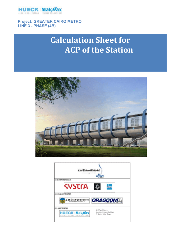 Project: GREATER CAIRO METRO LINE 3 - PHASE (4B) Calculation Sheet for ACP of the Station Calculation Sheet For Curtain Wall Egypt Technical Office CONTENTS 1) General Information. 2) Codes and References. 3) Materials. 4) Loading. 5) Calculations. 1) General Information: Project: GREATER CAIRO METRO LINE 3 - PHASE (4B) Location: Cairo, Egypt 2) Codes and References: a.AISC 360-10. b. Egyptian Code for loading. 3) Materials: Aluminum Composite Cladding ACP panel 4 mm thickness 4) Loading: General load factor = 1 5) Calculations. SAP2000 2.2 4.4 8/28/19 3:57:04 6.6 8.8 11.0 13.2 15.4 SAP2000 v16.0.0 - File:panel - 3-D View - KN, mm, C Units 17.6 19.8 22.0 24.2 26.4 28.6 30.8 SAP2000 57.1 57.1 8/28/19 3:57:50 57.1 57.1 57.1 57.1 57.1 57.1 57.1 57.1 SAP2000 v16.0.0 - File:panel - Area Uniform (wind) (GLOBAL - Y) - Kgf, m, C Units 57.1 57.1 57.1 57.1 SAP2000 -35.0 -35.0 8/28/19 3:58:54 -35.0 -35.0 -35.0 -35.0 -35.0 -35.0 -35.0 -35.0 -35.0 SAP2000 v16.0.0 - File:panel - Area Uniform (WIND SUCT) (GLOBAL - Y) - Kgf, m, C Units -35.0 -35.0 -35.0 Cladding Panel analysis 4 sided simply supported(1.795*1.40)m Pressure on panel q=0.35 KN/m2 in case of suction and 0.56 KN/m2 in case of comp. Thickness of panel t=4 mm Width of panel b=1.40 m Length of panel a=1.795 m a/b=1.28 Modulus of elasticity E=5770 ksi=39782.75 mpa Allowable of bending stress = 90.829 Mpa Strength of aluminum skin Effective thickness of panel teff =0.157 in =3.988 mm Stress check Stress = =25.8 MPa < fb=90.83 mpa (safe). Stress deflection: Def. actual = α* (qb4 /Et3)=13.10 mm Def allowable = b/60=23.33mm Safe deflection Calculations Maximum Panel Stress Maximum Panel Deflection: 2 2 Vmax = E w* b / T Equal 4 3 ymax = (-D w* b ) / ( EACM* T ACM) W = Uniform Load (psi) b = Smallest Panel Dimension (in.) a/b = Ratio of Largest Panel Dimension to Smallest Panel Dimension (Always >=1) Simple Supports All Four Sides Simple Supports a sides Fixed Supports b sides Fixed Supports a sides Simple Supports b sides Fixed Supports All Four Sides a/b E D h 1 1.2 1.4 1.6 1.8 2 0.2874 0.3762 0.4530 0.5172 0.5688 0.6102 0.7500 0.0444 0.0616 0.0770 0.0906 0.1017 0.111 0.1421 E D 0.4182 0.5208 0.5988 0.6540 0.6912 0.7146 0.7500 0.0210 0.0349 0.0502 0.0658 0.0800 0.0922 0.0922 E D 0.4182 0.4646 0.4860 0.4968 0.4971 0.4973 0.5000 0.0210 0.0243 0.0262 0.0273 0.0280 0.0283 0.0285 E D 0.3078 0.3834 0.4356 0.4680 0.4872 0.4974 0.5000 0.0138 0.0188 0.0226 0.0251 0.0267 0.0277 0.0284