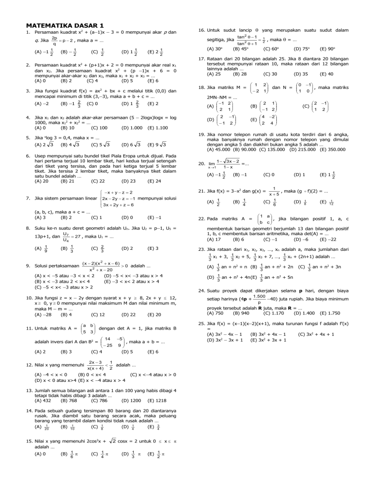 MATEMATIKA DASAR 1 1. Persamaan kuadrat x2 + (a1)x 3 = 0 mempunyai akar p dan 2p q. Jika p 2 , maka a = … q (A) 1 1 2 (B) 1 2 (C) 1 2 (D) 1 1 2 (E) 2 1 2 2. Persamaan kuadrat x2 + (p+1)x + 2 = 0 mempunyai akar real x1 dan x2. Jika persamaan kuadrat x2 + (p 1)x + 6 = 0 mempunyai akar-akar x2 dan x3, maka x1 + x2 + x3 = … (A) 0 (B) 2 (C) 4 (D) 5 (E) 6 3. Jika fungsi kuadrat f(x) = ax2 + bx + c melalui titik (0,0) dan mencapai minimum di titik (3,3), maka a + b + c = … (A) 2 (B) 1 2 (C) 0 (D) 1 2 (E) 2 3 3 4. Jika x1 dan x2 adalah akar-akar persamaan (5 2logx)logx = log 1000, maka x12 + x22 = … (A) 0 (B) 10 (C) 100 (D) 1.000 (E) 1.100 5. Jika xlog 3 = 0,4, maka x = … (A) 2 3 (B) 4 3 (C) 5 3 (D) 6 3 (E) 9 3 6. Usep mempunyai satu bundel tikel Piala Eropa untuk dijual. Pada hari pertama terjual 10 lembar tiket, hari kedua terjual setengah dari tiket yang tersisa, dan pada hari ketiga terjual 5 lembar tiket. Jika tersisa 2 lembar tiket, maka banyaknya tiket dalam satu bundel adalah … (A) 20 (B) 21 (C) 22 (D) 23 (E) 24 x y z 2 7. Jika sistem persamaan linear 2x 2y z 1 mempunyai solusi 3 x 2y z 6 (a, b, c), maka a + c = … (A) 3 (B) 2 (C) 1 (D) 0 (E) 1 8. Suku ke-n suatu deret geometri adalah Un. Jika U2 = p1, U5 = U 13p+1, dan 7 27 , maka U1 = … U4 (A) 1 9 (B) 1 3 9. Solusi pertaksamaan (C) 2 3 (D) 2 (E) 3 ( x 2)( x 2 x 6) 0 adalah … x 2 x 20 (A) x < 5 atau 3 < x < 2 (D) 5 < x< 3 atau x > 4 (B) x < 3 atau 2 < x< 4 (E) 3 < x< 2 atau x > 4 (C) 5 < x< 3 atau x > 2 10. Jika fungsi z = x 2y dengan syarat x + y 8, 2x + y 12, x 0, y 0 mempunyai nilai maksimum M dan nilai minimum m, maka M m = … (A) 28 (B) 4 (C) 12 (D) 22 (E) 20 a b dengan det A = 1, jika matriks B 11. Untuk matriks A = 5 3 14 5 , maka a + b = … adalah invers dari A dan B2 = 25 9 (A) 2 (B) 3 (C) 4 (D) 5 (E) 6 12. Nilai x yang memenuhi 2x 3 1 adalah … x( x 4 ) 2 (A) 4 < x < 0 (B) 0 < x< 4 (D) x < 0 atau x>4 (E) x < 4 atau x > 4 (C) x <4 atau x > 0 13. Jumlah semua bilangan asli antara 1 dan 100 yang habis dibagi 4 tetapi tidak habis dibagi 3 adalah … (A) 432 (B) 768 (C) 786 (D) 1200 (E) 1218 14. Pada sebuah gudang tersimpan 80 barang dan 20 diantaranya rusak. Jika diambil satu barang secara acak, maka peluang barang yang terambil dalam kondisi tidak rusak adalah … 1 1 (A) 20 (B) 10 (C) 81 (D) 41 (E) 34 15. Nilai x yang memenuhi 2cos2x + 2 cosx = 2 untuk 0 x adalah … (A) 0 (B) 1 (C) 1 (D) 1 (E) 1 6 2 4 3 16. Untuk sudut lancip yang merupakan suatu sudut dalam segitiga, jika (A) 30o tan 2 1 tan 2 1 (B) 45o 21 , maka = … (C) 60o (D) 75o (E) 90o 17. Rataan dari 20 bilangan adalah 25. Jika 8 diantara 20 bilangan tersebut mempunyai rataan 10, maka rataan dari 12 bilangan lainnya adalah … (A) 25 (B) 28 (C) 30 (D) 35 (E) 40 1 2 dan N = 18. Jika matriks M = 2 1 2MNNM = … 1 2 2 1 (A) (B) 2 1 1 2 2 1 4 2 (D) (E) 1 2 2 4 0 1 , maka matriks 1 0 2 1 (C) 1 2 19. Jika nomor telepon rumah di usatu kota terdiri dari 6 angka, maka banyaknya rumah dengan nomor telepon yang dimulai dengan angka 5 dan diakhiri bukan angka 5 adalah … (A) 45.000 (B) 90.000 (C) 135.000 (D) 215.000 (E) 350.000 1 3x 2 =… 1 x (A) 1 1 (B) 1 2 20. lim x 1 (C) 0 21. Jika f(x) = 3x2 dan g(x) = (A) 1 2 (B) 1 4 (D) 1 (E) 1 1 2 1 , maka (g f)(2) = … x5 (C) 1 6 (D) 81 1 (E) 12 1 a , jika bilangan positif 1, a, c b c membentuk barisan geometri berjumlah 13 dan bilangan positif 1, b, c membentuk barisan aritmetika, maka det(A) = … (A) 17 (B) 6 (C) 1 (D) 6 (E) 22 22. Pada matriks A = 23. Jika rataan dari x1, x2, x3, …, xn adalah a, maka jumlahan dari 1 x + 3, 1 x + 5, 1 x + 7, …, 1 x + (2n+1) adalah … 1 2 3 n 3 3 3 3 (A) 1 an + n2 + n (B) 1 an + n2 + 2n (C) 1 an + n2 + 3n 3 3 3 1 1 2 2 (D) an + n + 4n (E) an + n + 5n 3 3 24. Suatu proyek dapat dikerjakan selama p hari, dengan biaya 1.500 setiap harinya (4p + 40) juta rupiah. Jika biaya minimum p proyek tersebut adalah R juta, maka R = … (A) 750 (B) 940 (C) 1.170 (D) 1.400 (E) 1.750 25. Jika f(x) = (x1)(x2)(x+1), maka turunan fungsi f adalah f’(x) = (A) 3x2 4x 1 (B) 3x2 + 4x 1 (C) 3x2 + 4x + 1 (D) 3x2 3x + 1 (E) 3x2 + 3x + 1