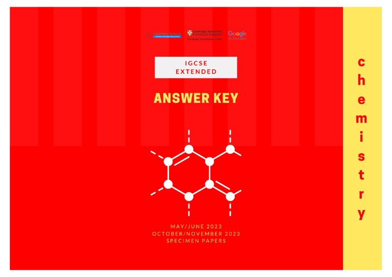 Cambridge IGCSE™ CHEMISTRY 0620/22 Paper 2 Multiple Choice (Extended) May/June 2023 MARK SCHEME Maximum Mark: 40 Published This mark scheme is published as an aid to teachers and candidates, to indicate the requirements of the examination. Mark schemes should be read in conjunction with the question paper and the Principal Examiner Report for Teachers. Cambridge International will not enter into discussions about these mark schemes. Cambridge International is publishing the mark schemes for the May/June 2023 series for most Cambridge IGCSE, Cambridge International A and AS Level and Cambridge Pre-U components, and some Cambridge O Level components. This document consists of 3 printed pages. © UCLES 2023 [Turn over 0620/22 Cambridge IGCSE – Mark Scheme PUBLISHED Question Answer May/June 2023 Marks 1 C 1 2 D 1 3 C 1 4 B 1 5 D 1 6 B 1 7 A 1 8 B 1 9 A 1 10 C 1 11 A 1 12 A 1 13 C 1 14 D 1 15 A 1 16 C 1 17 C 1 18 D 1 19 D 1 20 D 1 21 C 1 22 B 1 23 A 1 24 C 1 25 C 1 26 D 1 27 D 1 28 A 1 © UCLES 2023 Page 2 of 3 0620/22 Cambridge IGCSE – Mark Scheme PUBLISHED Question Answer May/June 2023 Marks 29 D 1 30 B 1 31 D 1 32 A 1 33 D 1 34 A 1 35 B 1 36 B 1 37 C 1 38 C 1 39 B 1 40 B 1 © UCLES 2023 Page 3 of 3 Cambridge IGCSE™ CHEMISTRY 0620/22 Paper 2 Multiple Choice (Extended) October/November 2023 MARK SCHEME Maximum Mark: 40 Published This mark scheme is published as an aid to teachers and candidates, to indicate the requirements of the examination. Mark schemes should be read in conjunction with the question paper and the Principal Examiner Report for Teachers. Cambridge International will not enter into discussions about these mark schemes. Cambridge International is publishing the mark schemes for the October/November 2023 series for most Cambridge IGCSE, Cambridge International A and AS Level components, and some Cambridge O Level components. This document consists of 3 printed pages. © UCLES 2023 [Turn over Cambridge IGCSE – Mark Scheme PUBLISHED 0620/22 Question Answer October/November 2023 Marks 1 D 1 2 C 1 3 D 1 4 B 1 5 B 1 6 B 1 7 B 1 8 A 1 9 A 1 10 C 1 11 B 1 12 D 1 13 A 1 14 A 1 15 A 1 16 D 1 17 D 1 18 D 1 19 D 1 20 B 1 21 C 1 22 B 1 23 A 1 24 C 1 25 B 1 26 A 1 27 D 1 28 D 1 © UCLES 2023 Page 2 of 3 Cambridge IGCSE – Mark Scheme PUBLISHED 0620/22 Question Answer October/November 2023 Marks 29 B 1 30 C 1 31 B 1 32 A 1 33 C 1 34 C 1 35 D 1 36 D 1 37 C 1 38 C 1 39 A 1 40 C 1 © UCLES 2023 Page 3 of 3 Cambridge IGCSE™ CHEMISTRY 0620/42 Paper 4 Theory (Extended) May/June 2023 MARK SCHEME Maximum Mark: 80 Published This mark scheme is published as an aid to teachers and candidates, to indicate the requirements of the examination. It shows the basis on which Examiners were instructed to award marks. It does not indicate the details of the discussions that took place at an Examiners’ meeting before marking began, which would have considered the acceptability of alternative answers. Mark schemes should be read in conjunction with the question paper and the Principal Examiner Report for Teachers. Cambridge International will not enter into discussions about these mark schemes. Cambridge International is publishing the mark schemes for the May/June 2023 series for most Cambridge IGCSE, Cambridge International A and AS Level and Cambridge Pre-U components, and some Cambridge O Level components. This document consists of 10 printed pages. © UCLES 2023 [Turn over 0620/42 Cambridge IGCSE – Mark Scheme PUBLISHED Generic Marking Principles May/June 2023 These general marking principles must be applied by all examiners when marking candidate answers. They should be applied alongside the specific content of the mark scheme or generic level descriptors for a question. Each question paper and mark scheme will also comply with these marking principles. GENERIC MARKING PRINCIPLE 1: Marks must be awarded in line with: the specific content of the mark scheme or the generic level descriptors for the question the specific skills defined in the mark scheme or in the generic level descriptors for the question the standard of response required by a candidate as exemplified by the standardisation scripts. GENERIC MARKING PRINCIPLE 2: Marks awarded are always whole marks (not half marks, or other fractions). GENERIC MARKING PRINCIPLE 3: Marks must be awarded positively: marks are awarded for correct/valid answers, as defined in the mark scheme. However, credit is given for valid answers which go beyond the scope of the syllabus and mark scheme, referring to your Team Leader as appropriate marks are awarded when candidates clearly demonstrate what they know and can do marks are not deducted for errors marks are not deducted for omissions answers should only be judged on the quality of spelling, punctuation and grammar when these features are specifically assessed by the question as indicated by the mark scheme. The meaning, however, should be unambiguous. GENERIC MARKING PRINCIPLE 4: Rules must be applied consistently, e.g. in situations where candidates have not followed instructions or in the application of generic level descriptors. © UCLES 2023 Page 2 of 10 0620/42 Cambridge IGCSE – Mark Scheme PUBLISHED May/June 2023 GENERIC MARKING PRINCIPLE 5: Marks should be awarded using the full range of marks defined in the mark scheme for the question (however; the use of the full mark range may be limited according to the quality of the candidate responses seen). GENERIC MARKING PRINCIPLE 6: Marks awarded are based solely on the requirements as defined in the mark scheme. Marks should not be awarded with grade thresholds or grade descriptors in mind. Science-Specific Marking Principles 1 Examiners should consider the context and scientific use of any keywords when awarding marks. Although keywords may be present, marks should not be awarded if the keywords are used incorrectly. 2 The examiner should not choose between contradictory statements given in the same question part, and credit should not be