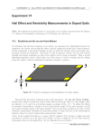EXPERIMENT 14. HALL EFFECT AND RESISTIVITY MEASUREMENTS IN DOPED GAAS 1 Experiment 14 Hall Effect and Resistivity Measurements in Doped GaAs Note: This laboratory manual is based on a manual for a very similiar experiment from the Physics 111 Advanced Undergraduate Laboratory at UC Berkeley (see references). 14.1 Resistivity and the van der Pauw Method To determine the electrical resistance of an object, one measures the relationship between two quantities: the current run through the object, and the voltage that arises due to that resistance. In this experiment, a four-probe technique is used, in which the current source and voltage measurement contacts are separated. One device is used to generate current, and run that current through the contact resistances as well as the resistor you’re trying to measure. Then a second high-input-impedance device, which draws very little current, is used to sample only the voltage across the resistor, without including the resistance of leads or contacts. 2 d 1 3 4 Figure 14.1: Contact arrangement and labelling for the GaAs sample. The particular four-probe technique used in this experiment - the van der Pauw method involves four contacts (connected to four leads) placed around the edge of a thin sample; these are labeled 1, 2, 3, and 4 in a clockwise manner, as shown in Fig. 14.1. To reduce the effects of unwanted thermoelectric voltages, all four leads should consist of the same material, and all four contacts should consist of the same material. The van der Pauw method is not only a useful resistivity measurement technique for materials research; it finds wide use in the semiconductor industry, where it is used to characterize semiconductor wafers. (Note: for the analysis that follows, we assume that the sample be thin, isotropic, simply connected, and that the contacts are at the edge of the sample, in order to apply the van der Pauw theorem; fortunately, these are all satisfied here. See the Appendix for more details.) Hall Effect and Resistivity 1 2 EXPERIMENT 14. HALL EFFECT AND RESISTIVITY MEASUREMENTS IN DOPED GAAS We start by defining the following parameters: ρ = sample resistivity d = sample thickness I12 = positive dc current I injected into contact 1 and taken out of contact 2 (likewise for I14 , I21 , and I41 ) V43 = dc voltage measured between contacts 4 and 3 (V4 − V3 ) (likewise for V23 , V34 , and V32 ) First consider the case where we drive the current I12 into contact 1 and out from contact 2, and measure the resulting voltage V43 between contacts 4 and 3. We can also reverse the polarity of the current (to I21 ) and measure the reversed voltage V34 . In addition, we may repeat for the remaining two values V23 and V32 . For each of these configurations of current flow and voltage measurement, we will obtain a value for the transresistance denoted as, for example, Rij,kl = Vkl /Iij . The four such transresistances that will be used for this experiment are: V43 V23 V34 V32 , R14,23 ≡ , R21,34 ≡ , R41,32 ≡ (14.1) I12 I14 I21 I41 From measurements of two such transresistances, the resistivity of the sample may then be determined by the van der Pauw equation, πd πd (14.2) exp − R12,43 + exp − R14,23 = 1. ρ ρ R12,43 ≡ A detailed derivation of this expression is shown in the Appendix. Note that the same relation – along with Equation 14.3 below – holds for the pair R21,34 and R41,32 . Further simplification of this expression (also shown in the Appendix) leads to an expression for the resistivity: R12,43 πd R12,43 + R14,23 ρ= , (14.3) ·f ln 2 2 R14,23 where the function f (x) satisfies the equation ln 2 1 x − 1 ln 2 exp − · cosh = . f (x) x + 1 f (x) 2 (14.4) This function f (x) does not have a closed-form analytic expression, and must be solved numerically for each value of x. However, for small x, an approximate expression f (x) ≈ 1/ cosh(ln(x)/2.403) may be used, with an error of less than 0.1% for x < 2.2 and less than 1% for x < 4.3. 14.2 The Hall coefficient In 1879, E. H. Hall reported a method for determining the sign of the charge carriers in a conductor, making use of the fact that the deflection of current flowing in a magnetic field – the Hall effect – has a direction which depends on the polarity of the moving charge. Much like van der Pauw resistivity measurements, Hall effect measurements are widely used for materials characterization both in research and in industry. But perhaps of far greater importance are the widespread uses of Hall sensors – devices employing the Hall effect to measure magnetic fields – in countless applications, from engine cylinder timing in vehicles to digital compasses in cellphones. In this experiment, the combination of Hall effect measurements with resistivity measurements will allow the sign, density, and mobility of the charge carriers in your sample to be determined, as well as how they depend on temperature and magnetic field. Hall Effect and Resistivity 2 EXPERIMENT 14. HALL EFFECT AND RESISTIVITY MEASUREMENTS IN DOPED GAAS 3 B w h+ EH z e- y d x l Figure 14.2: Schematic illustration of the Hall effect. ~ Consider an electrically conducting (or semiconducting) sample placed in a magnetic field B pointed in the ẑ direction. Suppose we pass a current through that sample perpendicular to the magnetic field in the x̂ direction. Then the free carriers in the sample experience a force F~ given by the Lorentz equation ~ , F~ = q ~v × B (14.5) where q is the charge of a carrier and v its velocity. This Lorentz force deflects free carriers towards the +ŷ direction, as shown in Figure 14.2. If the free carriers are electrons (q = −e), this results in an excess of negative charge on the +ŷ side of the sample. This charge distribution results in an ~ H pointing in the −ŷ direction, which both balances the Lorentz force (so as to keep electric field E ~ H across a sample current flowing along the x̂ direction) and yields a voltage difference VH = 