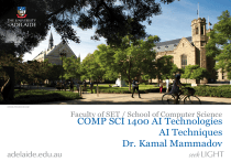 Faculty of SET / School of Computer Science COMP SCI 1400 AI Technologies AI Techniques Dr. Kamal Mammadov Review • Trend in AI • Agent • Narrow AI vs Generalised AI • Symbolic AI vs Connectionist AI University of Adelaide 2 Outline • Data Mining – Machine learning – Deep learning – Information retrieval • Classification and Clustering algorithms • Reasoning • Problem solving University of Adelaide 3 Data Mining University of Adelaide 4 What is Data Mining • Data mining is, in general terms, the extraction of information from data in various forms. • What can we do with data mining? ➢ Extract useful information from data sets. ➢ Discover meaningful correlations, patterns, and trends from data. University of Adelaide 5 Data Mining University of Adelaide 6 Data Mining • Data: raw un-interpreted facts – e.g. Tom, 20 years old, student • Information relates items of Data together – e.g. Tom is 20 years old • Knowledge relates items of Information together – Tom is 20 years old → Tom pays > $1500 car insurance • Modelling the world (= generalising) – [18 - 25] years old → P(accident) = high University of Adelaide 7 Fitting to the Business Case 1: insurance industry • Problem: AAMI insurance wanted a better and fairer way to work out premiums. • Approach: The Data Mining Research Group at the Faculty of IT, Monash University used more than 30,000 customer transactions in AAMI’s database to work out what characterized good and bad driver behavior. • Deployment: The company could use the discovered features to set fairer premiums. University of Adelaide 8 DM - Machine Learning • Supervised versus unsupervised learning. ➢ Supervised Learning • We have training data that is annotated with known target values (labelled). • The task is usually one of predicting the target values for new data: Classification and Regression. Test data Training data Label: cat cat dog dog ? ? Image: University of Adelaide 9 DM - Machine Learning • Supervised versus unsupervised learning. ➢ Supervised Learning • We have training data that is annotated with known target values (labelled). • The task is usually one of predicting the target values in new data: Classification and Regression. ➢ Classification: predict categorical (discrete) values. e.g., image classification ➢ Regression: predict numerical (continuous) values. e.g., stock price University of Adelaide 10 DM - Machine Learning • Unsupervised Learning – Our data is not annotated with any known target values (unlabeled). – Our task is usually learning the structure of the data. Training data Test data Image: University of Adelaide 11 DM - Machine Learning Typical Methods • Classifiers: – – – – – – – K-Nearest Neighbor Decision Tree Random Forest Naïve Bayes Support Vector Machine Neural Network …… • Clustering algorithms: – – – – – K-means DBSCAN Agglomerative Clustering Spectral Clustering …… University of Adelaide 12 DM - Deep Learning Artificial Neural Networks: • It is inspired by human brain which is composed of cells called neurons which are interconnected to form a massive network. • It is one of the earliest methods of AI, which attracted a lots of attention between the 1950's and 1980's due to their potential to automatically develop ways of solving problems, given appropriate training data. • Neural networks have gone through several phases of decline and resurgence. University of Adelaide 13 DM – Deep Learning • Neural network terms ➢ Neuron ➢ Connection ➢ Activation ➢ Layer • Neural network training ➢ Backpropagation ➢ … University of Adelaide 14 Activation functions The activation function must be some non-linear function. Examples of activation functions used include sigmoid, ReLu, leaky ReLu. The sigmoid function 𝜎 𝑥 used activation function. 1 = , is the most commonly 1+𝑒 −𝑥 The rate-of-change (derivative) of the activation function plays an essential role in backpropagation. University of Adelaide 15 Derivative of Sigmoid function 1 Derive the derivative of the sigmoid function 𝜎 𝑥 = . 1+𝑒 −𝑥 Hint: Recall the quotient rule for derivatives, for any ℎ 𝑥 = 𝑓(𝑥) , ℎ′ 𝑥 𝑔(𝑥) 𝑓 ′ 𝑥 𝑔 𝑥 −𝑔′ 𝑥 𝑓(𝑥) = 𝑔(𝑥)2 A. 𝜎 ′ 𝑥 = −𝜎 𝑥 B. 𝜎 ′ 𝑥 = 𝜎 −𝑥 1 C. 𝜎 ′ 𝑥 = 𝜎(𝑥) D. 𝜎 ′ 𝑥 = 𝜎(𝑥)(1 − 𝜎(𝑥)) University of Adelaide 16 DM - Deep Learning • • • • • • • • • Feed-Forward Neural Networks Convolutional Neural Networks Recurrent Networks Long/Short Term Memory Network Deep Belief Networks Auto-Encoders Generative Adversarial Network Variational Auto-Encoders … University of Adelaide 17 Universal Approximation Theorem for Arbitrary-Width Feedforward Networks The Universal Approximation Theorem states that a feedforward neural network with a single hidden layer, given enough neurons, can approximate any continuous function to any desired level of accuracy. This holds true provided the activation function used in the hidden layer is non-linear and bounded. Since the theorem guarantees that neural networks can approximate any continuous function, it means that neural networks can be applied to a vast range of problems across different domains. This includes tasks in image recognition, natural language processing, game playing, and more. University of Adelaide 18 Theorem (1) Consider a non-constant, bounded, and continuous activation function. Let 𝐾 be a compact subset of 𝑅𝑛 . For any continuous function 𝑓 that maps 𝐾 to 𝑅𝑚 and for any positive number ε, there exists a feedforward neural network with a single hidden layer, having a finite number of neurons in the hidden layer, weight matrices denoted by 𝑊 (of dimensions 𝑁 × 𝑛) and 𝑉 (of dimensions 𝑚 × 𝑁), and bias vector denoted by 𝑏 (of dimension 𝑁). The neural 