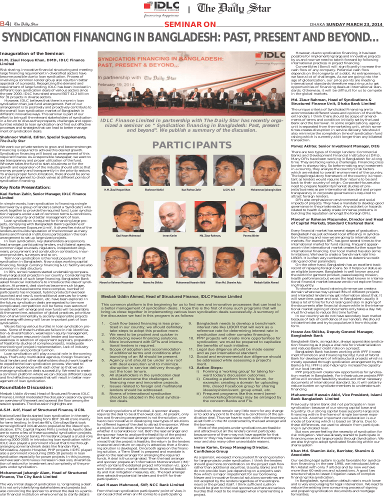 B4 SEMINAR ON DHAKA SUNDAY MARCH 23, 2014 SYNDICATION FINANCING IN BANGLADESH: PAST, PRESENT AND BEYOND… However, due to syndication financing, it has been possible for implementing large and innovative projects by us and now we need to take it forward by following international practices in project financing. Convertibles (Bond) will significantly increase the cash flow of any company. Potential cash flow depends on the longevity of a debt. As entrepreneurs, we face a lot of challenges. As we are going into the age of globalization, our price points are meeting international standards therefore requiring us to get opportunities of financing deals at international standards. Otherwise, it will be difficult for us to compete in the global markets. Inauguration of the Seminar: H.M. Ziaul Hoque Khan, DMD, IDLC Finance Limited Risk sharing, innovative financial structuring and meeting large financing requirement in diversified sectors have become possible due to loan syndication. Process of involving a common lender group also results in better appraisal of a projects. Recognizing the demand and requirement of large funding, IDLC has been involved in different loan syndication deals of various sectors since the year 2000. IDLC has raised around BDT 41.2 billion for 31 projects in diverse sectors. However, IDLC believes that there is more in loan syndication than just fund arrangement. Part of our arrangement is to positively and proactively contribute to the overall loan syndication market of Bangladesh in different innovative ways. This seminar is part of our effort to bring all the relevant stakeholders of syndication in a forum to discuss the prospects, challenges and opportunities related to loan syndication and find out effective processes and strategies that can lead to better management of syndication deals. Md. Ziaur Rahman, Head of Syndications & Structured Finance Unit, Dhaka Bank Limited IDLC Finance Limited in partnership with The Daily Star has recently organized a seminar on “ Syndication financing in Bangladesh: Past, present and beyond”. We publish a summary of the discussion. Shahnoor Wahid, Editor, Special Supplements, The Daily Star PARTICIPANTS We want our private sectors to grow and become stronger. Financing is required to achieve this desired growth. Syndication financing will boost up arrangement of this required finance. As a responsible newspaper, we want to see transparency and proper utilization of the fund. Whoever takes the fund to start a business or for the growth and expansion of the industry should utilize that money properly and transparently in the priority sectors. To ensure proper fund utilization, there should be some sort of arrangement to check valves at different points of syndication financing. Key Note Presentation: H.M. Ziaul Hoque Khan Shahnoor Wahid Kazi Farhan Zahir A.S.M. Arif Parvez Akhter, Senior Investment Manager, DEG Mohammad Jahangir Alam Kazi Farhan Zahir, Senior Manager, IDLC Finance Limited In simple words, loan syndication is financing a single borrower by a group of lenders (called a 'Syndicate') who work together to provide the required fund. Loan syndication happens under a set of common terms & conditions, common security and better management of loan. Loan syndication is required for financing large projects, complying with Bangladesh Bank's guideline of 'Single Borrower Exposure Limit'. It diversifies risks of the lenders and builds reputation of the borrower as many banks and financial institutions participate in the loan arrangement to set up large sized projects. In loan syndication, key stakeholders are sponsors, lead arranger, participating lenders, multilateral agencies, common legal counsels, regulators, independent engineers, procurement and construction contractors, insurance providers, surveyors and so on. Term loan syndication is the most popular form of syndication in Bangladesh. Now a days working capital financing, foreign currency financing & LC facility are also common in deal structure. In 90's, some investors started undertaking comparatively large sized projects in our country. Considering the risks potential of such large financing, Bangladesh Bank asked financial institutions to introduce the idea of syndication. At present, deal size has become much bigger, transactions have become more complex, number of participants has increased, hybrid products have been launched and new & nontraditional avenues for investment like tourism, aviation, etc. have been explored. In the future, syndication deals are expected to be more complicated, competition will be fierce, new sectors of investment will emerge and new funds will be available. At the same time, adoption of global practices, prioritization of environmentally & socially responsible projects and energy efficiency will be an important part of loan syndication. We are facing various hurdles in loan syndication process. Some of these hurdles are failure in risk identification & diversification, weakness in equity management, lack of human resource in both lender and borrower, weakness in selection of equipment suppliers, preparation of feasibility studies of complex projects, inadequate monitoring of project implementation, lack of industry information and political turmoil. Loan syndication will play a crucial role in the coming days. That's why multilateral agencies, foreign financiers, local lenders and other stakeholders should work together to expedite the loan syndication process. We need to share our experiences with each other so that we can manage syndication deals successfully. We need to create a common platform where we can discuss different issues and find effective processes that will result in better management of loan syndication. Maroof ur Rahman Mazumder Muhammad Hasnain Abid Khan Md. Shamim Aziz Parvez Akhter Mesbah Uddin Ahmed This common platform is the beginning for us to find new and innovative processes that can lead to a better ma