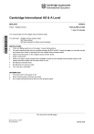 Cambridge International AS & A Level BIOLOGY 9700/12 Paper 1 Multiple Choice February/March 2023 1 hour 15 minutes You must answer on the multiple choice answer sheet. *8506119059* You will need: Multiple choice answer sheet Soft clean eraser Soft pencil (type B or HB is recommended) INSTRUCTIONS There are forty questions on this paper. Answer all questions. For each question there are four possible answers A, B, C and D. Choose the one you consider correct and record your choice in soft pencil on the multiple choice answer sheet. Follow the instructions on the multiple choice answer sheet. Write in soft pencil. Write your name, centre number and candidate number on the multiple choice answer sheet in the spaces provided unless this has been done for you. Do not use correction fluid. Do not write on any bar codes. You may use a calculator. INFORMATION The total mark for this paper is 40. Each correct answer will score one mark. Any rough working should be done on this question paper. This document has 16 pages. IB23 03_9700_12/4RP © UCLES 2023 [Turn over 2 1 The photomicrograph shows cells from a human blood smear. neutrophil P Q Which calculation shows a correct method to calculate the actual diameter of the neutrophil shown in the photomicrograph in micrometres (m)? 2 A length of line PQ in mm 1000 magnification of photomicrograph B length of line PQ in mm 10 000 magnification of photomicrograph C magnification of photomicrograph length of line PQ in mm 1000 D magnification of photomicrograph length of line PQ in mm 10 000 A student calibrated an eyepiece graticule using a stage micrometer. Each division of the stage micrometer was 0.01 mm. With a 10 magnification objective lens, 10 eyepiece graticule units matched 10 divisions on the stage micrometer. The same microscope was used with a 40, instead of a 10, magnification objective lens to measure the diameter of an alveolus. The diameter of the alveolus was found to be 96 eyepiece graticule units. The eyepiece lens was not changed. What is the best estimate for the diameter of the alveolus? A 0.960 mm © UCLES 2023 B 3.84 mm C 240 m 9700/12/F/M/23 D 384 m 3 3 4 Which statements are correct for chloroplasts and also for mitochondria? 1 They contain 80S ribosomes. 2 They can transcribe their circular DNA. 3 They can translate mRNA. 4 They are enclosed by double membranes. A 1, 2, 3 and 4 B 1 and 2 only C 2, 3 and 4 only D 3 and 4 only The electron micrograph shows some cells from a root. Which cell structure is not usually found in cells from a root? A D B C © UCLES 2023 9700/12/F/M/23 [Turn over 4 5 Dialysis (Visking) tubing is an artificial partially permeable membrane with pore sizes of approximately 2.5 nm. Glucose molecules have a diameter of about 1.5 nm and can pass through the pores in the membrane. What else can pass through the pores? A 6 7 1 bacteria 2 haemoglobin 3 ribosomes 4 fructose 1 and 3 B 2 and 4 C 2 only D 4 only What is present in all viruses? A ribose B deoxyribose C adenine D thymine To estimate the concentration of glucose in an unknown solution, equal volumes of a range of known concentrations of glucose were each mixed with the same excess volume of Benedict’s solution. After mixing, the solutions were placed in a thermostatically controlled water-bath at 90 C for three minutes. The unknown solution was then treated in the same way and the colours of the known and unknown solutions compared. What is the independent variable in this procedure? 8 A concentration of glucose B final colour of solutions C temperature of water-bath D volume of glucose solutions Which statements are correct for amylose and also for amylopectin? A 1 They are carbohydrate molecules. 2 They are formed by condensation reactions. 3 They are linear molecules. 4 They contain -1,4 glycosidic bonds. 1, 2 and 3 © UCLES 2023 B 1, 2 and 4 C 1, 3 and 4 9700/12/F/M/23 D 2, 3 and 4 5 9 Which statement is a correct comparison between saturated triglyceride molecules and unsaturated triglyceride molecules of approximately the same molecular masses? A Unsaturated triglycerides have more double bonds and fewer hydrogen atoms than saturated triglycerides. B Unsaturated triglycerides have fewer double bonds and fewer hydrogen atoms than saturated triglycerides. C Unsaturated triglycerides have more double bonds and more hydrogen atoms than saturated triglycerides. D Unsaturated triglycerides have fewer double bonds and more hydrogen atoms than saturated triglycerides. 10 The diagram represents a molecule from a cell surface membrane. A D B C Which description of one of the labels is correct? A fatty acid at the hydrophilic end of the molecule B hydrophobic end of the triglyceride molecule C hydrophobic end of the glycerol molecule D phosphate group at the hydrophilic end of the molecule 11 Which row correctly shows levels of protein structure that can be held together by each type of interaction? hydrogen bonds hydrophobic interactions covalent bonds A primary, secondary and tertiary structure tertiary structure primary and tertiary structure B secondary structure primary and tertiary structure tertiary structure C secondary and tertiary structure tertiary structure primary and tertiary structure D secondary and tertiary structure tertiary structure primary and secondary structure © UCLES 2023 9700/12/F/M/23 [Turn over 6 12 Which molecules contain at least three double bonds? saturated triglyceride C A D collagen haemoglobin B 13 Which diagram correctly shows hydrogen bonding between two water molecules? A B + + H H O– H + H H O– H O δ– H δ+ + C δ+ δ+ H δ+ D δ– δ– H O H O δ– δ+ H δ– – – H H O O+ δ+ H δ– H – O+ H – 14 Which statement describes an example of an extracellular enzyme? A Amylase in saliva is an enzyme that catalyses the breakdown of starch in the mouth. B Carbonic anhydrase is an enzyme that helps in the transport of carbon dioxide in blood. C DNA polymerase is an enzyme that helps build DNA molecules 