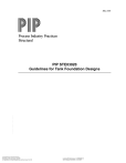 May 2005 Process Industry Practices Structural PIP STE03020 Guidelines for Tank Foundation Designs --``,,,,`,`,```,,,,````,,``,,,,-`-`,,`,,`,`,,`--- Copyright Process Industry Practices Provided by IHS under license with PIP No reproduction or networking permitted without license from IHS Licensee=Bechtel Corp Loc 1-19/9999056100 Not for Resale, 08/09/2006 12:30:20 MDT In an effort to minimize the cost of process industry facilities, this Practice has been prepared from the technical requirements in the existing standards of major industrial users, contractors, or standards organizations. By harmonizing these technical requirements into a single set of Practices, administrative, application, and engineering costs to both the purchaser and the manufacturer should be reduced. While this Practice is expected to incorporate the majority of requirements of most users, individual applications may involve requirements that will be appended to and take precedence over this Practice. Determinations concerning fitness for purpose and particular matters or application of the Practice to particular project or engineering situations should not be made solely on information contained in these materials. The use of trade names from time to time should not be viewed as an expression of preference but rather recognized as normal usage in the trade. Other brands having the same specifications are equally correct and may be substituted for those named. All Practices or guidelines are intended to be consistent with applicable laws and regulations including OSHA requirements. To the extent these Practices or guidelines should conflict with OSHA or other applicable laws or regulations, such laws or regulations must be followed. Consult an appropriate professional before applying or acting on any material contained in or suggested by the Practice. This Practice is subject to revision at any time by the responsible Function Team and will be reviewed every 5 years. This Practice will be revised, reaffirmed, or withdrawn. Information on whether this Practice has been revised may be found at www.pip.org. O Process Industry Practices (PIP), Construction Industry Institute, The University of Texas at Austin, 3925 West Braker Lane (R4500), Austin, Texas 78759. PIP member companies and subscribers may copy this Practice for their internal use. Changes, overlays, addenda, or modifications of any kind are not permitted within any PIP Practice without the express written authorization of PIP. PIP will not consider requests for interpretations (inquiries) for this Practice. Not printed with Stute finds Copyright Process Industry Practices Provided by IHS under license with PIP No reproduction or networking permitted without license from IHS Licensee=Bechtel Corp Loc 1-19/9999056100 Not for Resale, 08/09/2006 12:30:20 MDT --``,,,,`,`,```,,,,````,,``,,,,-`-`,,`,,`,`,,`--- PURPOSE AND USE OF PROCESS INDUSTRY PRACTICES May 2005 Process Industry Practices Structural PIP STE03020 Guidelines for Tank Foundation Designs Table of Contents 1. Introduction .................................. 2 1.1 Purpose ............................................. 1.2 Scope ................................................. 2 2 2 . References.................................... 2 2.1 Process Industry Practices ................ 2 2.2 Industry Codes and Standards .......... 2 2.3 Other References .............................. 3 3. Definitions .................................... 3 4 . General Design Considerations .3 4.1 Differential Settlement Tank Bottom Designs .............................................. 3 4.2 Load Types and Applications ............. 5 4.3 Foundation Type Selection ................ 7 5. Foundation Types Design .......................... Configurations . 11 Concrete Ringwall............................ 11 Crushed Stone Ringwall .................. 12 Concrete Slab Foundation ............... 12 Compacted Granular Fill Foundation ....................................... 12 5.5 Pile-Supported Concrete Foundation ....................................... 13 5.6 Ringwall Foundation Design Procedures ...................................... 14 5.1 5.2 5.3 5.4 6. Special Design Considerations 21 API 650 Tolerances ......................... 21 Bottom Support Pad ........................ 22 Hot Tanks ........................................ 24 Small Tanks ..................................... 31 Berms and Gutters .......................... 33 Grounding and Cathodic Protection. 33 Secondary Containment and Leak Detection Systems ........................... 33 6.8 Tank Settlement .............................. 35 6.1 6.2 6.3 6.4 6.5 6.6 6.7 7. Tank Hydrotest........................... Appendix A .Ringwall Foundation 47 Design Examples ..................... Example 1 . EI Segundo. California ........ 48 Final Design . Example 1 ........................ 52 Example 2 . Corpus Christi. Texas ......... 53 Final Design . Example 2 ........................ 56 Appendix B . Hot Tanks ............... 57 Appendix C . Tank Settlement ..... 69 Page 1 of 81 Process Industry Practices --``,,,,`,`,```,,,,````,,``,,,,-`-`,,`,,`,`,,`--- Copyright Process Industry Practices Provided by IHS under license with PIP No reproduction or networking permitted without license from IHS 45 Licensee=Bechtel Corp Loc 1-19/9999056100 Not for Resale, 08/09/2006 12:30:20 MDT PIP STEO3020 Guidelines for Tank Foundation Designs 1. May 2005 Introduction 1.1 Purpose This Practice provides guidance for the design of tank foundations. 1.2 Scope This Practice describes the guidelines for design and construction of nonrefrigerated, aboveground storage tank foundations. Applicable industry specifications are referenced, and the data required to determine the most appropriate foundation for a tank are presented. In addition, this Practice addresses tank foundations preferred for the different types of soil conditions. This Practice also includes information on settlement and releveling a