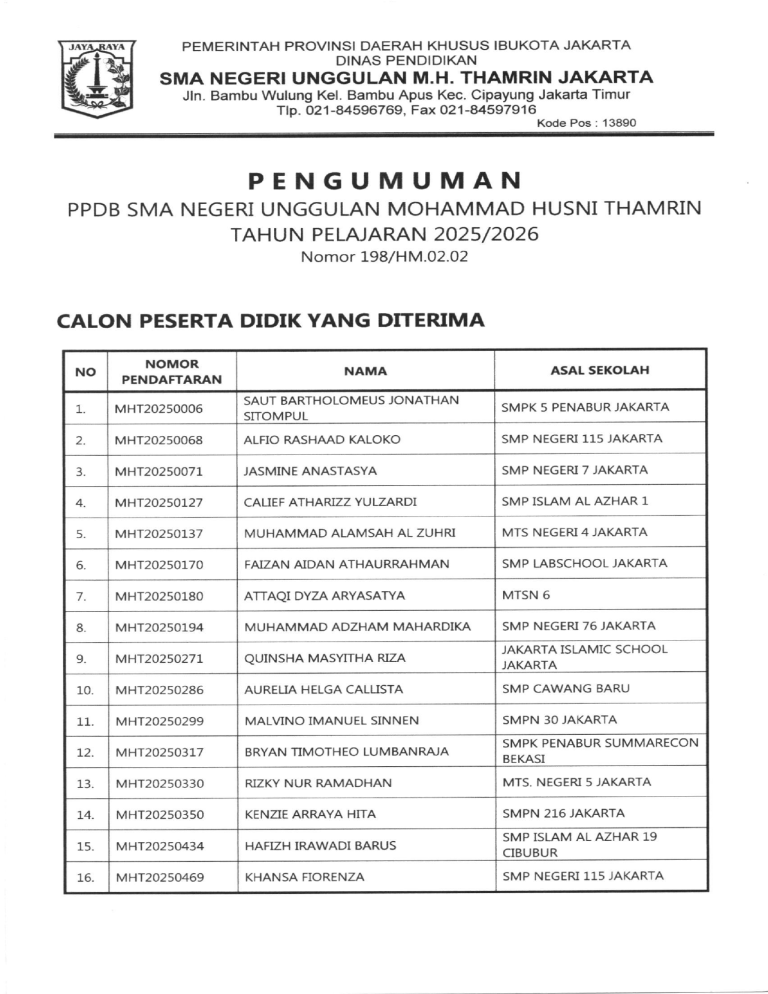 PEMERINTAH PROVINSI DAERAH KHUSUS IBUKOTA JAKARTA DINAS PENDIDIKAN SMA NEGERI UNGGULAN M.H. THAMRIN JAKARTA Jln. Bambu Wulung Kel. Bambu Apus Kec. Cipayung Jakarta Timur Tlp. 021-84596769, Fax 021-84597916Kode pos: 138e0 PENGUMUMAN PPDB SMA NEGERI UNGGULAN MOHAMMAD HUSNI THAMRIN TAHU N PELAJARAN 2025/2026 Nomor 198/HM.02.02 CALON PESERTA DIDIK YANG DITERIMA NO NOMOR PENDAFTARAN 1 MHT20250006 2 MHT20250068 ALFIO RASHAAD KALOKO SMP NEGERI 115jAKARTA 3 MHT20250071 JASMINE ANASTASYA SMP NEGERI 7 JAKARTA 4 MHr20250727 CAUEF ATHARIZZ YULZARDI SMP ISLAM AL AZHAR 1 5. MHT20250137 MUHAMMAD ALAMSAH AL ZUHRI MTS NEGERI4JAKARTA 6 MHT20250170 FAIZAN A]DAN ATHAURRAHMAN SMP LABSCHOOL JAKARTA 7 MHT20250180 ATTAQI DYZA ARYASATYA MTSN 6 8 MHT20250194 MUHAMMAD ADZHAM MAHARDIKA SMP NEGERI 76 JAKARTA o MHr20250277 QUINSHA MASYfiHA RIZA r-0. MHT20250286 AUREUA HELGA CALUSTA SMP CAWANG BARU 11 MHr20250299 MALVINO IMANUEL SINNEN SMPN 30 JAKARTA 12 MHT20250317 BRYAN TIMOTHEO LUMBANRA'A 13 MHT20250330 RIZKY NUR RAMADHAN MTS. NEGERI 5 JAKARTA L4 MHT20250350 KENZE ARRAYA HITA SMPN 2].6 JAKARTA 15. MHT20250434 HAFZH IRAWADI BARUS 16. MHT20250469 KHANSA FIORENZA NAMA SAUT BARTHOLOMEUS JONATHAN SITOMPUL ASAL SEKOLAH SMPK 5 PENABUR JAKARTA JAKARTA ISLAMIC SCHOOL JAKARTA SMPK PENABUR SUMMARECON BEKASI SMP ISLAM AL AZHAR 19 CIBUBUR SMP NEGERI 115 JAKARTA NO NOMOR PENDAFTARAN L7. NAMA ASAL SEKOLAH MHr20250476 JIERA MAZAYA QUEEN SMP NEGERI 89 JAKARTA 18 MHT20250485 SAYYID MUFID SMPN 216 JAKARTA 19. MHT20250496 JORDAN ANDREAS SIMARMATA SMP NOAH 20 MHT20250500 2L. MHr202505M HAYFA ZULFA KIRANI 22 MHT20250561 NAJLA' HITANA DERMAWAN SMPN 2]-6 JAKARTA MHT20250593 NAILA RAISHA MULYANTO PUTRI MTSN 7 JAKARTA 24 MHT20250609 NABIL PRADANA RAMADITYA SIREGAR SMP LABSCHOOL CIBUBUR 7q MHT20250614 CAHAYA CINTA AULIA MTSN 4 JAKARTA 26 MHT20250631 PUAN BATRISYI,A AIMEE YUTRTA PRIHARMOKO SMP LABSCHOOL JAKARTA 21 MHT20250665 HANI,A BENIKA PUTRIMULIA SMP LABSCHOOL JAKARTA 28. MHT20250682 KALYCA MANOPO SMP NEGERI 213 JAKARTA 29 MHT20250700 SM AAFIYAH FTTRI SMP NEGERI 16], JAKARTA 30. MHT202507r-9 SYAKKAR QALBUNSALAM SMP NEGERI 43 JAKARTA 31. MHT202,0726 CHARLOVE AQILAH SMP LABSCHOOL JAKARTA 32. MHT20250746 MUSYAFFA'BALGIS 33. MHT20250760 KEVIN PARDOMUAN SABINO GULTOM SMPN 115 JAKARTA 34 MHT20250794 MUHAMMAD KIYAN ARSAU SMP LABSCHOOL KEEAYORAN 35. MHT20250848 RASYID FIRDAUS SMPN T6)AKARTA 36. MHT20250867 FATHIR MUHAMMAD AZKA SMP JAKARTA ISLAMIC SCHOOL 37. MHT20250954 AZZA ZRA ARFA SMPN 142 JAKARTA 38. MHT2025096s LUTHFIYYAH AZZAHRA SMP NEGERI 275 JAKARTA 39. MHT20250983 ANGKASA DEWA PURNAMA SMPN 147 JAKARTA 40 MHT20250985 DESI FITRTA WAHIDAH SMP NEGERI 114 JAKARTA 4t. MHT20251000 IFTITAH HAYATI NAFISAH SMP NEGERI 40 SSN 42 MHT20251002 HANUM WIJAYA SMPN 179 JAKARTA MUHAMMAD CHANNIEL ROSHAN SYARKAWI SMPK IV PENABUR JAKARTA SMP NEGERI 85 JAKARTA SELATAN SMP ISLAM AL AZHAR 19 CIBUBUR NO NOMOR PENDAFTARAN 43. MHT20251012 ZIV OCTARA PARMONANG SIRAIT SMPN 235 JAKARTA 44 MHT20251013 ACHMAD ZACKY PRATAMA SMPN ]-79 JAKARTA 45. MHT20251034 AMANDA LIA PUTRI SUBANDI SMPN 235 JAKARTA 46 MHT20251088 RAYNATHA FLORENCE SiNAGA SMPN 134 JAKARTA 47 MHT20251125 ACITYA PARAM ESTHI N USWANTARI 48 M HT20251133 ARYASATYA DAMAR WCAKSONO 49. MHT20251154 REZA ALFARIDHO SMP NEGERI 252 JAKARTA 50 MHT20251163 ALYA MAUUDINA SMP NEGERI40 SSN 51. MHT20251187 52. MHr20251792 HAFIDZ RASYA PUTRA PERMANA SMP PRIBADI DEPOK 53. MHr2025t2L7 ALMAIRA AUFANIDA FALIHANTA SMP LABSCHOOL JAKARTA NAMA HEZEKIEL PRYSTER HALOMOAN ASAL SEKOLAH PANGUDI LUHUR JAKARTA SELATAN SMP ISLAM AL AZHAR 2 PUATEN SMP NEGERI 41 JAKARTA SAGALA MTSS MILBOS (MAGHFIRAH 54 MHr20257257 ALVIS ALryAN MULIA ISLAMIC LEADERSHIP BOARDING SCHOOL) 55. MHT20251320 KHANZA NAYYARA AQILA DANISH SMPN ]-].5 JAKARTA SELATAN 56. MHT20251336 AXELCIS PEDRO PRABASWARA SMP NOAH 57 MHT2025r-388 EVAN YOSAFAT SMP NEGERI 9 JAKARTA 58 N4HT20251392 ABDULLAH HADI PURNANTO SMPN 45 JAKARTA 59 MHr20251.406 DEANDRA ALKAYRA RAMADHANIPUTRI SMP NEGERI 45 JAKARTA 60 MHT20251408 NAILA NASYWA SYIFA SMP FNRAH ISLAMIC WORLD ACADEMY 61 MHr2025t426 MAYLAFFATHIYA ALYA MUMTAZAH SMP LABSCHOOL JAKARTA 62 MHr20251.528 MUHAMAD IBRAM SMP NEGERI 265 JAKARTA 63. MHT20251539 MUHAMMAD FAREL MTSN 5 JAKARTA 64. MHT20251ss5 MUTIA INDRI,ATI MTS N 5 JAKARTA 65. MHr2025L5t2 RISTA FAUHAH SMPN 257 JAKARTA 66. MHT20251597 ACHMAD FACHRII ARUNDAYA MTSN 40 JAKARTA BARAT 67. MHT20251599 MUHAMMAD RHEWAN IBRAHIM SMP NEGERI 20 JAKARTA 68. MHT20257607 GENDIS AYU NOWA TUNGGAL DEWI SMPN 78 JAKARTA NO NOMOR PENDAFTARAN 69. MHT202s1.647 70 MHT20251659 7L NAMA TIYASA TISTI WIDYADHANA PRASTOWO ASAL SEKOLAH SMP NEGERI ]-39 JAKARTA LUTHFAH GALBIENA NADHIRA SMPI AL AZHAR 1 KEBAYORAN DAMANIK BARU MHr20257675 ARISTA KAMIL WARDANI SMP NEGRI 86 JAKARTA 12 MHT20251730 RADEN YUSUF AKIRA MUMTAZ SMPN 1],5 JAKARTA t5 MHT2025T761 ABDUL MAZID RIFANI SMP NEGERI 3 ]AKARTA 74 MHr2025L795 TSABITA NURUL ALIA 75 MHT202518r-1 SYAKIRA SHAUHA JANNAH SMP LABSCHOOL KEBAYORAN 76 MHT20251893 RUDOLF GANDA TANU SMP NEGERI 169 JAKARTA 77 MHT20251898 RORO RENGGANIS LAKEISHA SMPN 98 JAKARTA 18. MHT20251954 MENTARI MELiNDA TRI HABSARI SMP NEGERI 184 19. MHT20251965 RAVEL DAKARI NARARYA SMPN 1],5 JAKARTA 80 MHT20251969 PRAMA WUAYA SMP NEGERI 252 JAKARTA SMP ISLAM TERPADU NURUL FIKN BOGOR CADANGAN NO NOMOR PENDAFTARAN NAMA ASAL SEKOLAH 1. MHr2025L769 PRAWIRAYUDHA ABISETHA PRAMONO MTS NEGERI 6 JAKARTA 2. MHT20250672 MUHAMMAD RAQILLA PRATISENA SMPN I15 JAKARTA 3 MHT20250456 AHMAD DZAKY ARDHANI SMP NEGERI 49 JAKARTA 4 MHr202504L1 RAFFA SYAHRIZA SMPN 49 JAKARTA 5 MHr2025tt26 ATHAYA POIRA]A BASYIR KIAT SMPN 85 JAKARTA 6 MHT20250651 QAR]RA ZALFA RAYSAUMA SMPI AL AZHAR 19 CIBUBUR 7 MHr20250519 FAIZA NAURA RAMADHANI SMPN 88 8 MHT20250014 DIAN DRA ALMAIIKA SU RYANTO SMP LABSCHOOL ]AKARTA Catatan : A. Bagi calon peserta didik yang telah dinyatakan diterima wajib melakukan Lapor Diri secara daring (tanggal24 s.d.25 Februari 2025) dengan cara sebagai berikut : 1. Mengakses laman http://ppdbsmanumhtjakarta.go.id; 2. Melakukan login deng