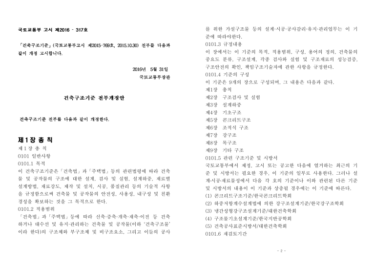 ­ 를 위한 가설구조물 등의 설계·시공·공사감리·유지·관리업무는 이 기 준에 따라야한다. 0101.3 규정내용 이 장에서는 이 기준의 목적, 적용범위, 구성, 용어의 정의, 건축물의 중요도 분류, 구조설계, 각종 검사와 실험 및 구조재료의 성능검증, 구조안전의 확인, 책임구조기술자에 관한 사항을 규정한다. 0101.4 기준의 구성 이 기준은 9개의 장으로 구성되며, 그 내용은 다음과 같다. 제1장 총칙 제2장 구조검사 및 실험 제3장 설계하중 제4장 기초구조 제5장 콘크리트구조 제6장 조적식 구조 제1장 총 칙 제7장 강구조 제8장 목구조 제1장 총 칙 제9장 기타 구조 0101 일반사항 0101.5 관련 구조기준 및 시방서 0101.1 목적 국토교통부에서 제정, 고시 또는 공고한 다음에 열거하는 최근의 기 이 건축구조기준은「건축법」과「주택법」등의 관련법령에 따라 건축 준 및 시방서는 필요한 경우, 이 기준의 일부로 사용한다. 그러나 설 물 및 공작물의 구조에 대한 설계, 검사 및 실험, 설계하중, 재료별 계․시공․재료물성에서 다음 각 호의 기준이나 이와 관련된 다른 기준 설계방법, 재료강도, 제작 및 설치, 시공, 품질관리 등의 기술적 사항 및 시방서의 내용이 이 기준과 상충될 경우에는 이 기준에 따른다. 을 규정함으로써 건축물 및 공작물의 안전성, 사용성, 내구성 및 친환 (1) 콘크리트구조기준/한국콘크리트학회 경성을 확보하는 것을 그 목적으로 한다. (2) 하중저항계수설계법에 의한 강구조설계기준/한국강구조학회 0101.2 적용범위 (3) 냉간성형강구조설계기준/대한건축학회 「건축법」과「주택법」등에 따라 신축·증축·개축·재축·이전 등 건축 (4) 구조물기초설계기준/한국지반공학회 하거나 대수선 및 유지·관리하는 건축물 및 공작물(이하 ‘건축구조물’ (5) 건축공사표준시방서/대한건축학회 이라 한다)의 구조체와 부구조체 및 비구조요소, 그리고 이들의 공사 0101.6 재검토기간 - 2 - 국토교통부장관은「훈령·예규 등의 발령 및 관리에 관한 규정」에 따 과 이에 부수되는 시설물, 지하 또는 고가의 공작물에 설치하는 사무 라 이 기준에 대하여 2016년 1월 1일을 기준으로 매 3년이 되는 시 소·공연장·점포·차고·창고 기타「건축법」이 정하는 것 점(매 3년째의 12월 31일까지를 말한다)마다 그 타당성을 검토하여 건축비구조요소: 건축구조물을 구성하는 부재중에서 구조내력을 부 개선 등의 조치를 하여야 한다. 담하지 않는 구성요소. 배기구, 부가물·장식물, 부착물, 비구조벽체, 0102 용어의 정의 악세스플로어(이중바닥), 유리·외주벽, 천장, 칸막이, 캐비닛, 파라펫, 이 기준에서 사용하는 용어의 뜻은 다음과 같다. 표면마감재, 표지판·광고판 등을 포함한다.(<표0306.10.1>참조) 가설구조물:건축구조물의 축조를 위하여 임시로 설치하는 시설 또는 계수하중:강도설계법 또는 한계상태설계법으로 설계할 때 사용하중 구조물. 가설공연장․가설전람회장․견본주택 등 가설건축물을 포함한다. 에 하중계수를 곱한 하중 감쇠:구조물이 진동할 때 진동에너지가 다른 형태로 변환되어 소산 계획설계:구조체에 대한 구조기준, 사용재료강도, 설계하중을 결정하 됨으로써 진폭이 작아지는 현상 고 구조형식을 선정하여 구조개념도와 주요 구조부재의 크기·단면·위 강도:구조물이나 구조부재가 외력에 의해 발생하는 힘 또는 모멘트 치를 표현한 구조평면도 작성까지 기본설계 전 단계의 일련의 초기설 에 저항하는 능력 계과정의 일 강도감소계수:재료의 공칭강도와 실제강도의 차이, 부재를 제작 또 골조해석:구조설계의 한 과정으로 해당 구조체가 하중 등 외력에 반 는 시공할 때 설계도와 완성된 부재의 차이, 그리고 내력의 추정과 응할 때 구조공학의 이론을 이용하여 그 구조체의 각 구성요소에 생 해석에 관련된 불확실성을 고려하기 위한 안전계수 기는 부재력과 변위의 값 및 지점에서의 반력값을 찾아내는 일 강도설계법:구조부재를 구성하는 재료의 비탄성거동을 고려하여 산 공사시방서(구조분야):구조분야 공사에 관한 시방서 정한 부재단면의 공칭강도에 강도감소계수를 곱한 설계용 강도의 값 공작물 : 인공적으로 지반에 고정하여 설치한 물체 중 건축물을 제외 (설계강도)과 계수하중에 의한 부재력(소요강도)이상이 되도록 구조부 한 것. 계단탑, 교통신호등·교통표지판 등 교통관제시설, 광고판, 광고 재를 설계하는 방법. 탑, 고가수조, 굴뚝, 기계기초, 기념탑, 기계식주차장, 기름탱크, 냉각 강성:구조물이나 구조부재의 변형에 대한 저항능력을 말하며, 발생 탑, 방음벽, 배관지지대, 보일러구조, 사일로 및 벙커, 송전지지물, 송 한 변위 또는 회전에 대한 적용된 힘 또는 모멘트의 비율 전탑, 승강기탑, 옥외광고물, 옹벽, 우수저류조, 육교, 장식탑, 저수조. 건설가치공학:건축공사의 기획·설계·시공·유지관리·해체 등 일련의 전철지지물, 조형물, 지하대피호, 철탑, 플랜트구조, 항공관제탑, 항행 과정에서 최저 비용으로 최대의 가치를 창출하기 위하여 여러 기능을 안전시설, 기타 구조물을 포함한다. 분석하여 개선해 가는 조직적 활동(“밸류엔지니어링” 또는 “V.E.(브 공칭강도:구조체나 구