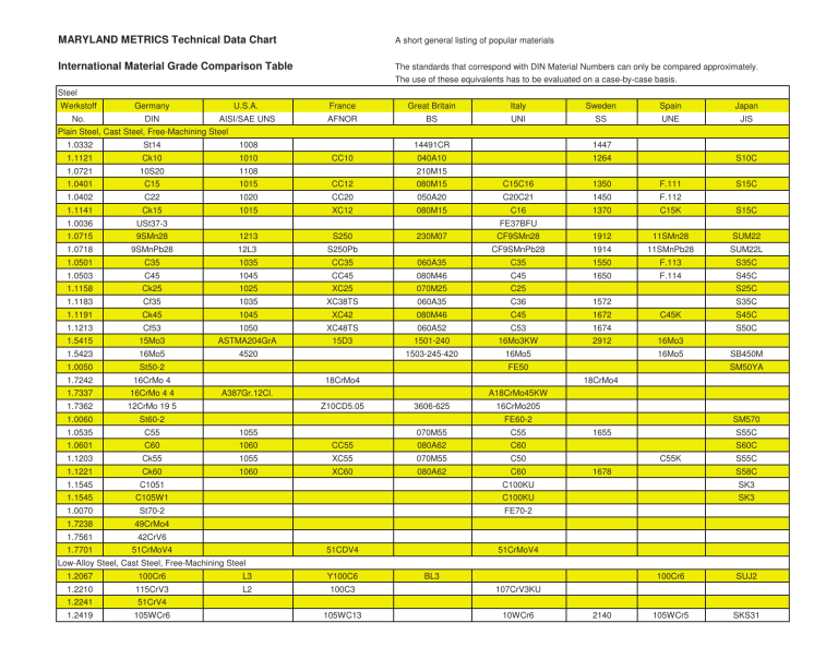 MARYLAND METRICS Technical Data Chart A short general listing of popular materials International Material Grade Comparison Table The standards that correspond with DIN Material Numbers can only be compared approximately. The use of these equivalents has to be evaluated on a case-by-case basis. Steel Werkstoff Germany U.S.A. France Great Britain Italy Sweden Spain Japan No. DIN AISI/SAE UNS AFNOR BS UNI SS UNE JIS Plain Steel, Cast Steel, Free-Machining Steel 1.0332 St14 1008 CC10 14491CR 1447 040A10 1264 1.1121 Ck10 1010 1.0721 10S20 1108 1.0401 C15 1015 CC12 080M15 C15C16 1350 F.111 1.0402 C22 1020 CC20 050A20 C20C21 1450 F.112 1.1141 Ck15 1015 XC12 080M15 C16 1370 C15K 1.0036 USt37-3 9SMn28 1213 S250 1.0718 9SMnPb28 12L3 S250Pb 1.0501 C35 1035 CC35 1.0503 C45 1045 CC45 1.1158 Ck25 1025 XC25 070M25 C25 230M07 CF9SMn28 1912 11SMn28 SUM22 1914 11SMnPb28 SUM22L 060A35 C35 1550 F.113 S35C 080M46 C45 1650 F.114 Cf35 1035 XC38TS 060A35 C36 1572 Ck45 1045 XC42 080M46 C45 1672 1.1213 Cf53 1050 XC48TS 060A52 C53 1674 1.5415 15Mo3 ASTMA204GrA 15D3 1501-240 16Mo3KW 2912 1.5423 16Mo5 4520 1503-245-420 16Mo5 1.0050 St50-2 16CrMo 4 S35C C45K S45C S50C 16Mo3 16Mo5 FE50 18CrMo4 S45C S25C 1.1191 16CrMo 4 4 S15C CF9SMnPb28 1.1183 1.7242 S15C FE37BFU 1.0715 1.7337 S10C 210M15 SB450M SM50YA 18CrMo4 A387Gr.12Cl. A18CrMo45KW 1.7362 12CrMo 19 5 1.0060 St60-2 1.0535 C55 1055 1.0601 C60 1060 1.1203 Ck55 1055 1.1221 Ck60 1060 1.1545 C1051 C100KU SK3 1.1545 C105W1 C100KU SK3 1.0070 St70-2 FE70-2 1.7238 49CrMo4 1.7561 42CrV6 1.7701 51CrMoV4 Z10CD5.05 3606-625 16CrMo205 FE60-2 070M55 C55 CC55 080A62 C60 XC55 070M55 C50 XC60 080A62 51CDV4 C60 SM570 1655 S55C S60C C55K 1678 S55C S58C 51CrMoV4 Low-Alloy Steel, Cast Steel, Free-Machining Steel 1.2067 100Cr6 L3 Y100C6 L2 100C3 107CrV3KU 105WC13 10WCr6 1.2210 115CrV3 1.2241 51CrV4 1.2419 105WCr6 BL3 2140 100Cr6 SUJ2 105WCr5 SKS31 Werkstoff Germany U.S.A. France Great Britain Italy Sweden Spain No. DIN AISI/SAE UNS AFNOR BS UNI SS UNE 1.2419 105WCr6 105WC13 1.2542 45WCrV7 S1 1.2550 60WCrV7 S1 55WC20 1.2713 55NiCrMoV6 L6 55NCDV7 1.2721 50NiCr13 1.2762 75CrMoNiW67 1.2762 75CrMoNiW67 1.2842 90MnCrV8 107WCr5KU BS1 2710 58WCr9KU ~2710 F.520.S O2 90MV8 BO2 88MnV8KU 534A99 100Cr6 100Cr6 52100 100C6 14Ni6 ASTMA350LF5 16N6 1.5732 14NiCr10 3415 14NC11 1.5752 14NiCr14 3415;3310 12NC15 655M13 1.6511 36CrNiMo4 9840 40NCD3 816M40 38NiCrM04(KB) 1.6523 21NiCrMo2 8620 20NCD2 805M20 20NiCrMo2 1.6546 40NiCrMo22 8740 311-TYPE7 40NiCrM02(KB) 1.6582 35CrNiMo6 4340 817M40 35NiCrMo6(KB) 17CrNiMo6 14NiCrMo34 1.7033 34Cr4 45WCrSi8 SKH1;SKT4 ~2550 1.3505 1.6587 JIS SKS31 45WCrV8KU 1.5622 1.6657 Japan 35NCD6 18NCD6 32C4 530A32 SUJ2 15Ni6 16NiCr11 15NiCr11 SNC415(H) SNC815(H) 2506 33NiCrMo4 SNCM447 20NiCrMo2 SNCM220(H) 40NiCrMo2 2541 820A16 832M13 5132 2258 14Ni6 SNCM240 SNCM447 14NiCrMo13 15NiCrMo13 14NiCrMo131 34Cr4(KB) 35Cr4 SCR430(H) 42Cr4 SCR440(H) 1.7035 41Cr4 5140 42C4 530M40 1.7045 42Cr4 5140 42C4TS 530A40 41Cr4 2245 42Cr4 SCr440 1.7131 16MnCr5 5115 16MC5 (527M20) 16MnCr5 2511 16MnCr5 SCR415 1.7176 55Cr3 5155 55C3 527A60 1.7218 25CrMo4 4130 25CD4 1717CDS110 25CrMo4(KB) 2225 55Cr3 SM420;SCM430 SUP9(A) 1.7220 34CrMo4 4137;4135 35CD4 708A37 35CrMo4 2234 34CrMo4 SCM432;SCCRM3 Werkstoff Germany U.S.A. France Great Britain Italy Sweden Spain Japan No. DIN AISI/SAE UNS AFNOR BS UNI SS UNE JIS Plain Steel, Cast Steel, Free-Machining Steel 1.0332 St14 1008 CC10 14491CR 1447 040A10 1264 1.1121 Ck10 1010 1.0721 10S20 1108 S10C 1.0401 C15 1015 CC12 080M15 C15C16 1350 F.111 S15C 1.0402 C22 1020 CC20 050A20 C20C21 1450 F.112 S20C,S22C 1.1141 Ck15 1015 XC12 080M15 C16 1370 C15K S15C 1.0036 USt37-3 210M15 FE37BFU 1.0715 9SMn28 1213 S250 1.0718 9SMnPb28 12L3 S250Pb 230M07 CF9SMn28 1912 11SMn28 SUM22 CF9SMnPb28 1914 11SMnPb28 SUM22L 1.0501 C35 1035 CC35 1.0503 C45 1045 CC45 060A35 C35 1550 F.113 S35C 080M46 C45 1650 F.114 1.1158 Ck25 1025 XC25 070M25 C25 S45C S25C 1.1183 Cf35 1035 XC38TS 060A35 C36 1572 1.1191 Ck45 1045 XC42 080M46 C45 1672 1.1213 Cf53 1050 XC48TS 060A52 C53 1674 S35C C45K S45C S50C Werkstoff Germany U.S.A. France Great Britain Italy Sweden Spain Japan No. DIN AISI/SAE UNS AFNOR BS UNI SS UNE JIS 1.5415 15Mo3 ASTMA204GrA 15D3 1501-240 16Mo3KW 2912 16Mo3 1.5423 16Mo5 4520 1503-245-420 16Mo5 1.0050 St50-2 1.7242 16CrMo 4 1.7337 16CrMo 4 4 16Mo5 FE50 18CrMo4 SB450M SM50YA 18CrMo4 A387Gr.12Cl. A18CrMo45KW 1.7362 12CrMo 19 5 1.0060 St60-2 1.0535 C55 1055 1.0601 C60 1060 1.1203 Ck55 1055 1.1221 Ck60 1060 1.1545 C1051 C100KU SK3 1.1545 C105W1 C100KU SK3 1.0070 St70-2 FE70-2 1.7238 49CrMo4 1.7561 42CrV6 1.7701 51CrMoV4 Z10CD5.05 3606-625 16CrMo205 FE60-2 070M55 C55 CC55 080A62 C60 XC55 070M55 C50 XC60 080A62 51CDV4 C60 SM570 1655 S55C S60C C55K 1678 S55C S58C 51CrMoV4 Low-Alloy Steel, Cast Steel, Free-Machining Steel 1.2067 100Cr6 L3 Y100C6 1.2210 115CrV3 L2 100C3 1.2241 51CrV4 BL3 100Cr6 SUJ2 2140 105WCr5 SKS31 45WCrV8KU 2710 45WCrSi8 58WCr9KU ~2710 107CrV3KU 1.2419 105WCr6 105WC13 10WCr6 1.2419 105WCr6 105WC13 107WCr5KU 1.2542 45WCrV7 S1 1.2550 60WCrV7 S1 55WC20 1.2713 55NiCrMoV6 L6 55NCDV7 1.2721 50NiCr13 1.2762 75CrMoNiW67 1.2762 75CrMoNiW67 1.2842 90MnCrV8 BS1 SKS31 F.520.S SKH1;SKT4 ~2550 O2 90MV8 BO2 88MnV8KU 534A99 100Cr6 1.3505 100Cr6 52100 100C6 1.5622 14Ni6 ASTMA350LF5 16N6 1.5732 14NiCr10 3415 14NC11 1.5752 14NiCr14 3415;3310 12NC15 655M13 1.6511 36CrNiMo4 9840 40NCD3 816M40 38NiCrM04(KB) 1.6523 21NiCrMo2 8620 20NCD2 805M20 20NiCrMo2 1.6546 40NiCrMo22 8740 1.6582 35CrNiMo6 4340 1.6587 17CrNiMo6 1.6657 14NiCrMo34 1.7033 34Cr4 16NiCr11 15NiCr11 40NiCrM02(KB) 817M40 35NiCrMo6(KB) 18NCD6 820A16 530A32 SNC415(H) SNC815(H) 311-TYPE7 32C4 SUJ2 15Ni6 35NCD6 832M13 5132 2258 14Ni6 2506 33NiCrMo4 SNCM447 20NiCrMo2 SNCM220(H) 40NiCrMo2 SNCM240 2541 SNCM447 14NiCrMo13 15NiCrMo13 14NiCrMo131 34Cr4(KB) 35Cr4 SCR430(H) 42Cr4 SCR440(H) 1.7035 41Cr4 5140 42C4 530M40 1.7045 42Cr4 5140 42C4TS 530A40 41Cr4 2245 42Cr4 SCr440 1.7131 16MnCr5 5115 16MC5 (527M20) 16MnCr5 2511 16MnCr5 SCR415 Werkstoff Germany U.S.A