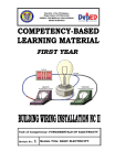 Republic of the Philippines Department of Education PUBLIC TECHNICAL-VOCATIONAL HIGH SCHOOLS mhar cueto Unit of Competency: FUNDAMENTALS OF ELECTRICITY Module No.: 1 Module Title: BASIC ELECTRICITY ACKNOWLEDGMENT Copyright Department of Education 2008 First Published JUNE 2008 This draft was prepared during the Competency-Based Learning Materials Development Workshop conducted at the Marikina Hotel, Marikina City on February 18-22, 2008 and finalized on May 23-25, 2008 at the Development Academy of the Philippines (DAP), Tagaytay City. This learning instrument was developed by the following personnel: Technology Teacher: Mr. Lyndon L. Catequista Marcelo I. Cabrera Vocational High School San Aquilino, Roxas, Oriental Mindoro Contextual Teacher: Ms. Gina C. delos Santos A.F.G. Bernardino Memorial Trade School Lias, Marilao, Bulacan Facilitators: Dr. Corazon Echano TechVoc Task Force Encoder: Mr. Lemuel C. Valles Administrative Officer II Educational Information Division Fund: Department of Education REFERENCES AND FURTHER READING 1. Azares, Efren F. and Recana, Cirilo B. Practical Electricity III; Adriana Publishing: 1999. 2. Agpaoa, Feleciano. Interior and Exterior Wiring Troubleshooting; National Bookstore: 1991. 3. Fajardo, Max B. and Fajardo, Leo R. Electrical Layouts and Estimates. 2nd Edition. 4. Cardenas, Elpidio J. Fundamental and Elements of Electricity. TABLE OF CONTENTS Page How to Use this Module ........................................................................................ i Introduction ........................................................................................................ ii Technical Terms ................................................................................................. iii Learning Outcome 1: Apply relevant electrical theories and principles ………………1 Learning Experiences/Activities ................................................................. 2 Information Sheet 1.1 ................................................................................ 3 Self-Check 1.1 ........................................................................................... 6 Activity Sheet 1.1 ....................................................................................... 8 Learning Outcome 2: Identify sources of energy …………………………....................10 Learning Experiences/Activities ............................................................... 11 Information Sheet 2.1 .............................................................................. 12 Self-Check 2.1 ......................................................................................... 15 Activity Sheet 2.1 ..................................................................................... 17 Learning Outcome 3: Splice and joint electrical conductors ……………................. 19 Learning Experiences/Activities ............................................................... 20 Information Sheet 3.1 .............................................................................. 21 Self-Check 3.1 ......................................................................................... 26 Operation Sheet 3.1 ................................................................................. 27 Operation Sheet 3.2 ................................................................................. 28 Job Sheet 3.1 ........................................................................................... 29 Job Sheet 3.2 ........................................................................................... 31 Learning Outcome 4: Connect electrical circuit …………………………………………..33 Learning Experiences/Activities ............................................................... 34 Information Sheet 4.1 .............................................................................. 35 Self-Check 4.1 ......................................................................................... 37 Information Sheet 4.2 .............................................................................. 38 Self-Check 4.2 ......................................................................................... 39 Activity Sheet 4.1 ..................................................................................... 40 Activity Sheet 4.2 ..................................................................................... 42 Learning Outcome 5: Decode resistor value………………………………………………..44 Learning Experiences/Activities ............................................................... 45 Information Sheet 5.1 .............................................................................. 46 Self-Check 5.1 ......................................................................................... 52 Activity Sheet 5.1 ..................................................................................... 53 Job Sheet 5.1 ........................................................................................... 56 Learning Outcome 6: Identify types of capacitors ………………………………………..57 Learning Experiences/Activities ............................................................... 58 Information Sheet 6.1 .............................................................................. 59 Self-Check 6.1 ......................................................................................... 63 Activity Sheet 6.1 ..................................................................................... 64 Answer Key 1.1 .................................................................................................. 65 Answer Key 2.1 .................................................................................................. 66 Answer Key 3.1 .................................................................................................. 68 Answer Key 4.1 .......................