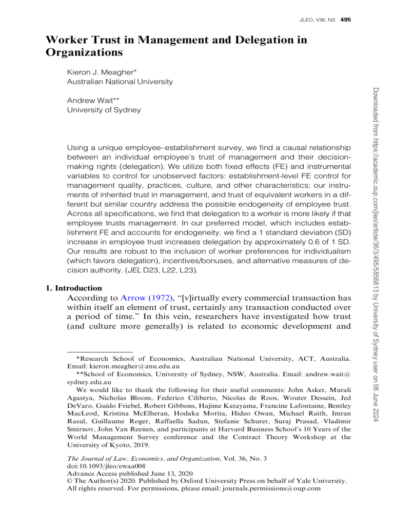 JLEO, V36, N3 495 Worker Trust in Management and Delegation in Organizations Kieron J. Meagher* Australian National University Using a unique employee–establishment survey, we find a causal relationship between an individual employee’s trust of management and their decisionmaking rights (delegation). We utilize both fixed effects (FE) and instrumental variables to control for unobserved factors: establishment-level FE control for management quality, practices, culture, and other characteristics; our instruments of inherited trust in management, and trust of equivalent workers in a different but similar country address the possible endogeneity of employee trust. Across all specifications, we find that delegation to a worker is more likely if that employee trusts management. In our preferred model, which includes establishment FE and accounts for endogeneity, we find a 1 standard deviation (SD) increase in employee trust increases delegation by approximately 0.6 of 1 SD. Our results are robust to the inclusion of worker preferences for individualism (which favors delegation), incentives/bonuses, and alternative measures of decision authority. (JEL D23, L22, L23). 1. Introduction According to Arrow (1972), “[v]irtually every commercial transaction has within itself an element of trust, certainly any transaction conducted over a period of time.” In this vein, researchers have investigated how trust (and culture more generally) is related to economic development and *Research School of Economics, Australian National University, ACT, Australia. Email: kieron.meagher@anu.edu.au **School of Economics, University of Sydney, NSW, Australia. Email: andrew.wait@ sydney.edu.au We would like to thank the following for their useful comments: John Asker, Murali Agastya, Nicholas Bloom, Federico Ciliberto, Nicolas de Roos, Wouter Dessein, Jed DeVaro, Guido Friebel, Robert Gibbons, Hajime Katayama, Francine Lafontaine, Bentley MacLeod, Kristina McElheran, Hodaka Morita, Hideo Owan, Michael Raith, Imran Rasul, Guillaume Roger, Raffaella Sadun, Stefanie Schurer, Suraj Prasad, Vladimir Smirnov, John Van Reenen, and participants at Harvard Business School’s 10 Years of the World Management Survey conference and the Contract Theory Workshop at the University of Kyoto, 2019. The Journal of Law, Economics, and Organization, Vol. 36, No. 3 doi:10.1093/jleo/ewaa008 Advance Access published June 13, 2020 C The Author(s) 2020. Published by Oxford University Press on behalf of Yale University. V All rights reserved. For permissions, please email: journals.permissions@oup.com Downloaded from https://academic.oup.com/jleo/article/36/3/495/5856813 by University of Sydney user on 06 June 2024 Andrew Wait** University of Sydney 496 The Journal of Law, Economics, & Organization, V36, N3 1. See for example Greif (1993); Knack and Keefer (1997); Zak and Knack (2001); Guiso et al. (2008); Bidner and Francois (2011); Algan and Cahuc (2010); Tabellini (2010); Gorodnichenko and Roland (2011); Butler et al. (2016). 2. Gulati and Nickerson (2008) find that pre-existing trust between organizations leads to less formal governance structures and to better performance outcomes in buyer–seller relationships. Dahlstrom and Nygaard (1995) examine the relationship between franchisor delegation of decisions and franchisee trust. 3. Also see Mayer et al. (1995) and (Thorelli 1986: 40) for equivalent definitions. Further diversity of the definition of trust arises in the empirical research. In their survey article, McEvily and Tortoriello (2011) find 129 different empirical measures of trust (from 179 papers). 4. Indeed, Gibbons and Henderson (2013) argue how well firms are able to delegate and encourage agents to take profit-enhancing noncontractible actions is at the heart of contemporary explanations of “persistent performance differences between seemingly similar Downloaded from https://academic.oup.com/jleo/article/36/3/495/5856813 by University of Sydney user on 06 June 2024 growth.1 It follows that trust could also play a role in economic interactions between and within firms. A large literature has found that interorganization trust, as reported in surveys, plays an important role in organizational performance (see Cao and Lumineau 2015 for a survey).2 Within firms, Guiso et al. (2015) and Brown et al. (2015) find a positive relationship between a firm’s financial performance and the average integrity/trustworthiness of its managers, as assessed by employees. Higher national/regional levels of general trust in a society are associated with larger corporations (La Porta et al. 1997) and more delegation across plants (Bloom et al. 2012). In this article, we add to this literature by delving further inside the organization, examining the relationship between worker trust of management and delegation of decision authority to employees. What is trust and why does it matter? While noting that there is no universal definition of trust, Rousseau et al. (1998: 395) contend that “[t]rust is a psychological state comprising the intention to accept vulnerability based upon positive expectations of the intentions or behavior of another.” Gambetta (2000) suggests “[w]hen we say we trust someone or that someone is trustworthy we implicitly mean that the probability that he will perform an action that is beneficial . . . is high enough for us to consider in engaging in some form of cooperation with him. Correspondingly, when we say that someone is untrustworthy, we imply that the probability is low enough for us to refrain from doing so.” This suggests trust (and distrust) can be thought of as a belief with an associated probability that the other party will do as they promise.3 Inside an organization, if parties believe the promises made by others, trust facilitates informal agreements (implicit contracts), allowing firms to tap into productive organizational structures (including delegation) that would not be possible relyi