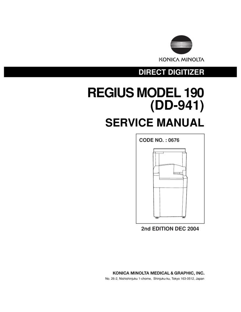 DIRECT DIGITIZER REGIUS MODEL 190 (DD-941) SERVICE MANUAL CODE NO. : 0676 2nd EDITION DEC 2004 No. 26-2, Nishishinjuku 1-chome, Shinjuku-ku, Tokyo 163-0512, Japan Table of Contents Chap.1 Overview 1.1 Principal Specifications................................................................................................ 3 1.1.1 Reading the Image...... ............................................................................................................... 3 1.1.2 Control Unit................................................................................................................................. 6 1.1.3 Specifications...... ....................................................................................................................... 7 1.2 Name of Parts.............................................................................................................. 8 1.2.1 External View of REGIUS 190...... .............................................................................................. 8 1.2.2 Main Parts inside REGIUS 190...... .......................................................................................... 10 1.2.3 Name of Cassette Parts...... ..................................................................................................... 11 1.3 Layout of Controlling Components ............................................................................ 13 1.4 1.3.1 Layout of Power Supplies and Main Boards...... ....................................................................... 13 1.3.2 Locations of Motors and Fans...... ............................................................................................ 14 1.3.3 Locations of Sensors and Switches.......................................................................................... 15 Block Diagram .......................................................................................................... 17 1.5 Description of Operation ............................................................................................ 19 1.5.1 Operation Flow...... ................................................................................................................... 19 1.5.2 Normal Operation...... ............................................................................................................... 20 1.5.3 Initializing Sequence................................................................................................................. 23 1.5.4 Erase Operation...... ................................................................................................................. 23 1.6 Required Tools .......................................................................................................... 24 Chap.2 Disassembly and Reassembly 2.1 Preparation for Disassembly...................................................................................... 27 2.1.1 Precautions for Disassembly and Reassembly ........................................................................ 27 2.2 Removing the External Covers .................................................................................. 28 2.2.1 Removal of the Rear Cover...... ................................................................................................ 28 2.2.2 Removal of the Left & Right Covers...... ................................................................................... 29 2.2.3 Removal of the Front-Top Cover...... ......................................................................................... 30 2.2.4 Removal of Insertion / Ejection Front Cover...... ....................................................................... 31 2.2.5 Removal of LCD........................................................................................................................ 32 2.3 Insertion / Ejection Unit.............................................................................................. 33 2.3.1 Controlling Parts of Insertion / Ejection Unit............................................................................. 33 REGIUS MODEL 190 Service Manual Ver.1.00 2004.11.01 I 2.3.2 Removal of the Insertion/Ejection Unit...... ............................................................................... 37 2.3.3 Removal of Ejection Guide Assy............................................................................................... 39 2.3.4 Replacement of Bar Code Reader............................................................................................ 40 2.3.5 Replacement of Insertion Nip Rollers...... ................................................................................. 41 2.3.6 Replacement of Insertion Motor...... ......................................................................................... 43 2.3.7 Replacement of Shutter Motor (M2)...... ................................................................................... 44 2.3.8 Replacement of Ejection Motor (M3)...... .................................................................................. 45 2.4 Transport Unit ............................................................................................................ 49 2.4.1 Controlling Parts comprising the Transport Unit...... ................................................................. 49 2.4.2 Removal of the Cassette Receive Unit...... ............................................................................... 54 2.4.3 Replacement of the Justification Motor (PM2).......................................................................... 55 2.4.4 Replacement of Transport Rack Gear....................................................................................... 57 2.4.5 Replacement of Elevator Motor (PM1)...... ............................................................................... 59 2.4.6 Replacement of Transport Motor (PM3)..........................................................
