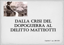 DALLa crisi del dopoguerra al delitto Matteotti Capitolo 7, pp. 286-305 Vittoria mutilata ❖ Espressione coniata da D’Annunzio sulle colonne de «Il Corriere della Sera» in un articolo datato 24 ottobre 1918 ❖ Non era stata prevista, al momento della firma del Patto di Londra, la disgregazione dell’impero austro-ungarico, da cui nacquero vari Stati nazionali (Iugoslavia, Polonia, Austria, Ungheria, Cecoslovacchia); ❖ Abbandono del tavolo delle trattative da parte di Vittorio Emanuele Orlando e Sonnino in segno di protesta e di orgoglio (Wilson aveva imposto all’Italia la rinuncia alla Dalmazia, pena la decadenza dell’intero patto di Londra) ma, così facendo, l’Italia non solo non ottiene Fiume (che rivendicava in base al principio di nazionalità: era abitata in prevalenza da italiani) e la Dalmazia (che rivendicava per il patto di Londra, ma abitata da slavi), ma non partecipa alla spartizione delle colonie tedesche. 13 settembre 1919 Gabriele d’Annunzio, a capo di alcuni reparti dell’esercito (legionari), parte da Ronchi ed occupa la città di Fiume senza avere nessuna autorizzazione dal governo italiano presieduto da Francesco Saverio Nitti. Dota Fiume di una Costituzione (la Carta del Carnaro, dal nome del Golfo, redatta dal sindacalista De Ambris) Novembre-Dicembre 1920 Solo dopo circa un anno (reggenza del Carnaro, 15 mesi) lo Stato italiano riesce ad allontanare i legionari dalla città e a ripristinare la legalità (trattato di Rapallo: l’Italia ottiene Zara e alcune isole, mentre la Dalmazia rimane alla Iugoslavia; Fiume città libera sotto la Società delle Nazioni – v. sgombero con la forza dopo 5 giorni di resistenza, il cosiddetto «Natale di sangue»; verrà annessa all’Italia col patto di Roma del 1924) Un pericoloso precedente • L’impresa di Fiume mostra come un gruppo di violenti possa compiere un atto di forza senza che le autorità intervengano • Il fascismo si rifarà all’impresa di Fiume in occasione della marcia su Roma Gabriele D’Annunzio Fiume anche esperimento sociale: legalizzazione aborto e accettazione relazioni omosessuali Privi di lavoro e delusi, fondano nel 1918 l’ANC (Associazione Nazionale combattenti) che aveva un connotato di antisistema e antipolitica Grave crisi economica Difficoltà dell’industria, che deve essere riconvertita ad un’economia «di pace» (da qui licenziamenti in industrie meccaniche e chimiche e aumento di povertà) Difficoltà dell’agricoltura, che non riesce a produrre raccolto sufficiente per le esigenze del Paese Aumento del debito pubblico (milioni di dollari concessi al governo italiano durante il conflitto). Inflazione e crollo della lira, cui non corrisponde un incremento delle retribuzioni (colpito soprattutto il ceto medio degli impiegati a reddito fisso) 1919: Congresso di Bologna e preminenza dei massimalisti guidati da Lazzari e Giacinto Menotti Serrati sui riformisti guidati da Turati e Treves Si forma anche una corrente di estrema sinistra con: Gramsci che dirige la rivista «Ordine nuovo» a Torino e Bordiga che dirige il gruppo legato al settimanale «Il Soviet» a Napoli 1921: A Livorno si tiene il XVII Congresso del Partito socialista Un gruppo di massimalisti, guidato da Bordiga e Gramsci, si stacca dal Partito socialista e dà vita al Partito comunista 1922: La nascita del Partito socialista unitario Anche l’ala più riformista del Partito si stacca al XIX Congresso. Giacomo Matteotti dà vita al Partito socialista unitario Il Partito Popolare di don Luigi Sturzo Laico, aconfessionale Partito Popolare Italiano interclassista Adesioni nelle campagne (programma di redistribuzione dei terreni incolti, soprattutto nel Sud) e nelle città, tra operai, artigiani e piccoli commercianti (proposta di riforma fiscale per una maggiore giustizia sociale). Il programma si basava, inoltre, sulla difesa della famiglia, sulla libertà di insegnamento, sull’introduzione di un sistema elettorale proporzionale, sull’estensione del diritto di voto alle donne. Appello ai liberi e forti «A tutti gli uomini liberi e forti che in questa grave ora sentono alto il dovere di cooperare ai fini supremi della Patria, senza pregiudizi, né preconcetti, facciamo appello perché uniti insieme, propugnino nella loro interezza gli ideali di giustizia e libertà»…. Perché possa realizzarsi uno «Stato veramente popolare, che riconosca i limiti della sua attività, che rispetti i nuclei e gli organismi naturali – la famiglia, le classi, i comuni – che rispetti la personalità individuale e incoraggi le iniziative private». (Appello lanciato dall’albergo di Santa Chiara a Roma il 18 gennaio 1919) Don Luigi Sturzo 23 marzo 1919: nasce il Movimento dei Fasci di combattimento di Mussolini ❖ Fascio: simbolo di forza e unità (v. fascio littorio: arma che i littori romani portavano con loro per proteggere i magistrati, composta da una scure e da un fascio di verghe di legno, legati tra loro da strisce di cuoio) ❖ Programma di S. Sepolcro (riunione nel salone del Circolo dell’Alleanza Industriale e commerciale) come alternativa al socialismo marxista e al modello liberale, pubblicato su Il popolo d’Italia (v. fonte p. 292) e ricorso alla violenza (v. 15 aprile 1919: distruzione dei macchinari tipografici ed incendio alla sede milanese dell’Avanti) ❖ Intreccio di socialismo e nazionalismo, di rivendicazioni di sinistra e di destra (suffragio universale maschile e femminile, età elettorato attivo abbassata dai 21 ai 18 anni e passivo dai 30 ai 25; abolizione del Senato; paga minima; tassa straordinaria sul capitale a carattere progressivo, ma anche: sequestro dei beni delle Congregazioni religiose, politica estera volta a valorizzare la nazione italiana nel mondo, nazionalizzazione delle fabbriche di esplosivi e armi, formazione di una milizia nazionale) ❖ Aderenti al movimento furono i futuristi, gli Arditi (ex combattenti dei reparti d’assalto, abituati alla violenza e scontent