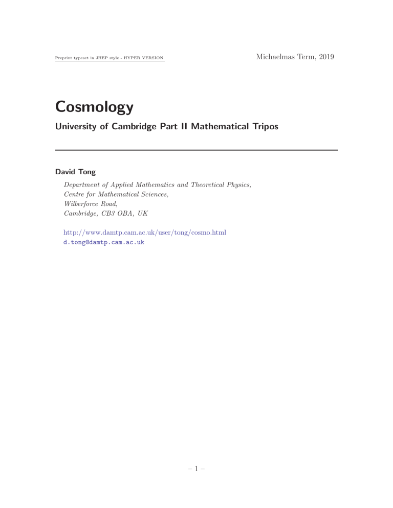 Michaelmas Term, 2019 Preprint typeset in JHEP style - HYPER VERSION Cosmology University of Cambridge Part II Mathematical Tripos David Tong Department of Applied Mathematics and Theoretical Physics, Centre for Mathematical Sciences, Wilberforce Road, Cambridge, CB3 OBA, UK http://www.damtp.cam.ac.uk/user/tong/cosmo.html d.tong@damtp.cam.ac.uk –1– Recommended Books and Resources Cosmology textbooks sit in one of two camps. The introductory books do a good job of describing the expanding universe, but tend to be less detailed on the hot Big Bang and structure formation. Meanwhile, advanced books which cover these topics assume prior exposure to both general relativity and statistical mechanics. This course sits somewhere between the two. The first two books below cover the material at an elementary level; the last three are more advanced. • Barbara Ryden, Introduction to Cosmology A clearly written book that presents an excellent, gentle introduction to the expanding universe, with subsequent chapters on thermal history and structure formation . • Andrew Liddle An Introduction to Modern Cosmology Another gentle introduction, and one that is especially good when describing expanding spacetimes. However, it becomes more descriptive, and less quantitative, as the subject progresses. • Scott Dodelson Modern Cosmology • Daniel Baumann Cosmology Both of these are fantastic books: clear, detailed and comprehensive. I have a slight preference for Daniel’s book, although in part this is because I’m proud of the blurb that I wrote on the back cover. • Steven Weinberg Cosmology Weinberg is one of the smarter Nobel prize winners in physics. Here he offers a scholarly account of the subject, devoid of pretty pictures and diagrams, and with a dogged refusal to draw graphs, yet full of clarity and insight. A number of further lecture notes are available on the web. Links can be found on the course webpage: http://www.damtp.cam.ac.uk/user/tong/cosmo.html Contents 0. Introduction 1 1. The Expanding Universe 1.1 The Geometry of Spacetime 1.1.1 Homogeneous and Isotropic Spaces 1.1.2 The FRW Metric 1.1.3 Redshift 1.1.4 The Big Bang and Cosmological Horizons 1.1.5 Measuring Distance 1.2 The Dynamics of Spacetime 1.2.1 Perfect Fluids 1.2.2 The Continuity Equation 1.2.3 The Friedmann Equation 1.3 Cosmological Solutions 1.3.1 Simple Solutions 1.3.2 Curvature and the Fate of the Universe 1.3.3 The Cosmological Constant 1.3.4 How We Found Our Place in the Universe 1.4 Our Universe 1.4.1 The Energy Budget Today 1.4.2 Dark Energy 1.4.3 Dark Matter 1.5 Inflation 1.5.1 The Flatness and Horizon Problems 1.5.2 A Solution: An Accelerating Phase 1.5.3 The Inflaton Field 1.5.4 Further Topics 3 7 7 10 13 15 19 23 24 27 29 32 32 37 40 44 47 49 54 58 65 65 68 71 76 2. The Hot Universe 2.1 Some Statistical Mechanics 2.1.1 The Boltzmann Distribution 2.1.2 The Ideal Gas 2.2 The Cosmic Microwave Background 2.2.1 Blackbody Radiation 78 79 80 82 85 85 –1– 2.3 2.4 2.5 2.2.2 The CMB Today 2.2.3 The Discovery of the CMB Recombination 2.3.1 The Chemical Potential 2.3.2 Non-Relativistic Gases Revisited 2.3.3 The Saha Equation 2.3.4 Freeze Out and Last Scattering Bosons and Fermions 2.4.1 Bose-Einstein and Fermi-Dirac Distributions 2.4.2 Ultra-Relativistic Gases The Hot Big Bang 2.5.1 Temperature vs Time 2.5.2 The Thermal History of our Universe 2.5.3 Nucleosynthesis 2.5.4 Further Topics 3. Structure Formation 3.1 Density Perturbations 3.1.1 Sound Waves 3.1.2 Jeans Instability 3.1.3 Density Perturbations in an Expanding Space 3.1.4 The Growth of Perturbations 3.1.5 Validity of the Newtonian Approximation 3.1.6 The Transfer Function 3.2 The Power Spectrum 3.2.1 Adiabatic, Gaussian Perturbations 3.2.2 Building Intuition For Gaussian Distributions 3.2.3 The Power Spectrum Today 3.2.4 Baryonic Acoustic Oscillations 3.2.5 Window Functions and Mass Distribution 3.3 Nonlinear Perturbations 3.3.1 Spherical Collapse 3.3.2 Virialisation and Dark Matter Halos 3.3.3 Why the Universe Wouldn’t be Home Without Dark Matter 3.3.4 The Cosmological Constant Revisited 3.4 The Cosmic Microwave Background 3.4.1 Gravitational Red-Shift 3.4.2 The CMB Power Spectrum –2– 89 92 94 95 96 99 103 106 107 110 112 112 117 118 124 128 129 129 133 135 140 145 146 148 150 153 156 158 160 164 164 168 169 170 172 172 174 3.5 3.4.3 A Very Brief Introduction to CMB Physics Inflation Revisited 3.5.1 Superhorizon Perturbations 3.5.2 Classical Inflationary Perturbations 3.5.3 The Quantum Harmonic Oscillator 3.5.4 Quantum Inflationary Perturbations 3.5.5 Things We Haven’t (Yet?) Seen –3– 176 178 178 179 182 186 189 Acknowledgements This is an introductory course on cosmology aimed at mathematics undergraduates at the University of Cambridge. You will need to be comfortable with the basics of Special Relativity, but no prior knowledge of either General Relativity or Statistical Mechanics is assumed. In particular, the minimal amount of statistical mechanics will be developed in order to understand what we need. I have made the slightly unusual choice of avoiding all mention of entropy on the grounds that nearly all processes in the early universe are adiabatic and we can, for the most part, get by without it. (The two exceptions are a factor of 4/11 in the cosmic neutrino background and, relatedly, the number of effective relativistic species during nucleosynthesis: for each of these I’ve quoted, but not derived, the relevant result about entropy.) I’m very grateful to both Enrico Pajer and Blake Sherwin for explaining many subtle (and less subtle) points to me, and to Daniel Baumann and Alex Considine Tong for encouragement. I’m supported by the Royal Society and by the Simons Foundation. –4– 0. Introduction All civilisations have an origin myth. We are the first to get it right. Our origin myth goes by the name of the Big Bang theory. It is a wonderfully evocative name, but one that seeds confusion from the off. The Big Bang theory do
