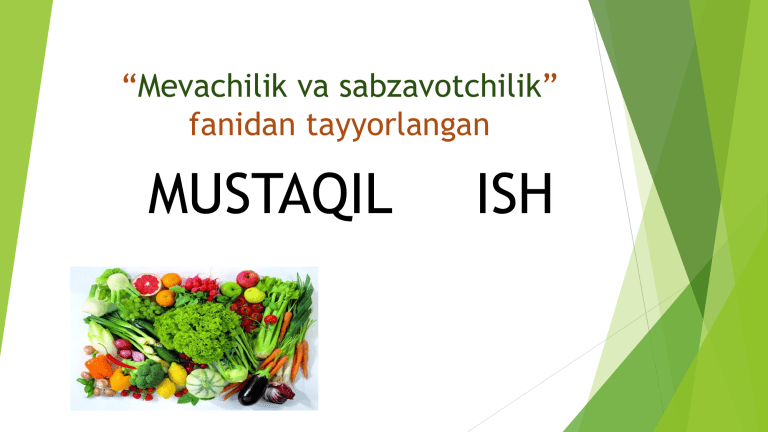 “Mevachilik va sabzavotchilik” fanidan tayyorlangan MUSTAQIL ISH Mavzu: Danakli mevalarni yetishtirish va ularga shakl berish texnologiyasi R E J A: Danak mevali daraxtlarni xalq xo’jaligidagi ahamiyati. 2. Danakli mevalardan gilos va shaftolini navlari haqida. 3. Danakli mevalardan olxo’ri va olcha haqida 4. Xulosa 5. Foydalanilgan adabiyotlar 1. Danak mevali daraxtlarni asosan Farg’ona va zarafshon vodiysida ko’p tarqalgan bo’lib umumiy mevazorlar maydonini 90 % o’rikka to’g’ri keladi. O’rik xalq xo’jaligida sanoat uchun xom ashyo vazifasini o’taydi, unda 20 % shakar bor. O’rik daraxti har xil tuproqlarda, lekin tuproq qatlami 0,5—2 m bo’lgan toshloq yerlarda yaxshi o’sadi. Tor qiyaliklari, suv bilan yaxshi ta‘minlangan, unumdor toshloq yerlarda ham o’saveradi. Qurg’oqchilikka ancha chidamli. Navi va o’stirilayotgan sharoitga qarab mevasi tarkibida 20% gacha shakar, organik kislotalar, karotin (provitamin A) vitamin S, xushbuy va mineral moddalar, marizida 58% gacha moy va 20% gacha oqsil bor. Mevasi yeyiladi, quritiladi hamda qonserva qilinadi O’rta Osiyo ham shaftolining qadimiy markazi hisoblanadi. Bu yerda asosan Farg’ona, Zarafshon vodiysida, O’zbekistonning janubig’arbiy zonasida, shuningdek, Tojikistoning tog’li rayonlarida ko’p. U Armanistonda, Gro’ziyada, Dog’istonda ham keng tarqalgan. Mevasining ta‘mi yaxshi. Tarkibida parvarishlash sharoitiga qarab 14% gacha shakar, 0,4—1,0% olma va limon kislotalar, 0,7% ga yaqin pektin, shuningdek oshlovchi moddalar, A va S vitaminlar, mineral to’zlar bor. Mevasi yangiligida iste‘mol kilinadi, konserva tayyorlanadi, quritilib qoqi qilinadi. Gilos navlari Gilos mo‘tadil issiq va issiq iqlim o’simligidir. Kavkaz va Qrimning tilog’och o’rmonlarida yovvoyi holda o’sadi. Ukgaina va Moldaviyada yovvoyilashgan yakkayakka daraxtlarini uchratish mumkin. Madaniy gilos Kgimda, Dogistonda, Ozarbayjon, Armaniston va Gruziyada, Ukgainaning janubida, Kgasnodar o’lkasida, Moldaviyada, o’rta Osiyoda, jumladan O’zbekistonda keng tarqalgan. Keyingi vaqtda Baltika boyi respublikalarida ham muvaffakiyatli ekib o’stirilmokda. Madaniy gilos yovvoyi turidan chiqarilgan. Gilos boyi 10-15 m gacha yetadigan, shox-shabbasi siyrak, yo’g’on shoxlari kam bo’lgan baland daraxt. O’zbekistonda gilos daraxtining tanasi issiqdan qovjirab po’stlog’i yog’ilib ketadi. Tinim holatidagi ko’rtaklari kam bo’ladi, shuning uchun ham asosiy qismlari qurib qolganda shox-shabbasi yaxshi tiklanmaydi. Gilosning ayrim daraxtlari 80— 100 yil yashaydi. Sovuqdan kam zararlanadi. O’zbekiston sharoitida bir to’p gilosdan 150—300 kg gacha hosil olinadi. Mevasi erta—may oxiri, iyun boshlarida pishadi. Qattik etli navlari o’zoqqa tashishga chidamli. Mevasi dumaloq, yuraksimon, sarik, qizil, tuq qizil rangda, eti shirali, sirti tekis bo’ladi. Mevasining tarkibida 12,2% shakar, 0,23% turli kislotalar va S hamda A vitaminlar bo’ladi. Gilos yorug’lik va issiqlikka talabchan daraxt. Shuning uchun bizda uning gul kurtaklarini, ko’chatzorlardagi ko’chatini va yosh novdalarini ko’pincha sovuq o’rib ketadi. O’zbekistonda o’stirilayotgan ko’pchilik olcha navlari Cerasus Vulgaris Mill turidan kelib chiqqan. Gilos bilan olchani chatishtirish natijasida duragaylar chiqarilgan. Olcha daraxt va bo’ta shaklida o’sadi. Daraxtsimon olcha navlarida hosili bir yillik novdalarda joylashadi. Olcha danakli mevalar ichida sovuqqa ancha chidamli o’simlikdir. Shaftoli navlari Shaftoli turlari: jaydari shaftoli (P.Vilgaris Mill). O’rta Osiyoda yovvoyi holda uchraydi. Boyi 6—9 m gacha yetadi, shox-shabbalari tarvakaylagan. Daraxti tez o’sadi. Ko’plab novdalar chiqaradi. Barglari lantsetsimon, tuksiz, cheti tishchali. Kurtak chiqarmasdan oldin gullaydi. Ekilayotgan navlarning asosiy qismi shaftolining oddiy turiga mansubdir. Farg’ona shaftolisi (anjir shaftoli) P. Ferganensis (kost yet Riad) kovet kost). O’rta Osiyoda yetishtiriladi. Bu nav barg tomirining to’zilishi, danagi sirtining parallel bujmayishi va ko’pincha mevasining yapaloqligi bilan P. Vulgar s avlodidan farq qiladi. David shaftolisi (P. DavidianaSarr). Daraxtining boyi 8 m gacha bo’ladi. Mevasi bujmaygan, yashil-sarg’ish tusli bo’lib, Shimoliy Xitoyda yovvoyi holda o’sadi. Sovuqqa, qo’rg’oqchilikka hamda issiqqa chidamli. Shaftoli, o’rik, bodom va olxo’ri uchun payvandtag sifatida foydalanish mumkin. Mir shaftolisi (P. mira (koehus). kov. yet kost). Xitoyda dengiz sathidan 3000 m balandlikda yovvoyi holda o’sadi. Daraxtining boyi 8 m gacha yetadi, kech gullaydi, sovuqqa chidamli navlar chiqarishda foydalanish mumkin. O’zbekistan sharoitida shaftoli daraxtlari kuchli o’sadi, bir yillik novdasining o’zunligi 1—1,5 m ga boradi. Sho’r yerlarda 7—10 yildan ortiqroq o’sadi. Issiqsevar o’simlik. Bahorgi qora sovuqdan birinchi navbatda meva ko’rtaklari, g’unchalari va guli zararlanadi Olxo’ri va olcha navlari. O’zbekistonda xonaki olxo’ri navlari (Prunusdomestica) ko’p tarqalgan, yovvoyi holda o’sadiganlari uchramaydi. Daraxtining boyi 6—12 m ga yetadi. Bo’tasimon, to’psimon va daraxt shaklida o’sadigan turlari bor. Tez hosilga kiradi. Yevropaning sharq va janubidan keltirilgan vengerka tipidagi olxo’rilar O’zbekiston uchun juda qimmatli hisoblanadi. Olxo’ri o’rikka nisbatan sovuqqa chidamliroq bo’ladi. Samarkand, Toshkent, Farg’ona, Surxondaryo oblastlarining baland tog’ etaklari olxo’ri o’stirish uchun juda qulay hisoblanadi. Tog’olcha — Tyanshanda va Kopet-Dog’da o’sadi. Tog’li rayonlarda, tog’ etaklarida ham ko’plab uchratish mumkin. Undan olxo’riga payvandtag sifatida foydalaniladi. O’zbekistonda Eron, Turkiya va Armanistondan keltirilgan Tog’olcha xillari ko’p tarqalgan. Bizda buni ko’ksulton deb yuritiladi. O’rta Osiyo bog’larida olxo’ri bilan tog’olchani chatishtirish natijasida olingan olxo’ri tog’o