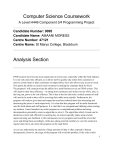 Computer Science Coursework A Level H446 Component 3/4 Programming Project Candidate Number: 9095 Candidate Name: AMAANI MORESS Centre Number: 47121 Centre Name: St Marys College, Blackburn Analysis Section EPOS systems have become more paramount in recent years, especially within the food industry. It is not only more time efficient, as it allows staff to quickly take orders from customers or remove certain items or place customers on empty tables, but it also allows easy access to stock. This grants the ability to control stock inventory by making the computer think for itself. The program I will create provides the ability for a small business to use an EPOS system. This will improve their time efficiency - in sitting down customers and in their service while, also, in the long run, prove to be cost-efficient. This is due to the fact that only a critical amount of staff will need to be used as they will be servicing their tables more quickly. Furthermore, the program will analyse given data and output the most/least ordered items thus increasing and decreasing the prices of each respectively. It is clear that this program will be multi-functional used for both admin and staff purposes. It is vital that I use computational thinking when creating my solution. I must formulate my entire program as a computational problem and using decomposition, potentially create an algorithm to solve it. The algorithms which I create can be deemed as correct and efficient by ensuring they are tested, logically makes sense and are improved using user feedback. I will continuously test my program and record the errors that occur and debug them accordingly, while also asking external members to view the solution in regular intervals to ask where the program can be made better. As you can understand, the analysis of large amounts of data is often exposed to human discrepancies, however, the usage of the program will avoid this problem. If the code is built 1 correctly the program can take increasing amounts of data and provide an output within milliseconds, whereas using a human to do the same problem can take weeks and will more likely require more than one mathematician to analyse it; this increases cost in requiring to pay for mathematicians to come in to analyse the data and it may still not be 100% accurate. Using the traditional method of staff taking down orders with a pen and paper is not only old fashioned in a world where technology is constantly becoming the normal, but it also falls into the dangers of typical human errors. If the staff do not write the order in a clear manner then it cannot be read by the chefs needing to make the food. It also takes time to move from the table of the customers to the kitchen to give the order. Though it is only a minute or two, this adds up and means that one staff member can only aid with 2/3 tables. Moreover, as a staff member writes down the order, if they have accidentally written it incorrectly, it means messily crossing out the order - and if not done correctly or completely forgoing crossing it out the meal will be made which will thus increase cost and waste food. My program will automatically calculate large summations and use various mathematical protocols to provide an understandable output. This will be shown in calculating: the receipt for each customer, the number of items in stock, the most and least ordered meals and the amount of income from each type of item. This will be beneficial for the company as it will be void of any human errors and it can be carried out in seconds, thus saving time. My program will also be built to carry out validation checks in the form of If statements. An example of this being used will be found in my Login page where only accounts that exist will be allowed to access the Admin page. This will improve the security of my program and will also increase the accuracy of any outputs, as it will ensure that all inputs are reasonable and can be accepted by the program. In my Login page, I will also ensure to use hashing to ensure nobody can access the information of the restaurant without the correct details. There will be a large amount of data stored in the form of a record and database. All the items of food that are in stock will be held in a record as will all the transactions made by customers. This will be useful as it will store all the information in a clear and readable format, while also allowing the ability to easily delete, add and amend any information. The software I will use for my program, after carrying out some research, will be Visual Basic. This will particularly be beneficial for me as I have experience in Visual Basic for a year and a half and all tools required to create my software is provided by Visual Basic, including inbuilt functions. My interface will be easy to use whilst using this software and can be displayed in a clear and concise manner. If I used a different program that I was less familiar with, but had more inbuilt functions I would fall trap to more errors due to the lack of experience. I will use Visual Basic 2010 for my program as this is the version that I use in both my college and at home. The time it takes to carry out tasks related to waiting and analysing is highly wasted when completed manually. However, by using a computerised solution we can reduce both the manpower and time taken to complete these tasks. My computer program is built to show the availability of the tables, how long a set of customers has been at the table and allows the waiters 2 to access a computerised menu which will automatically display the receipt of the transaction and allow amendments to the order. It will also access the local weather, in order to provide a computerised solution to increase or decrease prices in accordance to the temperature, humidity and wind speed. It will also affect the time at which customers are able to stay at their tables. For example, if it is a cold day the prices on 