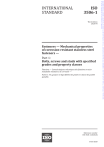 ISO 3506-1 Third edition 2020-04 Fasteners — Mechanical properties of corrosion-resistant stainless steel fasteners — Part 1: Bolts, screws and studs with specified grades and property classes Fixations — Caractéristiques mécaniques des fixations en acier inoxydable résistant à la corrosion — Partie 1: Vis, goujons et tiges filetées de grades et classes de qualité spécifiés Copyrighted material licensed to University of Toronto by Clarivate Analytics (US) LLC, subscriptions.techstreet.com, downloaded on 2020-08-09 13:45:47 +0000 by No further reproduction or distribution is permitted. INTERNATIONAL STANDARD University of Toronto User. Reference number ISO 3506-1:2020(E) © ISO 2020 Copyrighted material licensed to University of Toronto by Clarivate Analytics (US) LLC, subscriptions.techstreet.com, downloaded on 2020-08-09 13:45:47 +0000 by No further reproduction or distribution is permitted. ISO 3506-1:2020(E) University of Toronto User. COPYRIGHT PROTECTED DOCUMENT © ISO 2020 All rights reserved. Unless otherwise specified, or required in the context of its implementation, no part of this publication may be reproduced or utilized otherwise in any form or by any means, electronic or mechanical, including photocopying, or posting on the internet or an intranet, without prior written permission. Permission can be requested from either ISO at the address below or ISO’s member body in the country of the requester. ISO copyright office CP 401 • Ch. de Blandonnet 8 CH-1214 Vernier, Geneva Phone: +41 22 749 01 11 Fax: +41 22 749 09 47 Email: copyright@iso.org Website: www.iso.org Published in Switzerland ii © ISO 2020 – All rights reserved Contents Page Foreword...........................................................................................................................................................................................................................................v Introduction............................................................................................................................................................................................................................... vii 1 2 3 4 5 6 7 8 9 Scope.................................................................................................................................................................................................................................. 1 Normative references....................................................................................................................................................................................... 2 Terms and definitions...................................................................................................................................................................................... 2 Symbols........................................................................................................................................................................................................................... 3 Designation system for stainless steel grades and property classes.............................................................. 4 5.1 General............................................................................................................................................................................................................ 4 5.2 Designation of stainless steel grades (first block).................................................................................................... 5 5.3 Designation of property classes (second block)......................................................................................................... 6 Materials........................................................................................................................................................................................................................ 6 6.1 Chemical composition....................................................................................................................................................................... 6 6.2 Heat treatment for martensitic stainless steel fasteners..................................................................................... 7 6.3 Finish................................................................................................................................................................................................................ 8 6.4 Corrosion resistance........................................................................................................................................................................... 8 Mechanical and physical properties................................................................................................................................................. 8 Test methods...........................................................................................................................................................................................................17 9.1 Tensile test for fasteners............................................................................................................................................................... 17 9.1.1 General................................................................................................................................................................................... 17 9.1.2 Test procedure for the simultaneous determination of Rmf, Rpf, and A ......................... 18 9.1.3 Reference test procedure for the determination of stress at 0,2 % nonproportional elongation, Rpf ............................................................................................................................... 19 9.1.4 Alternative test procedure for the determination of elongation, A ................................... 21 9.1.5 Test results and requir