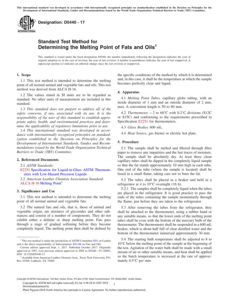 This international standard was developed in accordance with internationally recognized principles on standardization established in the Decision on Principles for the Development of International Standards, Guides and Recommendations issued by the World Trade Organization Technical Barriers to Trade (TBT) Committee. Designation: D5440 − 17 Standard Test Method for Determining the Melting Point of Fats and Oils1 This standard is issued under the fixed designation D5440; the number immediately following the designation indicates the year of original adoption or, in the case of revision, the year of last revision. A number in parentheses indicates the year of last reapproval. A superscript epsilon (´) indicates an editorial change since the last revision or reapproval. 1. Scope 1.1 This test method is intended to determine the melting point of all normal animal and vegetable fats and oils. This test method was derived from ALCA H-16. 1.2 The values stated in SI units are to be regarded as standard. No other units of measurement are included in this standard. 1.3 This standard does not purport to address all of the safety concerns, if any, associated with its use. It is the responsibility of the user of this standard to establish appropriate safety, health, and environmental practices and determine the applicability of regulatory limitations prior to use. 1.4 This international standard was developed in accordance with internationally recognized principles on standardization established in the Decision on Principles for the Development of International Standards, Guides and Recommendations issued by the World Trade Organization Technical Barriers to Trade (TBT) Committee. 2. Referenced Documents 2.1 ASTM Standards: E2251 Specification for Liquid-in-Glass ASTM Thermometers with Low-Hazard Precision Liquids 2.2 American Leather Chemists Association Standard: ALCA H-16 Melting Point2 3. Significance and Use 3.1 This test method is intended to determine the melting point of all normal animal and vegetable fats. 3.2 The natural fats and oils, that is, those of animal and vegetable origin, are mixtures of glycerides and other substances and consist of a number of components. They do not exhibit either a definite or sharp melting point. Fats pass through a stage of gradual softening before they become completely liquid. The melting point then shall be defined by 1 This test method is under the jurisdiction of ASTM Committee D31 on Leather and is the direct responsibility of Subcommittee D31.08 on Fats and Oils Current edition approved Sept. 1, 2017. Published October 2017. Originally approved in 1993. Last previous edition approved in 2009 as D5440 – 93 (2009). DOI: 10.1520/D5440-17. 2 Available from American Leather Chemists Assn., Texas Tech University, P.O. Box 45300, Lubbock, TX 79409. the specific conditions of the method by which it is determined and, in this case, it shall be the temperature at which the sample becomes perfectly clear and liquid. 4. Apparatus 4.1 Melting Point Tubes, capillary globe tubing, with an inside diameter of 1 mm and an outside diameter of 2 mm, max. A convenient length is 50 to 80 mm. 4.2 Thermometer, − 2 to 68°C with 0.2°C divisions (S12C or S15C) and conforming to the requirements prescribed in Specification E2251 for thermometers. 4.3 Glass Beaker, 600 mL. 4.4 Heat Source, gas burner or electric hot plate. 5. Procedure 5.1 The sample shall be melted and filtered through filter paper to remove any impurities and the last traces of moisture. The sample shall be absolutely dry. At least three clean capillary tubes shall be dipped in the completely liquid sample so that the fat stands approximately 10 mm high in each tube. One end of the tube (where the sample is located) shall be fused in a small flame, taking care not to burn the fat. 5.2 The tubes shall be placed in a beaker and held in a refrigerator at 4 to 10°C overnight (16 h). 5.2.1 The samples shall be completely liquid when the tubes are placed in the refrigerator. It is good practice to pass the ends of the tubes containing the sample momentarily through the flame, just before they are taken to the refrigerator. 5.3 After removing the tubes from the refrigerator, they shall be attached to the thermometer, using a rubber band or any suitable means, so that the lower ends of the melting point tubes shall be even with the bottom of the mercury bulb of the thermometer. The thermometer shall be suspended in a 600 mL beaker, which is about half full of clear distilled water and the bottom of the thermometer immersed approximately 30 mm. 5.4 The starting bath temperature shall be adjusted to 8 to 10°C below the melting point of the sample at the beginning of the test. Agitation of the water bath shall be made with a small stream of air or other suitable means, and heat shall be applied so the batch temperature is increased at the rate of approximately 0.5°C per min. Copyright © ASTM International, 100 Barr Harbor Drive, PO Box C700, West Conshohocken, PA 19428-2959. United States Copyright by ASTM Int'l (all rights reserved); Fri Jul 6 06:28:41 EDT 2018 1 Downloaded/printed by Pham Nguyen (SGS North America Inc) pursuant to License Agreement. No further reproductions authorized. D5440 − 17 5.6 The average of the melting point of all the tubes shall be taken and this average shall be reported as the melting point. in use, and where it was approved for publication before the inclusion of precision and bias statements was mandated. The original interlaboratory test data is no longer available. The user is cautioned to verify by the use of reference materials, if available, that the precision and bias (or reproducibility) of this test method is adequate for the contemplated use. 6. Report 8. Keywords 5.5 Fats usually pass through an opalescent stage before melting completely. The heating shall be continued until the tubes are completely clear throughout. The temperature shall be observed at which eac