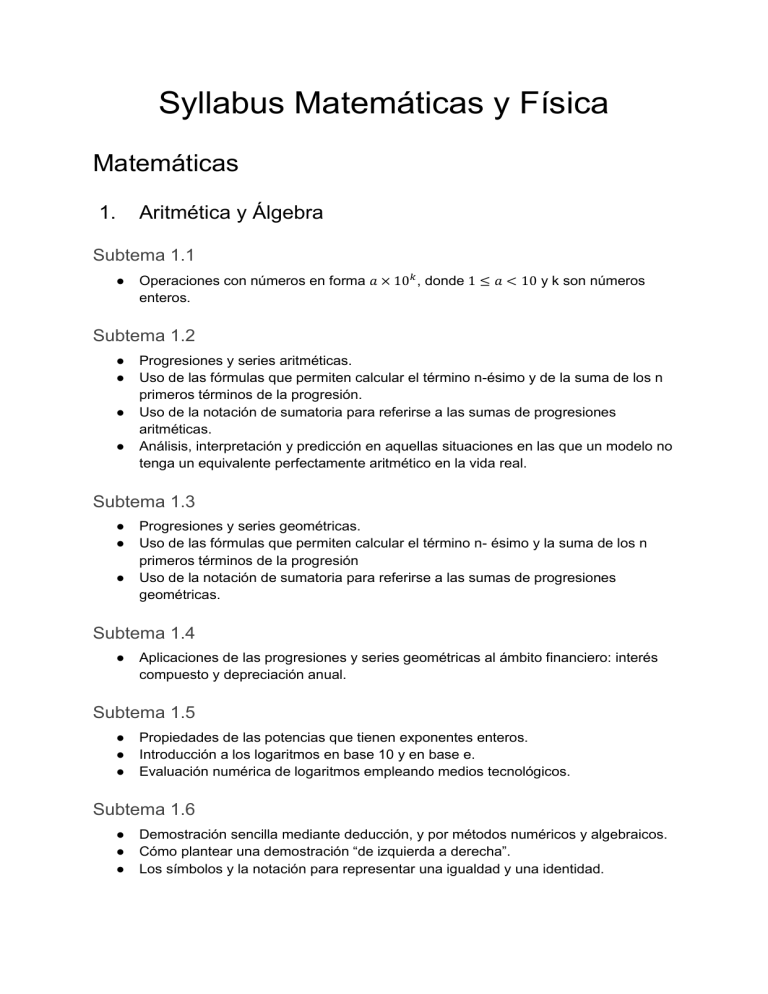 Syllabus Matemáticas y Física Matemáticas Aritmética y Álgebra 1. Subtema 1.1 β Operaciones con números en forma π × 10π , donde 1 ≤ π < 10 y k son números enteros. Subtema 1.2 β β β β Progresiones y series aritméticas. Uso de las fórmulas que permiten calcular el término n-ésimo y de la suma de los n primeros términos de la progresión. Uso de la notación de sumatoria para referirse a las sumas de progresiones aritméticas. Análisis, interpretación y predicción en aquellas situaciones en las que un modelo no tenga un equivalente perfectamente aritmético en la vida real. Subtema 1.3 β β β Progresiones y series geométricas. Uso de las fórmulas que permiten calcular el término n- ésimo y la suma de los n primeros términos de la progresión Uso de la notación de sumatoria para referirse a las sumas de progresiones geométricas. Subtema 1.4 β Aplicaciones de las progresiones y series geométricas al ámbito financiero: interés compuesto y depreciación anual. Subtema 1.5 β β β Propiedades de las potencias que tienen exponentes enteros. Introducción a los logaritmos en base 10 y en base e. Evaluación numérica de logaritmos empleando medios tecnológicos. Subtema 1.6 β β β Demostración sencilla mediante deducción, y por métodos numéricos y algebraicos. Cómo plantear una demostración “de izquierda a derecha”. Los símbolos y la notación para representar una igualdad y una identidad. Subtema 1.7 β β β β Propiedades de las potencias que tienen exponentes racionales. Propiedades de los logaritmos. Cambio de base en un logaritmo. Resolución de ecuaciones exponenciales, incluido el uso de logaritmos. Subtema 1.8 β La suma de progresiones geométricas convergentes infinitas. Subtema 1.9 β El teorema del binomio: desarrollo de (π + π)π , n ∈ N. β Uso del triángulo de Pascal y de πΆππ . Estadística y Probabilidad 2. Subtema 2.1 β β β β Concepto de población, muestra, muestra aleatoria, datos discretos y continuos. Fiabilidad de las fuentes de datos y sesgo del muestreo. Interpretación de los valores atípicos. Técnicas de muestreo y su eficacia Subtema 2.2 β β β β Presentación de datos (discretos y continuos); distribuciones de frecuencia (tablas). Histogramas Frecuencia acumulada; gráficos de frecuencia acumulada; su uso para hallar la mediana, los cuartiles, los percentiles, el rango y el rango intercuartil (RIC). Elaboración y comprensión de los diagramas de caja y bigote. Subtema 2.3 β β β β β β Medidas de tendencia central (media, mediana y moda). Estimación de la media a partir de datos agrupados. Clase modal. Medidas de dispersión (rango intercuartil, desviación típica y varianza). Efecto que tienen los cambios constantes sobre los datos originales. Cuartiles de datos discretos. Subtema 2.4 β β Correlación lineal de variables bidimensionales. Coeficiente de correlación momento-producto de Pearson (r). β β β Diagrama de dispersión; recta de ajuste óptimo (dibujada a ojo) que pasa por el punto correspondiente a la media. Ecuación de la recta de regresión de y sobre x. Uso de la ecuación de la recta de regresión para hacer predicciones Interpretar el significado de los parámetros a y b en una regresión lineal y = ax + b. Subtema 2.5 β Concepto de ensayo, resultado, resultados equiprobables, frecuencia relativa, espacio muestral (U) y suceso. β La probabilidad de un suceso A, es π(π΄) = π(π΅). Los sucesos complementarios A y A β ' (no A). Número esperado de ocurrencias. π(π΄) Subtema 2.6 β Uso de diagramas de Venn, diagramas de árbol, diagramas de espacio muestral y tablas de resultados para el cálculo de probabilidades. β Sucesos compuestos: P(A∪B) = P(A) + P(B) − P(A∩B). β Sucesos incompatibles: P(A∩B) = 0. β Probabilidad condicionada π(π΄|π΅) = β Sucesos independientes P(A∩B) = P(A)P(B). π(π΄∩π΅) . π(π΅) Subtema 2.7 β β Concepto de variable aleatoria discreta y su correspondiente distribución de probabilidad. Esperanza matemática (media) para datos discretos. Subtema 2.8 β Distribución binomial Media y varianza de la distribución binomial. Subtema 2.9 β β β β β La distribución normal y su curva correspondiente. Propiedades de la distribución normal. Representación mediante diagramas. Cálculo de probabilidades asociadas a la distribución normal. Proceso inverso del cálculo de probabilidades asociadas a una distribución normal. Subtema 2.10 β β Ecuación de la recta de regresión de x sobre y. Uso de esta ecuación para hacer predicciones. Subtema 2.11 β Definición formal y uso de las fórmulas π(π΄|π΅) = π(π΄∩π΅) para casos de probabilidad π(π΅) condicionada y P(A | B) = P(A) = P( A | B′ ) para sucesos independientes. Subtema 2.12 β β 3. Tipificación de la variable en una distribución normal (valores z). Proceso inverso de cálculos de probabilidades asociadas a una distribución normal cuando se desconoce el valor de la media y el de la desviación típica. Funciones Subtema 3.1 β β Diferentes formas de expresar la ecuación de una recta. Pendiente, intersecciones, rectas paralelas y perpendiculares. Subtema 3.2 β β β β β Concepto de función, dominio, recorrido y gráfico. Notación de funciones. Concepto de función como modelo matemático. El concepto informal de que la función inversa revierte o deshace el efecto de la función. Función inversa como simetría respecto a la recta y = x y la notación π −1 (π₯). Subtema 3.3 β β β El gráfico de una función; su ecuación π¦ = π(π₯). Crear un bosquejo a partir de la información dada o de un contexto; esto incluye el transferir un gráfico de la pantalla al papel. Uso de medios tecnológicos para representar gráficamente funciones, incluida la suma y la diferencia de funciones. Subtema 3.4 β β Determinar las características más importantes de un gráfico Hallar el punto de intersección de dos curvas o rectas util