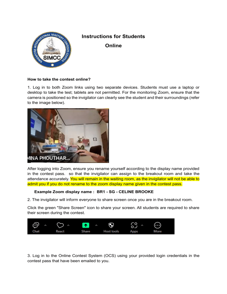 Instructions for Students Online How to take the contest online? 1. Log in to both Zoom links using two separate devices. Students must use a laptop or desktop to take the test; tablets are not permitted. For the monitoring Zoom, ensure that the camera is positioned so the invigilator can clearly see the student and their surroundings (refer to the image below). After logging into Zoom, ensure you rename yourself according to the display name provided in the contest pass. so that the invigilator can assign to the breakout room and take the attendance accurately. You will remain in the waiting room, as the invigilator will not be able to admit you if you do not rename to the zoom display name given in the contest pass. Example Zoom display name : BR1 - SG - CELINE BROOKE 2. The invigilator will inform everyone to share screen once you are in the breakout room. Click the green "Share Screen" icon to share your screen. All students are required to share their screen during the contest. 3. Log in to the Online Contest System (OCS) using your provided login credentials in the contest pass that have been emailed to you. https://simccocs.org/#!/login 4. After logging in, you will be prompted to enter a security key. Please do not spam the chat for the security key. Please wait at this step until everyone is ready, the invigilator will then provide the security key in the Zoom chat. Simply copy and paste it when you receive it. 5. After entering the security key, the contest will begin. Please only click the submit button once you have completed the contest. If you submit by mistake, please inform the invigilator immediately. 6. Once you have completed and submitted, please notify the invigilator. You may then leave the Zoom meeting. Important note: You are not allowed to share materials with anyone or reference/research for any material on the internet. If you have any issue during the competition, please type your questions on the chat and we will get back to you after we consult with Exam board. Please ensure that your video camera remains on for both the contest Zoom and the monitoring Zoom link throughout the entire contest.