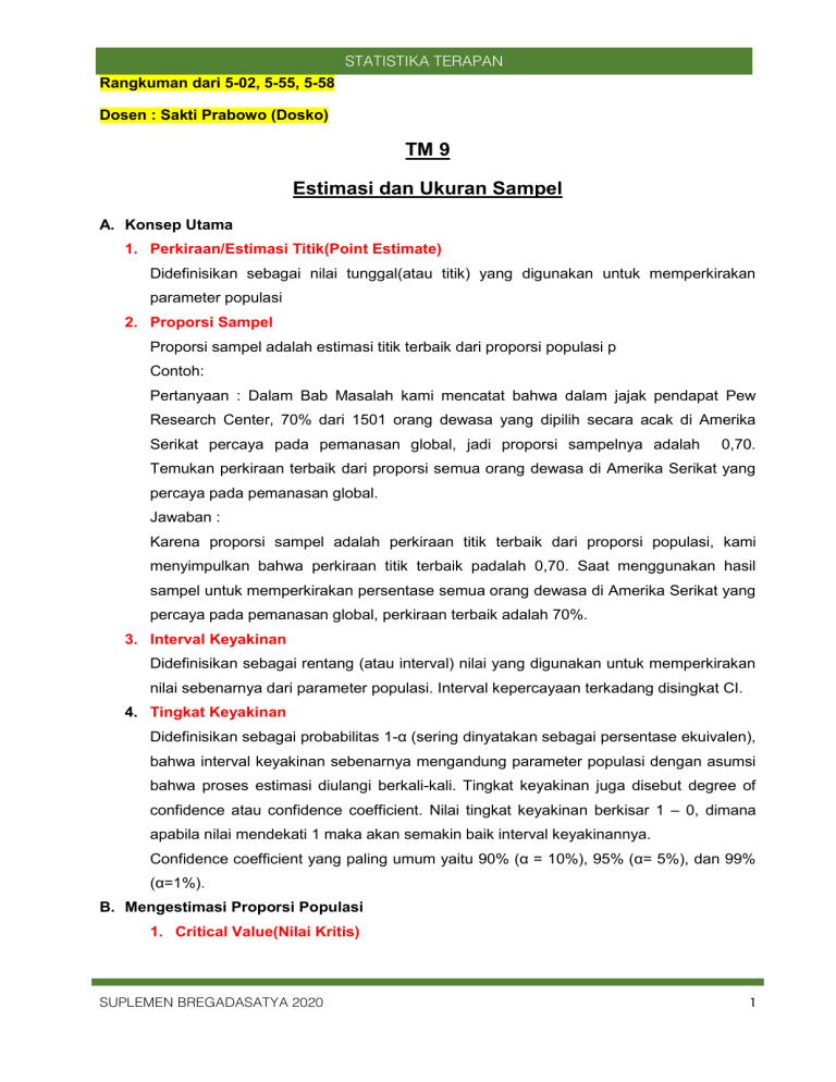 STATISTIKA TERAPAN Rangkuman dari 5-02, 5-55, 5-58 Dosen : Sakti Prabowo (Dosko) TM 9 Estimasi dan Ukuran Sampel A. Konsep Utama 1. Perkiraan/Estimasi Titik(Point Estimate) Didefinisikan sebagai nilai tunggal(atau titik) yang digunakan untuk memperkirakan parameter populasi 2. Proporsi Sampel Proporsi sampel adalah estimasi titik terbaik dari proporsi populasi p Contoh: Pertanyaan : Dalam Bab Masalah kami mencatat bahwa dalam jajak pendapat Pew Research Center, 70% dari 1501 orang dewasa yang dipilih secara acak di Amerika Serikat percaya pada pemanasan global, jadi proporsi sampelnya adalah 0,70. Temukan perkiraan terbaik dari proporsi semua orang dewasa di Amerika Serikat yang percaya pada pemanasan global. Jawaban : Karena proporsi sampel adalah perkiraan titik terbaik dari proporsi populasi, kami menyimpulkan bahwa perkiraan titik terbaik padalah 0,70. Saat menggunakan hasil sampel untuk memperkirakan persentase semua orang dewasa di Amerika Serikat yang percaya pada pemanasan global, perkiraan terbaik adalah 70%. 3. Interval Keyakinan Didefinisikan sebagai rentang (atau interval) nilai yang digunakan untuk memperkirakan nilai sebenarnya dari parameter populasi. Interval kepercayaan terkadang disingkat CI. 4. Tingkat Keyakinan Didefinisikan sebagai probabilitas 1-α (sering dinyatakan sebagai persentase ekuivalen), bahwa interval keyakinan sebenarnya mengandung parameter populasi dengan asumsi bahwa proses estimasi diulangi berkali-kali. Tingkat keyakinan juga disebut degree of confidence atau confidence coefficient. Nilai tingkat keyakinan berkisar 1 – 0, dimana apabila nilai mendekati 1 maka akan semakin baik interval keyakinannya. Confidence coefficient yang paling umum yaitu 90% (α = 10%), 95% (α= 5%), dan 99% (α=1%). B. Mengestimasi Proporsi Populasi 1. Critical Value(Nilai Kritis) SUPLEMEN BREGADASATYA 2020 1 STATISTIKA TERAPAN Nilai kritis adalah standar z score yang dapat digunakan untuk membedakan antara statistik sampel yang cenderung terjadi dan yang tidak mungkin terjadi. Nilai kritis didasarkan pada pengamatan berikut:Dalam kondisi tertentu, distribusi sampling dari proporsi sample dapat diperkirakan dengan distribusi normal. Z-score yang terkait dengan proporsi sampel memiliki kemungkinan α/2 berada di sisi kiri dan kanan ekor. Notasi untuk nilai kritis Nilai kritis z/2 adalah yang positif z nilai yang ada di batas vertikal yang memisahkan suatu area /2 di ekor kanan distribusi normal standar. (Nilai dari -z/2 berada di batas vertikal untuk area dari /2 di ekor kiri.) Subskrip /2 adalah hanya sebagai pengingat bahwa z skor memisahkan suatu daerah dari /2 di ekor kanan distribusi normal standar. Temuan z2 untuk 95% Tingkat kepercayaan diri = 5% 2 = 2,5% = 0,025 Temuan z2 untuk 95% Confidence Level – lanjutan SUPLEMEN BREGADASATYA 2020 2 STATISTIKA TERAPAN 2. Margin of error Margin of error adalah perbedaan kemungkinan maksimum (dengan probabilitas 1α) antara proporsi yang diamati dan nilai sebenarnya dari proporsi populasi p. Notasi: Keterangan: E = Margin of error p = population proportion n = jumlah sample values Zα/2 = z-score yang memisahkan area α/2 di sisi kanan dari distribusi normal standar. Ketika data dari sampel acak sederhana digunakan untuk memperkirakan proporsi populasi p, itu margin of error, dilambangkan dengan E, adalah perbedaan kemungkinan maksimum (dengan probabilitas 1 - , seperti 0,95) antara proporsi yang diamati dan nilai sebenarnya dari proporsi penduduk p. Margin kesalahan E juga disebut kesalahan maksimum dari perkiraan dan dapat ditemukan dengan mengalikan nilai kritis dan deviasi standar dari proporsi sampel. 3. Interval Keyakinan untuk Memperkirakan Proporsi Populasi p 1. Sampel adalah sampel acak sederhana. 2. Kondisi untuk distribusi binomial terpenuhi: ada sejumlah uji coba tetap, uji coba independen, ada dua kategori hasil, dan probabilitas tetap konstan untuk setiap uji coba. 3. Setidaknya ada 5 keberhasilan dan 5 kegagalan. Rumus: SUPLEMEN BREGADASATYA 2020 3 STATISTIKA TERAPAN Prosedur-Interval Keyakinan 1. Pastikan bahwa asumsi yang diperlukan terpenuhi. (Sampel adalah sampel acak sederhana, kondisi untuk distribusi binomial terpenuhi, dan distribusi normal dapat digunakan untuk memperkirakan distribusi proporsi sampel karena np lebih besar sama dengan 5, dan nq lebih besar sama dengan 5) 2. Lihat Tabel Z-Score dan temukan nilai kritis zα/2 yang sesuai dengan confidence level yang diinginkan. 3. Mengevaluasi margin kesalahan 4. Dengan menggunakan nilai margin kesalahan yang dihitung, E dan nilai proporsi sampel, p, cari nilai p - E dan p + E. Ganti nilai-nilai tersebut dalam format umum untuk confidence interval: 5. Aturan Pembulatan: Bulatkan nilai tersebut menjadi tiga angka dibelakang koma Contoh Soal: Pow Research Center dari 1501 orang dewasa AS yang dipilih secara acak menunjukkan bahwa 70% responden percaya pada pemanasan global. Hasil sampel adalah n = 1501, dan p ˆ = 0.70 a. Temukan margin kesalahan E yang sesuai dengan confidence interval 95%. b. Temukan estimasi confidence interval 95% dari proporsi populasi p c. Berdasarkan hasil, dapatkah kita menyimpulkan bahwa mayoritas orang dewasa percaya pada pemanasan global? d. Dengan asumsi bahwa Anda adalah seorang reporter surat kabar, tulislah pernyataan singkat yang secara akurat menjelaskan hasil dan mencakup semua informasi yang relevan. Jawaban a. Pemeriksaan persyaratan: sampel acak sederhana; jumlah percobaan tetap, 1501; uji coba bersifat independen; dua kategori hasil (percaya atau tidak); probabilitas tetap konstan. Catatan: jumlah keberhasilan dan kegagalan minimal 5. SUPLEMEN BREGADASATYA 2020 4 STATISTIKA TERAPAN Gunakan rumus untuk menemukan margin error b. Interval kepercayaan 95% c. Berdasarkan interval kepercayaan yang diperoleh pada bagian (b), terlihat bahwa proporsi orang dewasa yang percaya pada pemanasan global lebih besar dari 0,5 (atau 50%), sehingga dapat disimpulkan bahwa mayoritas orang dewasa percaya pada pemanasan global. Karena batas 