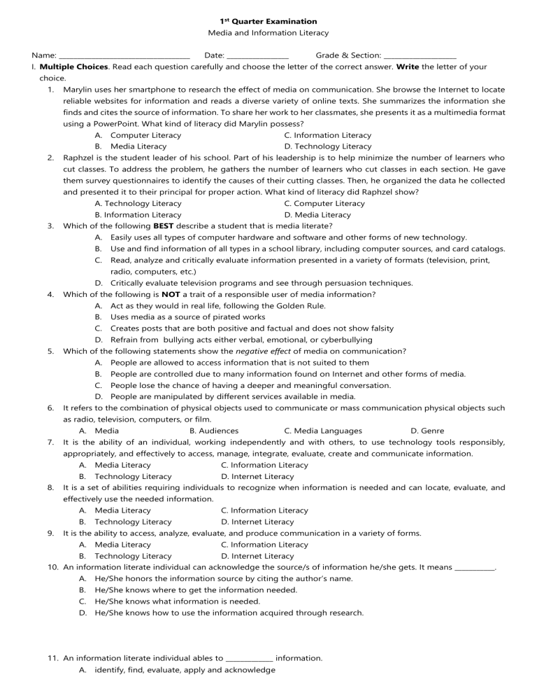 1st Quarter Examination Media and Information Literacy Name: ____________________________________ Date: _________________ Grade & Section: ____________________ I. Multiple Choices. Read each question carefully and choose the letter of the correct answer. Write the letter of your choice. 1. Marylin uses her smartphone to research the effect of media on communication. She browse the Internet to locate reliable websites for information and reads a diverse variety of online texts. She summarizes the information she finds and cites the source of information. To share her work to her classmates, she presents it as a multimedia format using a PowerPoint. What kind of literacy did Marylin possess? 2. A. Computer Literacy C. Information Literacy B. D. Technology Literacy Media Literacy Raphzel is the student leader of his school. Part of his leadership is to help minimize the number of learners who cut classes. To address the problem, he gathers the number of learners who cut classes in each section. He gave them survey questionnaires to identify the causes of their cutting classes. Then, he organized the data he collected and presented it to their principal for proper action. What kind of literacy did Raphzel show? 3. A. Technology Literacy C. Computer Literacy B. Information Literacy D. Media Literacy Which of the following BEST describe a student that is media literate? A. Easily uses all types of computer hardware and software and other forms of new technology. B. Use and find information of all types in a school library, including computer sources, and card catalogs. C. Read, analyze and critically evaluate information presented in a variety of formats (television, print, radio, computers, etc.) D. Critically evaluate television programs and see through persuasion techniques. 4. Which of the following is NOT a trait of a responsible user of media information? A. Act as they would in real life, following the Golden Rule. B. Uses media as a source of pirated works C. Creates posts that are both positive and factual and does not show falsity D. Refrain from bullying acts either verbal, emotional, or cyberbullying 5. Which of the following statements show the negative effect of media on communication? A. People are allowed to access information that is not suited to them B. People are controlled due to many information found on Internet and other forms of media. C. People lose the chance of having a deeper and meaningful conversation. D. People are manipulated by different services available in media. 6. It refers to the combination of physical objects used to communicate or mass communication physical objects such as radio, television, computers, or film. A. Media 7. B. Audiences C. Media Languages D. Genre It is the ability of an individual, working independently and with others, to use technology tools responsibly, appropriately, and effectively to access, manage, integrate, evaluate, create and communicate information. 8. A. Media Literacy C. Information Literacy B. D. Internet Literacy Technology Literacy It is a set of abilities requiring individuals to recognize when information is needed and can locate, evaluate, and effectively use the needed information. 9. A. Media Literacy C. Information Literacy B. D. Internet Literacy Technology Literacy It is the ability to access, analyze, evaluate, and produce communication in a variety of forms. A. Media Literacy C. Information Literacy B. D. Internet Literacy Technology Literacy 10. An information literate individual can acknowledge the source/s of information he/she gets. It means ___________. A. He/She honors the information source by citing the author’s name. B. He/She knows where to get the information needed. C. He/She knows what information is needed. D. He/She knows how to use the information acquired through research. 11. An information literate individual ables to _____________ information. A. identify, find, evaluate, apply and acknowledge B. ask, research, edit, copy and paste C. locate, research, edit, analyze and evaluate D. locate, research, analyze, evaluate and edit 12. This refers to the traditional means of communication and expression that have existed since before the advent of the internet. Examples are television, radio, movies, music studio, books, newspapers, magazines, and other print publications A. New Media B. Traditional Media C. Print Media D. Broadcast Media 13. This refers to a group of relatively recent mass media based on new information technology. It is based on computing technology and not reducible to communication in a traditional sense. A. New Media B. Traditional Media C. Print Media D. Broadcast Media 14. Which of the following is NOT TRUE about the pre-historic age of media? A. Human were able to communicate through writing symbols or drawing crude pictures. B. Barks of trees, bones of animals or sticks painted on with nature-found substances were used as recording devices of information C. Image recording and the invention of photography began during this era. D. Traditions and stories are passed down through oral means. 15. The Department of Tourism release a video advertisement to promote the Philippines to the entire world. It has faithfully depicted the cultures, peoples, places and all the colors and hues of the Filipino. What function of media does it play? A. facilitate informed debates between diverse social actors B. vehicle for cultural expression and cultural cohesion within and between nations C. builds a sense of self by creating a sense of community D. provide us with much of what we learn about the world beyond our immediate experience 16. An investigative report conducted by the GMA news program I-Witness on the Pork Barrel Scam. What function of media does this play? A. means by which a society learns about itself and builds a sense of community B. provide us with much of what we learn about the world beyond our immediate experience C. function as a watchdog of government in all it