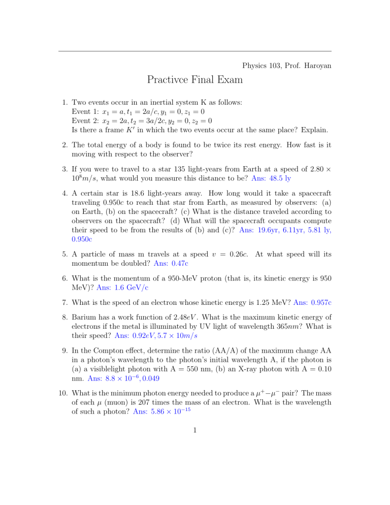 Physics 103, Prof. Haroyan Practivce Final Exam 1. Two events occur in an inertial system K as follows: Event 1: x1 = a, t1 = 2a/c, y1 = 0, z1 = 0 Event 2: x2 = 2a, t2 = 3a/2c, y2 = 0, z2 = 0 Is there a frame K ′ in which the two events occur at the same place? Explain. 2. The total energy of a body is found to be twice its rest energy. How fast is it moving with respect to the observer? 3. If you were to travel to a star 135 light-years from Earth at a speed of 2.80 × 108 m/s, what would you measure this distance to be? Ans: 48.5 ly 4. A certain star is 18.6 light-years away. How long would it take a spacecraft traveling 0.950c to reach that star from Earth, as measured by observers: (a) on Earth, (b) on the spacecraft? (c) What is the distance traveled according to observers on the spacecraft? (d) What will the spacecraft occupants compute their speed to be from the results of (b) and (c)? Ans: 19.6yr, 6.11yr, 5.81 ly, 0.950c 5. A particle of mass m travels at a speed v = 0.26c. At what speed will its momentum be doubled? Ans: 0.47c 6. What is the momentum of a 950-MeV proton (that is, its kinetic energy is 950 MeV)? Ans: 1.6 GeV/c 7. What is the speed of an electron whose kinetic energy is 1.25 MeV? Ans: 0.957c 8. Barium has a work function of 2.48eV . What is the maximum kinetic energy of electrons if the metal is illuminated by UV light of wavelength 365nm? What is their speed? Ans: 0.92eV, 5.7 × 10m/s 9. In the Compton effect, determine the ratio (AA/A) of the maximum change AA in a photon’s wavelength to the photon’s initial wavelength A, if the photon is (a) a visiblelight photon with A = 550 nm, (b) an X-ray photon with A = 0.10 nm. Ans: 8.8 × 10−6 , 0.049 10. What is the minimum photon energy needed to produce a µ+ −µ− pair? The mass of each µ (muon) is 207 times the mass of an electron. What is the wavelength of such a photon? Ans: 5.86 × 10−15 1 11. (a) What is the wavelength of a neutron (m = 1.67 × 10−27 kg) traveling at 8.5 × 104 m/s? (b) The speed of an electron (m = 9.11 × 10−31 kg) in a particle accelerator is 0.98c. Find its de Broglie wavelength. (Use relativistic momentum.) Ans: 4.7 × 10−12 m, 4.9 × 10−13 m 12. (a) Determine the wavelength of the second Balmer line (n = 4 to n = 2 transition). (b) Calculate the ionization energy of doubly ionized lithium, Li2+, which has Z = 3. (To ionize the atom means removing the electron, or raising it to zero energy) Ans: 490nm, 122eV 13. A hydrogen atom has an angular momentum of 5.273 × 10−34 kgm2 /s. According to the Bohr model, what is the energy (eV) associated with this state? Ans: 0.544eV 14. The neutrons in a parallel beam, each having kinetic energy 0.030 eV, are directed through two slits 0.60 mm apart. How far apart will the interference peaks be on a screen 1.0 m away? [Hint: First find the wavelength of the neutron.] Ans: 2.8 × 10−7m 15. (a) A radioactive element undergoes an alpha decay with a lifetime of 12µs. If alpha particles are emitted with 5.5keV kinetic energy, find the uncertainty ∆E/E in the particle energy. (b) A free neutron (m = 1.67 × 10−27 kg) has a mean life of 900s. What is the uncertainty in its mass (in kg)? (c)An electron and a 140g baseball are each traveling 95m/s measured to a precision of 0.085%. Calculate and compare the uncertainty in position of each. Ans: 1.0 × 10−14m, 3.00 × 10−10 eV /c2 , 1.4 × 10−3 m, 9.3 × 10−33 m 16. (I) A free electron has a wave function ψ(x) = Asin(2.0×1010 x), where x is given in meters. Determine the electron’s (a) wavelength, (b) momentum, (c) speed, and (d) kinetic energy. Ans: 3.1 × 10−10 m, 2.1 × 10−24 kgm/s, 2.3 × 106 m/s, 15eV 17. Write the wave function for (a) a free electron and (b) a free proton, each having a constant velocity v = 3.0 × 105 m/s. 2 Ans: ψ(x) = Asin[2.6 × 109 m−1 )x] + Bcos[(2.6 × 109 m−1 )x], ψ(x) = Asin[(4.7 × 1012 m−1 )x] + Bcos[(4.7 × 1012 m−1 )x] 18. An electron is trapped in a 1.00nm wide rigid box. Determine the probability of finding the electron within 0.15nm of the center of the box (on either side of center) for (a) n = 1, (b) n = 5, and (c) n = 20. (d) Compare to the classical prediction. Ans:0.56, 0.24, 0.30, the probabilities approach the classical value for large n 19. Consider a particle that can exist anywhere in space with a wave function given by 2 ψ(x) = b−1/2 |x/b|1/2 e−(x/b) /2 , where b = 1.0nm. (a) Check that the wave function is normalized. (b) What is the most probable position for the particle in the region x > 0? (c) What is the probability of finding the particle between x = 0nm and x = 0.50nm? Ans: 0.71nm, 0.11 20. List the quantum numbers for each electron in the ground state of (a) carbon (Z = 6), (b) aluminum (Z = 13). Ans: 21. (a) What is the approximate radius of a 112 48 Cd-nucleus? (b) Approximately what is the value of A for a nucleus whose radius is 3.7 X 10-15 m? Ans: 5.8f m, 29 22. Calculate the total binding energy, and the binding energy per nucleon, for (a) 7 197 3 Li, (b) 79 AU . Ans: 186.6M eV , 186.6M eV /23, 193.5M eV, 193.5M eV /24 23. What fraction of a sample is left after exactly 6 half-lives? ans: 0.015625 problems on particles will on the final but is not included here. 3