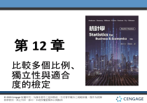 第 12 章 比較多個比例、 獨立性與適合 度的檢定 © 2020 Cengage 版權所有,為課本著作之延伸教材,亦受著作權法之規範保護,僅作為授課 教學使用,禁止列印、影印、未經授權重製和公開散佈 本章內容 • 12.1 檢定 3 個或以上母體的母體比例相等性 • 12.2 獨立性檢定 • 12.3 適合度檢定 第12章 比較多個比例、獨立性與適合度的檢定 第435頁 12.1 檢定 3 個或以上母體的母體比 例相等性 • 在本章中,我們將介紹 3 種假設檢定程序以擴展我們進 行母體統計推論的能力。 • 通過使用基於卡方 (𝜒 2 ) 分配的檢定統計量來考慮資料的 分類情況。 第12章 比較多個比例、獨立性與適合度的檢定 第436頁 檢定 3 個或以上母體的母體比例相 等性 • 使用符號如下: p1=母體 1 之母體比例 p2=母體 2 之母體比例 與 pk=母體 k 之母體比例 • k ≥ 3 個母體之母體比例相等性的假設如下: H0:p1=p2=⋯=pk Ha:並非所有的母體比例是相等的 第12章 比較多個比例、獨立性與適合度的檢定 第437頁 檢定 3 個或以上母體的母體比例相等性 • 若樣本資料與卡方檢定計算結果指出 H0 不可被拒絕,我 們不能偵測出 k 個母體比例中的差異 。 • 若樣本資料與卡方檢定結果指出 H0 可被拒絕,我們即有 統計證據做出並非所有的母體比例均相等的結論。 • 更進一步的分析,即可找出哪一部分的母體比例與其他 的母體比例有顯著差異。 第12章 比較多個比例、獨立性與適合度的檢定 第437頁 檢定 3 個或以上母體的母體比例相等性 • 假設在某研究中,欲比較雪佛蘭 Impala、褔特 Fusion 與 本田 Accord 3 款汽車的顧客忠誠度,所以目前擁有此 3 款汽車之一的車主,即構成該研究的 3 個母體: p1=雪佛蘭 Impala 車主之母體願意再購買 Impala 的比例 p2=褔特 Fusion 車主之母體願意再購買 Fusion 的比例 p3=本田 Accord 車主之母體願意再購買 Accord 的比例 • 假設說明如下: H 0 : p1 = p2 = p3 Ha:並非所有母體比例均相同 第12章 比較多個比例、獨立性與適合度的檢定 第437頁 檢定 3 個或以上母體的母體比例相等性 • 為完成此假設檢定,我們由這 3 個母體中各抽取 1 組車 主樣本。 • 每一樣本提供回答者願意或不願意再次購買該車的類別 資料。 第12章 比較多個比例、獨立性與適合度的檢定 第437頁 檢定 3 個或以上母體的母體比例相等性 第12章 比較多個比例、獨立性與適合度的檢定 第438頁 檢定 3 個或以上母體的母體比例相等性 • 下列公式可被用於提供在 H0 為真的假設下之期望次數。 • 在 H0 為真的假設下之期望次數 列 𝑖 總計 欄 𝑗 總計 𝑒𝑖𝑗 = 總樣本數 • 若觀察與期望次數間存在明顯差異,即可拒絕 H0 假設。 第12章 比較多個比例、獨立性與適合度的檢定 第438-439頁 檢定 3 個或以上母體的母體比例相等性 第12章 比較多個比例、獨立性與適合度的檢定 第439頁 檢定 3 個或以上母體的母體比例相等性 • 運用下列卡方統計量之計算方式: • 卡方檢定統計量 2 ( f e ) 2 ij ij i j eij 其中 fij=列 i 與欄 j 儲存格中之觀察次數 eij=在假設 H0 為真時之列 i 與欄 j 儲存格中之期望次數 • 注意:在 k 個母體比例之相同性的卡方檢定中,上面的 檢定統計量為 k-1 自由度之卡方分配,每一方塊的期望 次數為 5 或以上。 第12章 比較多個比例、獨立性與適合度的檢定 第439頁 檢定 3 個或以上母體的母體比例相等性 第12章 比較多個比例、獨立性與適合度的檢定 第439頁 母體變異數的假設檢定 • 拒絕法則 p 值法: 若 p 值 ≤ a ,則拒絕 H0 臨界值法: 若𝜒 2 ≥ 𝜒𝛼2 ,則拒絕 H0 此處卡方分配的自由度為 k-1,α 為顯著水準。 第12章 比較多個比例、獨立性與適合度的檢定 第441頁 檢定 3 個或以上母體的母體比例相等性 • 拒絕法則 ( 使用 a=0.05) 若𝜒 2 ≥ 5.991,則拒絕 H0 當 α=0.05 且自由度為 2 時 不拒絕 H0 拒絕 H0 2 5.991 第12章 比較多個比例、獨立性與適合度的檢定 第441頁 檢定 3 個或以上母體的母體比例相等性 • 使用 p 值法 • 我們可發現 χ2=7.89 右尾區域介於 0.025 與 0.01 之間, 其對應右尾區域或 p 值會介於 0.025 與 0.01,p 值 ≤ 0.05 ,故拒絕 H0,且得到這 3 個母體比例並非全等的結論。 第12章 比較多個比例、獨立性與適合度的檢定 第440-441頁 多重比較程序 • 我們已得到這 3 個母體比例並非全等的結論。 • 為證實母體比例差異存在於何處,我們會依賴多重比較 程序。 第12章 比較多個比例、獨立性與適合度的檢定 第441頁 多重比較程序 • 我們開始計算 3 個樣本比例如下: 品牌忠誠樣本比例 雪佛蘭 Impala 褔特 Fusion 本田 Accord 𝑝1ҧ = 69Τ125 = 0.5520 𝑝ҧ2 = 120Τ200 = 0.6000 𝑝ҧ3 = 123Τ175 = 0.7029 • 我們將討論一種多重比較程序,即 Marascuilo 程序 (Marascuilo procedure)。 第12章 比較多個比例、獨立性與適合度的檢定 第441頁 多重比較程序 • 計算成對樣本比例之間的差異 雪佛蘭 Impala 與褔特 Fusion p1 p2 0.5520 0.6000 0.0480 雪佛蘭 Impala 與本田 Accord 𝑝lj1 − 𝑝lj3 = 0.5520 − 0.7029 = 0.1509 褔特 Fusion 與本田 Accord 𝑝lj − 𝑝lj = 0.6000 − 0.7029 = 0.1029 2 3 第12章 比較多個比例、獨立性與適合度的檢定 第442頁 多重比較程序 • k 個母體比例的 Marasuilo 成對比較程序之臨界值 • 每一組成對比較之臨界值計算如下: 𝐶𝑉𝑖𝑗 = 𝜒𝛼2 𝑝lj𝑖 (1 − 𝑝lj 𝑖 ) 𝑝lj𝑗 (1 − 𝑝lj𝑗 ) + 𝑛𝑖 𝑛𝑗 • 其中 𝜒𝛼2 =顯著水準 α 與 k – 1個自由度之卡方 𝑝ҧ
