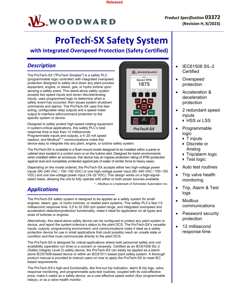 Released Product Specification 03372 (Revision H, 8/2023) ® ProTech‐SX Safety System with Integrated Overspeed Protection (Safety Certified) Description The ProTech-SX ("ProTech Simplex") is a safety PLC (programmable logic controller) with integrated overspeed protection designed to safely shut down any plant process equipment, engine, or steam, gas, or hydro turbine upon sensing a safety event. This stand-alone safety system accepts two speed inputs and seven discrete/analog inputs, uses programmed logic to determine when a safety event has occurred, then issues system shutdown commands and alarms. The ProTech-SX uses five fastacting, configurable relay outputs and a speed meter output to interface with/command protection to the specific system or device. Designed to safely protect high-speed rotating equipment in system-critical applications, this safety PLC’s total response time is less than 12 milliseconds. Programmable inputs and outputs, a 4–20 mA speed readout, and Modbus® * communications make this device easy to integrate into any plant, engine, or turbine safety system. IEC61508 SIL-2 Certified Overspeed protection Acceleration & deceleration protection 2 redundant speed inputs HSS or LSS Programmable logic 7 inputs Discrete or Analog Trip/alarm logic Test logic Auto test routines Trip valve health monitoring Trip, Alarm & Test logs Modbus communications Password security protection 12 millisecond response time The ProTech-SX is available in a flush-mount model designed to be installed within a panel or cabinet door located in a control room or on the turbine skid. Designed for harsh environments when installed within an enclosure, this device has an ingress protection rating of IP56 (protected against dust and completely protected against jets of water of similar force to heavy seas). Depending on the model ordered, the ProTech-SX accepts either two high-voltage power inputs (90–240 VAC / 100–150 VDC) or one high-voltage power input (90–240 VAC / 100–150 VDC) and one low-voltage power input (18–32 VDC). This design works on a high-signalselect basis, allowing the unit to fully operate with either or both power sources available. *—Modbus is a trademark of Schneider Automation Inc. Applications The ProTech-SX safety system is designed to be applied as a safety system for small engines, steam, gas, or hydro turbines, or related plant systems. This safety PLC’s fast (12 millisecond) response time, 0.5 to 32 000 rpm speed range, and integrated overspeed and acceleration detection/protection functionality, make it ideal for application on all types and sizes of turbines or engines. Alternatively, this stand-alone safety device can be configured to protect any plant system or device, and report the system’s/device’s status to the plant DCS. The ProTech-SX’s versatile inputs, outputs, programming environment, and communications make it ideal as a safety protection device for use in small applications that could possibly reach an unsafe state or condition and that must communicate directly to the plant DCS. The ProTech-SX is designed for critical applications where both personnel safety and unit availability (operation run time) is a concern or necessity. Certified as an IEC61508 SIL-2 (Safety Integrity Level 2) safety device, the ProTech-SX can easily be applied as a standalone IEC61508-based device or within an IEC61511-based plant safety system. A thorough product manual is provided to instruct users on how to apply the ProTech-SX to meet IEC based requirements. The ProTech-SX’s high-end functionality, like first-out trip indication, alarm & trip logs, valve response monitoring, and programmable auto-test routines, coupled with its cost-effective price, make it useful as a safety device, as a cost effective speed switch (four programmable relays), or as a valve health monitor. Released Interface with related control systems or plant DCS’s (Distributed Control Systems) can be performed via the ProTech-SX’s hard-wired inputs and outputs or through its serial Modbus communication port. Optionally, an Ethernet gateway can be purchased to easily interface with a plant Ethernet network. Functionality Programming—The ProTech-SX functions as a safety PLC, as it accepts seven discrete or analog inputs, and allows users to create custom safety/protection programs to protect site personnel and equipment. Programmers are able to utilize typical logic and testing sequence routines to create their application-specific safety logic and tests. On-Line Testing—The ProTech-SX can be tested manually from the module’s front panel, Modbus communications port, or automatically via its auto-test routine function. The ProTech-SX allows users to configure overspeed or customprogrammed manual or automatic performance tests. Trip, Alarm, & Overspeed Logs—The ProTech-SX log function logs (saves to memory) all trips, alarms, trip valve response times, and overspeed events. The trip log function uses a scrolling buffer and records the last 50 sensed trip or alarm events and the last 20 overspeed events to memory, with associated times. Each log file is viewed from the unit’s front panel, or downloaded to a computer via the ProTech-SX service tool program. Each module utilizes non-volatile memory to ensure secure capture of all logged events, even on loss of power. Trip Valve Health Monitoring—The ProTech-SX can be configured to test, log, and alarm on the response time of a turbine trip valve. Using the trooper’s built-in valve response monitoring function, users can connect a valve position sensor (limit switch, pressure switch) to a ProTech-SX input and configure the ProTech-SX to monitor, log, and alarm the period between sending a trip command and receipt of a valve-closed indication. Real Time Clock—Each ProTech-SX utilizes a real-time clock to ensure accurate time logging. Alternatively, one of the ProTech-SX inputs can be configured to accept a discrete 
