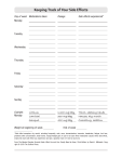 Keeping Track of Your Side Effects Day of week Medications taken Dosage Side effects experienced* Lithium Lamictal 1,200 mg/day 300 mg/day Thirst, shaking hands Nausea, dry mouth Seroquel 400 mg/day Overeating, sedation Monday Tuesday Wednesday Thursday Friday Saturday Sunday Example: Monday Weight at beginning of week End of week *Side effect examples: dry mouth, urinating frequently, rash, acne, stomachaches, insomnia, headaches, fatigue, hair loss, problems with concentration, hand tremor, hunger/weight gain. If you’re not sure which medication causes which side effect, simply list each side effect you experience and put a question mark (?) next to each one. From The Bipolar Disorder Survival Guide: What You and Your Family Need to Know, Third Edition, by David J. Miklowitz. Copyright © 2019 The Guilford Press. The Pros and Cons of Taking Medications REASONS TO TAKE MOOD MEDICATIONS (Examples: they help control my manic symptoms, help with my depressed mood, improve my sleep, make me better able to focus, decrease my anxiety, improve the way I relate to other people, decrease my conflict with family members, improve my energy level, make me feel more confident, help me concentrate better at work, keep me from spending too much money, help me avoid traffic tickets) 1. 2. 3. 4. 5. (continued) From The Bipolar Disorder Survival Guide: What You and Your Family Need to Know, Third Edition, by David J. Miklowitz. Copyright © 2019 The Guilford Press. 7KH3URVDQG&RQVRI7DNLQJ0HGLFDWLRQV (continued) DISADVANTAGES OF MOOD MEDICATIONS (Examples: side effects [give specifics], miss my high periods, cost of medications and psychiatry visits, dislike having my moods controlled, dislike my doctor, dislike making medical appointments, feel less sexual or less creative, medications carry a stigma, medications aren’t that effective) 1. 2. 3. 4. 5. (continued) 7KH3URVDQG&RQVRI7DNLQJ0HGLFDWLRQV (continued) THINGS I CAN DO TO IMPROVE THE SITUATION (Examples: discuss side effects with physician, consider other medications or dosing strategies, take more responsibility for renewing my prescriptions, change my doctor, change my insurance plan, educate others about my disorder, create reminders to take my tablets, cut down my use of alcohol or drugs) 1. 2. 3. 4. 5. Mood Chart MOOD Name Month/Year Circle date to indicate menses mg mg mg mg mg mg mg Weight: Note. WNL = Within normal limits. Adapted by permission of Gary Sachs, MD (Copyright 1993). From The Bipolar Disorder Survival Guide: What You and Your Family Need to Know, Third Edition, by David J. Miklowitz. Copyright © 2019 The Guilford Press. Mod. Severe Psychotic Symptoms Strange Ideas, Hallucinations NO SYMPTOMS Mild Significant Impairment NOT ABLE TO WORK MOOD NOT DEFINITELY ELEVATED OR DEPRESSED Significant Impairment ABLE TO WORK Mild Without significant impairment Mod. Without significant impairment Hours Slept Last Night Anxiety Irritability Verbal Therapy Lithium Benzodiazepine Anticonvulsant Depakote Antidepressant Antipsychotic Daily Notes Severe Significant Impairment ABLE TO WORK (Enter number of tablets taken each day) 0 = none 1 = mild 2 = moderate 3 = severe Significant Impairment NOT ABLE TO WORK TREATMENTS Rate with 2 marks each day to indicate best and worst (if applicable) Depressed WNL Elevated THE SOCIAL RHYTHM METRIC (SRM) MacArthur Foundation Mental Health Research Network I Please fill this out at the end of the day. Day of Week: TIME MOOD RATING (Choose one): PEOPLE SAMPLE ACTIVITY (for reference only) 2 Children Spouse/ Partner √ Check If ALONE 6:20 P.M. ACTIVITY Check A.M. Describe your mood today: Other Family Members Other Person(s) 1 = Just Present 2 = Actively Involved 3 = Others Very Stimulating 3 4 5 Very Elated CLOCK TIME 2 Check If DID NOT DO Scale –5 –4 –3 –2 –1 0 1 Very Depressed Normal Date: 1 Out of bed First contact (in person or by phone) with another person Have morning beverage Have breakfast Go outside for the first time Start work, school, housework, volunteer activities, child or family care Have lunch Take an afternoon nap Have dinner Physical exercise Have an evening snack/drink Watch an evening tv news program Watch another tv program Activity A Activity B Return home (last time) Go to bed Reprinted by permission from Monk et al. (1991). Copyright © 1991 Elsevier Science. Reprinted by permission in The Bipolar Disorder Survival Guide: What You and Your Family Need to Know, Third Edition, by David J. Miklowitz (2019, The Guilford Press). Scheduling Pleasurable Activities Mood before and after each activity (–3 to +3) Day of the week and target time Pleasurable activities Actual time of day each activity was done (Before) (After) Monday 1. 1. 2. 2. 1. 1. 2. 2. Wednesday 1. 1. 2. 2. 1. 1. 2. 2. 1. 1. 2. 2. 1. 1. 2. 2. 1. 1. 2. 2. Tuesday Thursday Friday Saturday Sunday From The Bipolar Disorder Survival Guide: What You and Your Family Need to Know, Third Edition, by David J. Miklowitz. Copyright © 2019 The Guilford Press. Impact of Your Behavior Activation Plan Day of the week Things you did that day Mood Check (9) if you that day followed your (–3 to +3) activity plan Monday Tuesday Wednesday Thursday Friday Saturday Sunday Average mood rating for the days you followed your plan Average mood rating for the days you did not follow your plan From The Bipolar Disorder Survival Guide: What You and Your Family Need to Know, Third Edition, by David J. Miklowitz. Copyright © 2019 The Guilford Press. A Quick Fact Sheet on Bipolar Disorder IRUb)DPLO\b0HPEHUV What Is Bipolar Disorder? Having bipolar disorder means that I have severe mood swings, in which I go from a very highly energized state (mania, or a milder form called hypomania) to a very low, unmotivated, and lethargic state (depression). My high periods may last from a few days to a month or more. My low periods may last much longer, from several weeks to several months. About 1 in every 50 people has bipolar disorder. It most often a