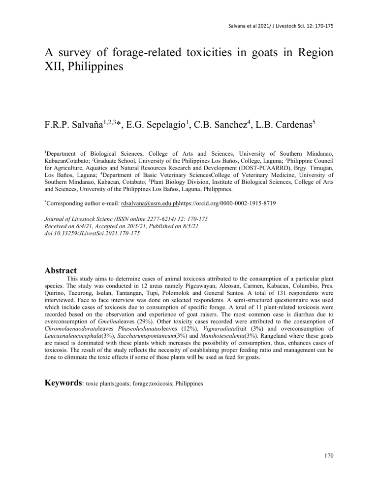 Salvana et al 2021/ J Livestock Sci. 12: 170-175 A survey of forage-related toxicities in goats in Region XII, Philippines F.R.P. Salvaña1,2,3*, E.G. Sepelagio1, C.B. Sanchez4, L.B. Cardenas5 1 Department of Biological Sciences, College of Arts and Sciences, University of Southern Mindanao, KabacanCotabato; 2Graduate School, University of the Philippines Los Baños, College, Laguna; 3Philippine Council for Agriculture, Aquatics and Natural Resources Research and Development (DOST-PCAARRD), Brgy. Timugan, Los Baños, Laguna; 4Department of Basic Veterinary SciencesCollege of Veterinary Medicine, University of Southern Mindanao, Kabacan, Cotabato; 5Plant Biology Division, Institute of Biological Sciences, College of Arts and Sciences, University of the Philippines Los Baños, Laguna, Philippines. * Corresponding author e-mail: rdsalvana@usm.edu.phhttps://orcid.org/0000-0002-1915-8719 Journal of Livestock Scienc (ISSN online 2277-6214) 12: 170-175 Received on 6/4/21, Accepted on 20/5/21, Published on 8/5/21 doi.10.33259/JLivestSci.2021.170-175 Abstract This study aims to determine cases of animal toxicosis attributed to the consumption of a particular plant species. The study was conducted in 12 areas namely Pigcawayan, Aleosan, Carmen, Kabacan, Columbio, Pres. Quirino, Tacurong, Isulan, Tantangan, Tupi, Polomolok and General Santos. A total of 131 respondents were interviewed. Face to face interview was done on selected respondents. A semi-structured questionnaire was used which include cases of toxicosis due to consumption of specific forage. A total of 11 plant-related toxicosis were recorded based on the observation and experience of goat raisers. The most common case is diarrhea due to overconsumption of Gmelinaleaves (29%). Other toxicity cases recorded were attributed to the consumption of Chromolaenaodorataleaves Phaseoluslunatusleaves (12%), Vignaradiatafruit (3%) and overconsumption of Leucaenaleucocephala(3%), Saccharumspontaneum(3%) and Manihotesculenta(3%). Rangeland where these goats are raised is dominated with these plants which increases the possibility of consumption, thus, enhances cases of toxicosis. The result of the study reflects the necessity of establishing proper feeding ratio and management can be done to eliminate the toxic effects if some of these plants will be used as feed for goats. Keywords: toxic plants;goats; forage;toxicosis; Philippines 170 Salvana et al 2021/ J Livestock Sci. 12: 170-175 Introduction In animals, it can be noted that plant related poisoning is due to either accidental ingestion of material consumed along with forages or willful consumption of poisonous plants (Mugera, 1970). Various studies suggest that plant-related toxicosis is common to livestock animals considering their diet composition. Moreover, their capacity to access preferred and desirable plant species is also associated with poisoning events. Limited pasture results in an increasing incidence of animal poisoning (Damiran and Darambazar, 2003). Non-conventional forage as a supplement to the poor quality and inadequate grasses during the dry season can be also attributed to plantrelated poisoning which is common in the tropics (Olafadehan, 2011). Unlike the public’s perception of a goat, an animal that can eat everything from a tin can to plastic wrapping, there are many things that can be detrimental to goats. Some poisonous plants are accidentally ingested while browsing. However, the majority of goat poisoning comes as a result of starvation. Goats may eat unpalatable weeds and wild shrubs that may be poisonous. Most literature suggests that goats are often not affected by poisonous compounds or anti-nutritional factors if a sufficient number of high quality forages are available. Since goats prefer to consume a very varied diet, the detrimental effects of poisonous compounds found is a certain forage can be diluted (Luginbuhl, 2006). Poisoning events also depend on grazing behavior and animal susceptibility to plant toxins. In most cases, lesser production losses are observed when animals grazed on several species of forages compared to single species consumption. Moreover, variations on the palatability of plants to animals also affect cases of poisoning (Ralphs and Provenza, 1990). Case reports on plant-related animal toxicosis are limited. These events are seldom evaluated by livestock technicians especially in backyard raising. More often than not, parasitic infections and other infectious diseases are emphasized. Losses due to goat poisoning are also evident. Navarra et al. (2019) recorded more than 60 death cases recorded in the Bangsamoro Autonomous Region in Muslim Mindanao (BARMM)and this mortality, according to raisers, is due to overconsumption of Urenalobata which is the only available forage during that period. Cardiac glycoside, a toxic compound to most animals, is present in this plant which can be the main reason for the recorded mortality (Fagbohun et al., 2012). This study aims to determine plant-related toxicosis of goats, specifically in Region XII, Philippines. Goat population in the region reaches 226,794 which accounts for 4.90% of the total population in the country as of 2018 (PSA, 2018). To date, there are no available information on the plant-related toxicosis in the region. Materials and methods Location of the study The study was conducted in selected areas of Region XII- Phillipines. Respondents were from 12 sampling areas in the region: Pigcawayan, Aleosan, Carmen, Kabacan, Columbio, Pres. Quirino, Tacurong, Isulan, Tantangan, Tupi, Polomolok and General Santos (Fig. 1). Fig 1. Location of the respondents 171 Salvana et al 2021/ J Livestock Sci. 12: 170-175 Respondents and sampling procedures A total of 131 respondents were interviewed. Prior informed consent was sent to each municipality/city.Meetings with the Provincial Agricultural Officer, Municipal Agricultural Officers, livestock technicians and Barangay Chairpersons of the different