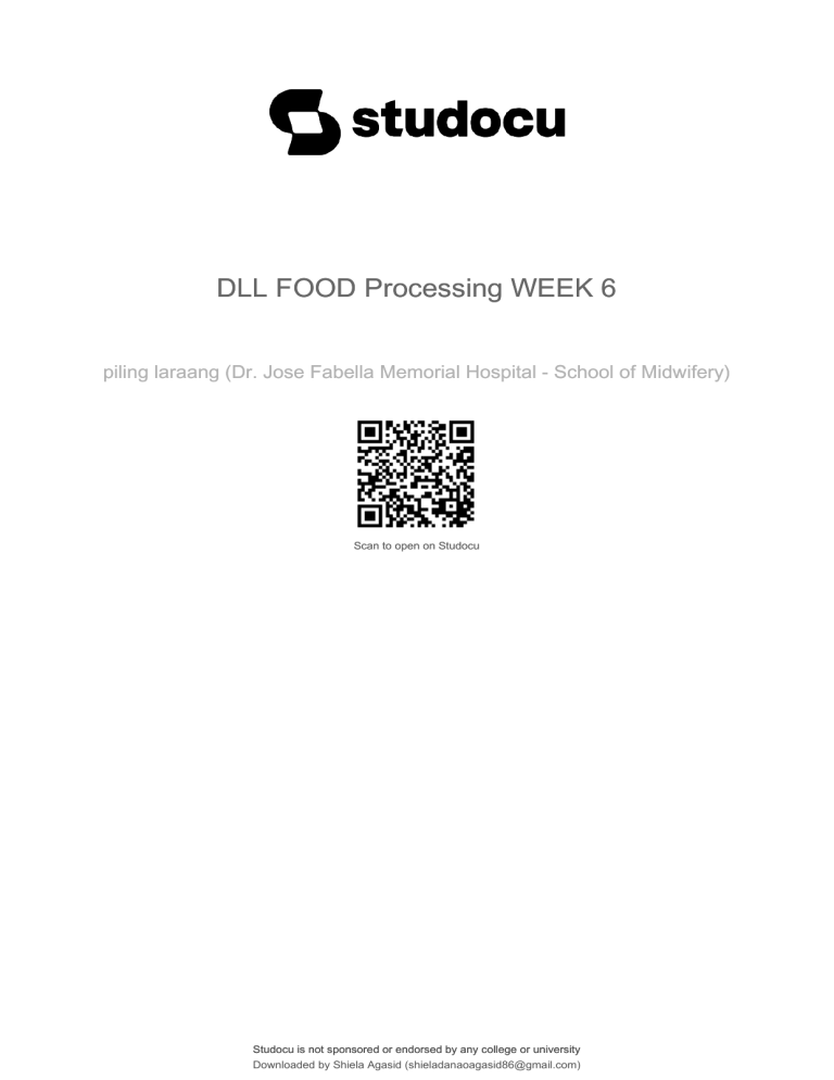 lOMoARcPSD|21454561 DLL FOOD Processing WEEK 6 piling laraang (Dr. Jose Fabella Memorial Hospital - School of Midwifery) Scan to open on Studocu Studocu is not sponsored or endorsed by any college or university Downloaded by Shiela Agasid (shieladanaoagasid86@gmail.com) lOMoARcPSD|21454561 DAILY LESSON LOG (DLL) Inosloban-Marawoy Integrated National High School Marilou B. Rodriguez Nedalene D. Samonte Teacher Violeta T. Macalintal Christine E. Naoquines Teaching Dates March 20 –24, 2023 School Session 1 I. OBJECTIVES 1. Content Standards 2. Performance Standards 3. Learning Competencies/ Objectives Grade Level 7 Learning Area TLE- FOOD PROCESSING Session 2 Quarter THIRD- WEEK 6 Session 3 Session 4 The learner demonstrates understanding on processing food by salting, curing and smoking. The learner demonstrates independently the procedures of processing food by salting, curing and smoking. LO 3. Prepare Salting LO 3. Prepare Salting LO 3. Prepare Salting LO 3. Prepare Salting and Curing Solutions and Curing Solutions and Curing Solutions and Curing Solutions and Mixtures and Mixtures and Mixtures and Mixtures 3.1 3.1 Measure and weigh 3.1 Measure and weigh 3.1 Measure and weigh Measure and weigh required ingredients for required ingredients for required ingredients for required ingredients for pumping pickle, cover pumping pickle, cover pumping pickle, cover pumping pickle, cover pickle and dry cure pickle and dry cure pickle and dry cure pickle and dry cure mixture mixture in line with mixture in line with mixture in line with in line with approved approved speci昀椀cations. approved speci昀椀cations. approved speci昀椀cations. speci昀椀cations. 3.2 Create a simple 3.2 Create a simple 3.2 Create a simple 3.2 Create a simple recipe recipe of food processing recipe of food processing recipe of food of food processing by by salting, curing and by salting, curing and processing by salting, salting, curing and smoking. smoking. curing and smoking. smoking. 3.3 demonstrate the 3.3 demonstrate the 3.3 demonstrate the 3.3 demonstrate the procedures how to procedures how to procedures how to procedures how to preserved foods. preserved foods. preserved foods. preserved foods. TLE_AFFP9-12SL-lh-i-3 TLE_AFFP9-12SL-lh-i- TLE_AFFP9-12SL-lh-i-3 TLE_AFFP9-12SL-lh-i-3 3 PECS: Risk-taking PECS: Risk-taking Downloaded by Shiela Agasid (shieladanaoagasid86@gmail.com) lOMoARcPSD|21454561 Corresponding Behavior: Placing self in situations involving a challenge or moderate risk Prepare Salting and Curing Solutions and Mixtures II. CONTENT III. LEARNING RESOURCES A. References 1. Teacher’s Guide pages 2. Learner’s Materials pages 3. Textbook pages 4. Additional Materials from Learning Resource (LR) portal Prepare Salting and Curing Solutions and Mixtures Corresponding Behavior: Placing self in situations involving a challenge or moderate risk Prepare Salting and Curing Solutions and Mixtures N/A N/A https:// www.youtube.com/ watch?v=OyUh7dBbI88 https:// www.youtube.com/ watch?v=pp7hIYVxHWU N/A N/A https:// www.youtube.com/ watch?v=OyUh7dBbI88 https:// www.youtube.com/watch? v=OyUh7dBbI88 B. Other Learning Resources Materials IV. PROCEDURES A. Reviewing previous lesson or presenting the new lesson Let’s recall: 1. Prepare Salting and Curing Solutions and Mixtures Let’s recall: 1. What is preservation? Let’s recall: 1. What do you think is 2. What are the di昀昀erent the easiest way or method in preserving the types of preservation? meat? Explain your 2. answer. Downloaded by Shiela Agasid (shieladanaoagasid86@gmail.com) lOMoARcPSD|21454561 2. Which method of preservation is better and why? B. Establishing a purpose for the lesson How do you preserve fruit, vegetables, meat and 昀椀sh? Presenting a video Let’s answer this Activity! Let’s answer this Activity! Directions: Directions: (The student will be watching the proper process of meat preservation) Choose the correct preservation method. 1. a. Cooling b. Freezing 3. Drying 2. a. Cooling b. Freezing c. Drying 3. a. Cooling Downloaded by Shiela Agasid (shieladanaoagasid86@gmail.com) Choose the correct preservation method. 1. a. Cooling b. Freezing 3. Drying 2. a. Cooling b. Freezing c. Drying 3. a. Cooling b. Freezing c. Drying lOMoARcPSD|21454561 b. Freezing c. Drying 4. a. Canning b. Freezing c. Drying 5. a. Canning b. Pickling c. Drying C. Presenting examples/ instances of the lesson What can you say about the pictures? Basic Meat Preservation: 1. Salting-the food is either soaked in salt solution or salt is rubbed on it. The salt draws the water out of the bacterial cells, thus killing them. Downloaded by Shiela Agasid (shieladanaoagasid86@gmail.com) 4. a. Canning b. Freezing c. Drying 5. a. Canning b. Pickling c. Drying lOMoARcPSD|21454561 2. Curing- refers to various preservation and 昀氀avoring processes, especially of meat or 昀椀sh, by the addition of a combination of salt, sugar, or nitrate. What have you notice? 3. Smoking-the food is held over a wood昀椀re. This kills the bacteria and moles and gives the food a delicious 昀氀avor. D. Discussing new concepts and practicing new skills #1 Directions: Presenting a video Directions: 1.Choose your desired preservation (Salting, Curing, Pickling, Jammaking). https:// www.youtube.com/ watch? v=0C29BpsJRNg&t=8s 1.Choose your desired preservation (Salting, Curing, Pickling, Jammaking). 2. List all the ingredients that you are going to used in preparing this preservation. (The student will be watching curing meat with salt) 3.Write the proper steps in making this. Downloaded by Shiela Agasid (shieladanaoagasid86@gmail.com) 2. List all the ingredients that you are going to used in preparing this preservation. 3.Write the proper steps in making this. lOMoARcPSD|21454561 E. Discussing new concepts and practicing new skills #2 For your Rubrics: Ingredients and Adjuncts for Salting, Curing and Smoking - Salt - Water - Sugar - Nitrate and Nitrite - Vinegar - Spices - Binders, Fil