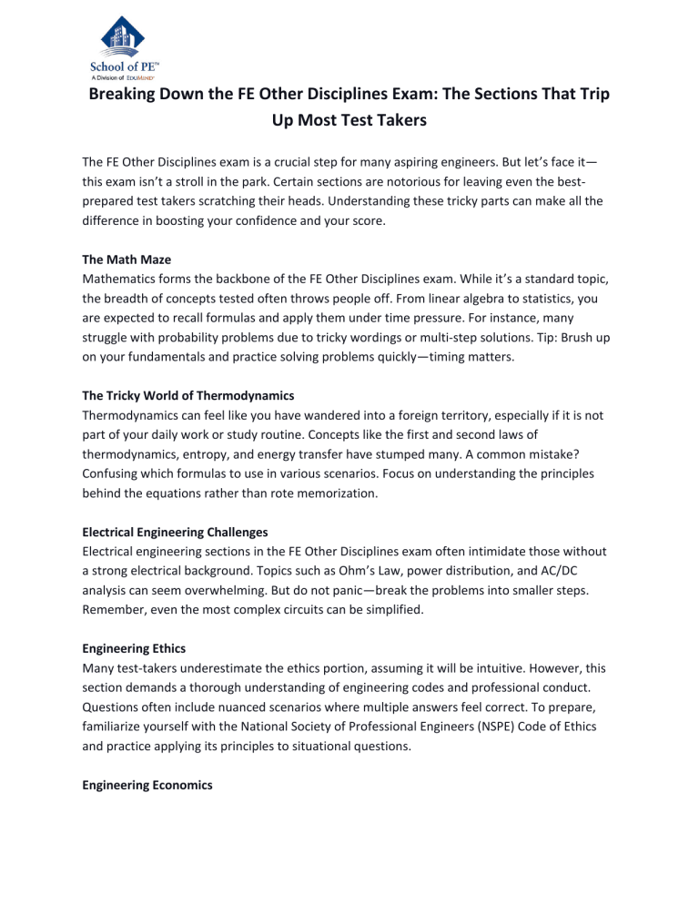 Breaking Down the FE Other Disciplines Exam: The Sections That Trip Up Most Test Takers The FE Other Disciplines exam is a crucial step for many aspiring engineers. But let’s face it— this exam isn’t a stroll in the park. Certain sections are notorious for leaving even the bestprepared test takers scratching their heads. Understanding these tricky parts can make all the difference in boosting your confidence and your score. The Math Maze Mathematics forms the backbone of the FE Other Disciplines exam. While it’s a standard topic, the breadth of concepts tested often throws people off. From linear algebra to statistics, you are expected to recall formulas and apply them under time pressure. For instance, many struggle with probability problems due to tricky wordings or multi-step solutions. Tip: Brush up on your fundamentals and practice solving problems quickly—timing matters. The Tricky World of Thermodynamics Thermodynamics can feel like you have wandered into a foreign territory, especially if it is not part of your daily work or study routine. Concepts like the first and second laws of thermodynamics, entropy, and energy transfer have stumped many. A common mistake? Confusing which formulas to use in various scenarios. Focus on understanding the principles behind the equations rather than rote memorization. Electrical Engineering Challenges Electrical engineering sections in the FE Other Disciplines exam often intimidate those without a strong electrical background. Topics such as Ohm’s Law, power distribution, and AC/DC analysis can seem overwhelming. But do not panic—break the problems into smaller steps. Remember, even the most complex circuits can be simplified. Engineering Ethics Many test-takers underestimate the ethics portion, assuming it will be intuitive. However, this section demands a thorough understanding of engineering codes and professional conduct. Questions often include nuanced scenarios where multiple answers feel correct. To prepare, familiarize yourself with the National Society of Professional Engineers (NSPE) Code of Ethics and practice applying its principles to situational questions. Engineering Economics Time value of money, interest rates, and cost analysis are common in the engineering economics section. These problems often trip up test takers because they blend math with realworld applications. Practice solving a variety of these problems to develop a systematic approach. How to Tackle the Challenges The key to conquering the FE Other Disciplines exam is preparation. Don’t just read textbooks— use practice exams to simulate the test environment. Identify your weak areas early and devote extra time to those topics. Additionally, create a study plan that includes regular review sessions to reinforce your knowledge. While the FE Other Disciplines exam can be challenging, it’s manageable with the right mindset and preparation. Don’t let the tough sections scare you off. Tackle each topic head-on, and remember, every problem has a solution—you just have to find it. Want to overcome these common pitfalls and enhance your FE Other Disciplines exam prep? School of PE offers expert-led FE exam prep courses to help you pass the exam on your first try. Enroll now and maximize your chances of success! Visit @ https://www.schoolofpe.com/fe-general