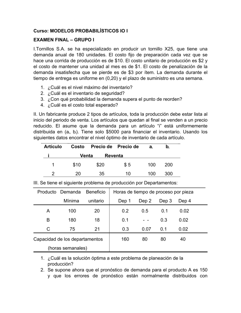 Curso: MODELOS PROBABILÍSTICOS IO I EXAMEN FINAL – GRUPO I I.Tornillos S.A. se ha especializado en producir un tornillo X25, que tiene una demanda anual de 180 unidades. El costo fijo de preparación cada vez que se hace una corrida de producción es de $10. El costo unitario de producción es $2 y el costo de mantener una unidad al mes es de $1. El costo de penalización de la demanda insatisfecha que se pierde es de $3 por ítem. La demanda durante el tiempo de entrega es uniforme en (0,20) y el plazo de suministro es una semana. 1. ¿Cuál es el nivel máximo del inventario? 2. ¿Cuál es el inventario de seguridad? 3. ¿Con qué probabilidad la demanda supera el punto de reorden? 4. ¿Cuál es el costo total esperado? II. Un fabricante produce 2 tipos de artículos, toda la producción debe estar lista al inicio del periodo de venta. Los artículos que quedan al final se venden a un precio reducido. El asume que la demanda para un artículo “i” está uniformemente distribuida en (ai, bi). Tiene solo $5000 para financiar el inventario. Usando los siguientes datos encontrar el nivel óptimo de inventario de cada artículo. Artículo Costo i Precio de Venta Precio de ai bi Reventa 1 $10 $20 $5 100 200 2 20 35 10 100 300 III. Se tiene el siguiente problema de producción por Departamentos: Producto Demanda Beneficio Horas de tiempo de proceso por pieza Mínima unitario Dep 1 Dep 2 Dep 3 Dep 4 A 100 20 0.2 0.5 0.1 0.02 B 180 18 0.1 - - 0.3 0.02 C 75 21 0.3 0.07 0.1 0.02 Capacidad de los departamentos 160 80 80 40 (horas semanales) 1. ¿Cuál es la solución óptima a este problema de planeación de la producción? 2. Se supone ahora que el pronóstico de demanda para el producto A es 150 y que los errores de pronóstico están normalmente distribuidos con desviación estándar 15. Si se selecciona = 0.10, cuál es la cantidad óptima a producir de cada tipo de producto que maximice las utilidades?