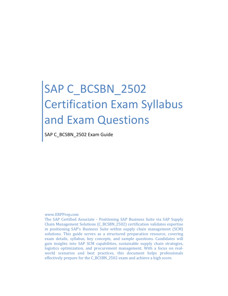 SAP C_BCSBN_2502 Certification Exam Syllabus and Exam Questions SAP C_BCSBN_2502 Exam Guide www.ERPPrep.com The SAP Certified Associate - Positioning SAP Business Suite via SAP Supply Chain Management Solutions (C_BCSBN_2502) certification validates expertise in positioning SAP's Business Suite within supply chain management (SCM) solutions. This guide serves as a structured preparation resource, covering exam details, syllabus, key concepts, and sample questions. Candidates will gain insights into SAP SCM capabilities, sustainable supply chain strategies, logistics optimization, and procurement management. With a focus on realworld scenarios and best practices, this document helps professionals effectively prepare for the C_BCSBN_2502 exam and achieve a high score. Positioning SAP Business Suite via SAP Supply Chain Management Solutions C_BCSBN_2502 PDF Introduction to SAP Certified Associate Positioning SAP Business Suite via SAP Supply Chain Management Solutions Exam Positioning SAP Business Suite via SAP Supply Chain Management Solutions (C_BCSBN_2502) preparation guide helps you to get focused on exam. This guide also helps you to be on the C_BCSBN_2502 exam track to get certified with a good score in the final exam. C_BCSBN_2502 Positioning SAP Business Suite via SAP Supply Chain Management Solutions Exam Summary ● Exam Name: SAP Certified Associate - Positioning SAP Business Suite via SAP Supply Chain Management Solutions ● Exam Code: C_BCSBN_2502 » SAP Positioning SAP Business Suite via SAP Supply Chain Management Solutions Certification Online Practice Test ● Level: Associate ● Duration: 60 mins ● Number of Questions: 30 ● Passing Score: 70% ● Reference Books / Trainings: Positioning SAP Supply Chain Solutions ● Schedule Exam: SAP Learning Positioning SAP Business Suite via SAP Supply Chain Management Solutions 1 Positioning SAP Business Suite via SAP Supply Chain Management Solutions C_BCSBN_2502 PDF ● Sample Questions: Positioning SAP Business Suite via SAP Supply Chain Management Solutions Certification Sample Question ● Recommended Practice: Positioning SAP Business Suite via SAP Supply Chain Management Solutions Certification Practice Exam Exam Syllabus: C_BCSBN_2502 SAP Certified Associate Positioning SAP Business Suite via SAP Supply Chain Management Solutions Topic Areas Positioning SAP Business Suite via SAP Supply Chain Management Solutions Weighting 100% SAP C_BCSBN_2502 Certification Sample Questions and Answers To make you familiar with Positioning SAP Business Suite via SAP Supply Chain Management Solutions (C_BCSBN_2502) certification exam structure, we have prepared this sample question set. We suggest you to try our Sample Questions for Positioning SAP Business Suite via SAP Supply Chain Management Solutions C_BCSBN_2502 Certification to test your understanding of SAP C_BCSBN_2502 process with a real SAP certification exam environment. C_BCSBN_2502 Positioning SAP Business Suite via SAP Supply Chain Management Solutions Sample Questions:01. What approaches does SAP SCM apply to ensure sustainable development of supply chains? Please choose the correct answer. a) Focuses only on the financial aspects of sustainability. b) Simplifies integration only for short-term successes. c) Supports strategies for the reuse and recycling of resources. d) Helps avoid strategic planning. 02. What capabilities does SAP Business Network offer for real-time supply chain approaches? Please choose the correct answer. a) Isolates delivery and planning functions. b) Limits the ability to adapt to changing market requirements. c) Allows for long-term discussions on implementing solutions. Positioning SAP Business Suite via SAP Supply Chain Management Solutions 2 Positioning SAP Business Suite via SAP Supply Chain Management Solutions C_BCSBN_2502 PDF d) Optimizes real-time interaction across all aspects of the supply chain. 03. Which SAP Supply Chain solution helps businesses plan and execute global trade operations efficiently? Please choose the correct answer. a) SAP Business One b) SAP BusinessObjects Analytics c) SAP Concur d) SAP Global Trade Services (GTS) 04. Which SAP solutions contribute to efficient warehouse and logistics management? There are 2 correct answers to this question. a) SAP Extended Warehouse Management (EWM) b) SAP HCM c) SAP Transportation Management (TM) d) SAP Predictive Analytics 05. How can small businesses leverage SAP SCM to enhance procurement management? Please choose the correct answer. a) SAP SCM offers automation and analytics tools to improve supplier selection processes. b) Supports procurement without integration with core business processes. c) Limits the ability to interact with suppliers. d) Requires large investments with slow returns. 06. A global retail company is struggling with inventory inaccuracies, slow order fulfillment, and inefficient warehouse space utilization. They need an SAP solution that improves real-time inventory tracking, optimizes warehouse layout, and automates stock replenishment. Which SAP solutions should they implement? There are 3 correct answers to this question. a) SAP Extended Warehouse Management (EWM) b) SAP Integrated Business Planning (IBP) c) SAP SuccessFactors d) SAP Predictive Analytics e) SAP Transportation Management (TM) Positioning SAP Business Suite via SAP Supply Chain Management Solutions 3 Positioning SAP Business Suite via SAP Supply Chain Management Solutions C_BCSBN_2502 PDF 07. What are the benefits of implementing SAP Integrated Business Planning (IBP) in supply chain planning? Please choose the correct answer. a) Used exclusively for long-term strategic planning. b) Affects only logistical processes. c) SAP IBP allows demand and supply planning to be balanced in real-time. d) Does not support collaborative planning across departments. 08. Which SAP solution enables collaboration between manufacturers, suppliers, and logistics providers in a digital supply chain? Please cho