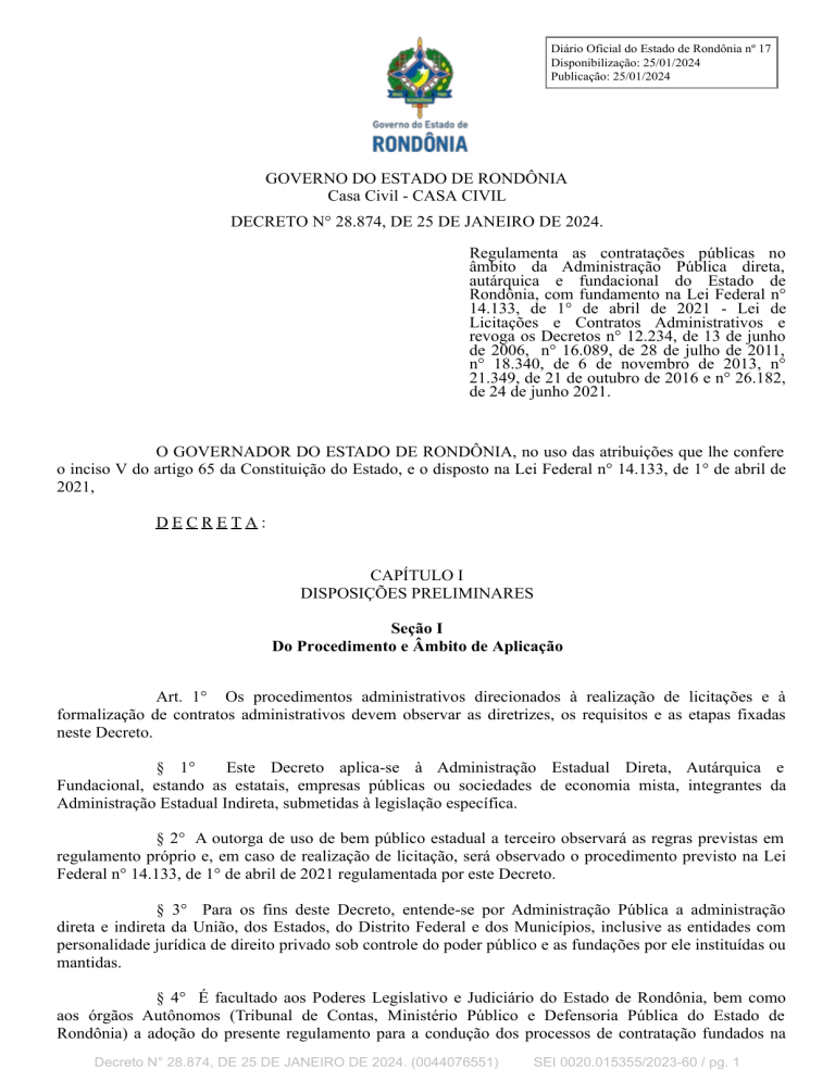 Diário Oficial do Estado de Rondônia nº 17 Disponibilização: 25/01/2024 Publicação: 25/01/2024 GOVERNO DO ESTADO DE RONDÔNIA Casa Civil - CASA CIVIL DECRETO N° 28.874, DE 25 DE JANEIRO DE 2024. Regulamenta as contratações públicas no âmbito da Administração Pública direta, autárquica e fundacional do Estado de Rondônia, com fundamento na Lei Federal n° 14.133, de 1° de abril de 2021 - Lei de Licitações e Contratos Administrativos e revoga os Decretos n° 12.234, de 13 de junho de 2006, n° 16.089, de 28 de julho de 2011, n° 18.340, de 6 de novembro de 2013, n° 21.349, de 21 de outubro de 2016 e n° 26.182, de 24 de junho 2021. O GOVERNADOR DO ESTADO DE RONDÔNIA, no uso das atribuições que lhe confere o inciso V do artigo 65 da Constituição do Estado, e o disposto na Lei Federal n° 14.133, de 1° de abril de 2021, DECRETA: CAPÍTULO I DISPOSIÇÕES PRELIMINARES Seção I Do Procedimento e Âmbito de Aplicação Art. 1° Os procedimentos administrativos direcionados à realização de licitações e à formalização de contratos administrativos devem observar as diretrizes, os requisitos e as etapas fixadas neste Decreto. § 1° Este Decreto aplica-se à Administração Estadual Direta, Autárquica e Fundacional, estando as estatais, empresas públicas ou sociedades de economia mista, integrantes da Administração Estadual Indireta, submetidas à legislação específica. § 2° A outorga de uso de bem público estadual a terceiro observará as regras previstas em regulamento próprio e, em caso de realização de licitação, será observado o procedimento previsto na Lei Federal n° 14.133, de 1° de abril de 2021 regulamentada por este Decreto. § 3° Para os fins deste Decreto, entende-se por Administração Pública a administração direta e indireta da União, dos Estados, do Distrito Federal e dos Municípios, inclusive as entidades com personalidade jurídica de direito privado sob controle do poder público e as fundações por ele instituídas ou mantidas. § 4° É facultado aos Poderes Legislativo e Judiciário do Estado de Rondônia, bem como aos órgãos Autônomos (Tribunal de Contas, Ministério Público e Defensoria Pública do Estado de Rondônia) a adoção do presente regulamento para a condução dos processos de contratação fundados na Decreto N° 28.874, DE 25 DE JANEIRO DE 2024. (0044076551) SEI 0020.015355/2023-60 / pg. 1 Lei nº 14.133, de 2021, podendo, ainda, estabelecer fluxos e manuais próprios, desde que observadas as normas gerais estabelecidas na Lei n° 14.133, de 2021. Seção II Das Definições Art. 2° Para os fins deste Decreto, consideram-se: I - agente de contratação: servidor, designado pela autoridade máxima do órgão de licitação, competente para tomar decisões, acompanhar o trâmite da licitação, dar impulso ao procedimento licitatório, conduzir a sessão pública e executar quaisquer outras atividades necessárias ao bom andamento do certame até a homologação; II - autoridade competente: agente público dotado de poder de decisão no âmbito daquele processo administrativo; III - membros de comissão: servidores designados para conduzir processamentos de licitação que envolvam bens ou serviços especiais, composta por, no mínimo, 3 (três) membros, designados pela autoridade máxima do órgão; IV - equipe de apoio: conjunto de agentes públicos designados pela autoridade máxima, podendo ser composto também por terceiros contratados, que têm a função de auxiliar o agente de contratação ou a comissão de contratação na condução dos procedimentos licitatórios ou auxiliares; V - equipe de planejamento: conjunto de servidores, designados pela autoridade competente do órgão, por função própria do cargo ou por designação, que reúnem as competências necessárias à completa execução das etapas de Planejamento da Contratação, o que inclui conhecimentos sobre aspectos técnicos e de uso do objeto, licitações e contratos, dentre outros; VI - gestão de contrato: a coordenação das atividades relacionadas à fiscalização técnica, administrativa e setorial e dos atos preparatórios à instrução processual e ao encaminhamento da documentação pertinente ao setor de contratos para a formalização dos procedimentos relativos à prorrogação, à alteração, ao reequilíbrio, ao pagamento, à eventual aplicação de sanções e à extinção dos contratos, entre outros; VII - fiscalização técnica: o acompanhamento do contrato com o objetivo de avaliar a execução do objeto nos moldes contratados e, se for o caso, aferir se a quantidade, a qualidade, o tempo e o modo da prestação ou da execução do objeto estão compatíveis com os indicadores estabelecidos no edital, para fins de pagamento, conforme o resultado pretendido pela administração, com o eventual auxílio da fiscalização administrativa; VIII - fiscalização administrativa: o acompanhamento dos aspectos administrativos contratuais quanto às obrigações previdenciárias, fiscais e trabalhistas e quanto ao controle do contrato administrativo no que se refere à revisões, reajustes, repactuações e providências tempestivas nas hipóteses de inadimplemento; e IX - fiscalização setorial: o acompanhamento da execução do contrato nos aspectos técnicos ou administrativos quando a prestação do objeto ocorrer concomitantemente em setores distintos ou em unidades desconcentradas de um órgão ou uma entidade. CAPÍTULO II DOS AGENTES PÚBLICOS Seção I Do Agente de Contratação, da Comissão de Contratação, da Equipe de Apoio e da Equipe de Decreto N° 28.874, DE 25 DE JANEIRO DE 2024. (0044076551) SEI 0020.015355/2023-60 / pg. 2 Planejamento Art. 3° O agente de contratação, os membros da comissão de contratação, equipe de apoio e da equipe de planejamento, assim como os demais agentes públicos que atuarem em procedimentos de contratações públicas, deverão preencher os seguintes requisit