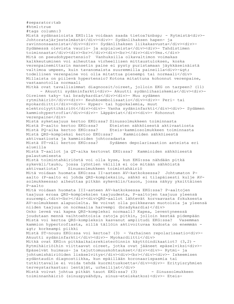 #separator:tab #html:true #tags column:3 Mistä sydänasioista EKG:lla voidaan saada tietoa?&nbsp;- Rytmistä<div>- Johtoratajärjestelmästä</div><div>- Sydänlihaksen hapen- ja ravinnonsaannista</div><div>- Sydänlihaksen liikakasvusta</div><div>- Sydämessä olevista vaurio- ja arpialueista</div><div>- Tahdistimen toiminnasta</div><div><br></div><div><br></div><div>Yms.</div> Mitä on pseudohypertensio?Vanhuksilla olkavaltimon voimakas kalkkeutuminen voi aiheuttaa virheellisen mittaustuloksen, koska verenpainemittarin mansetin paine ei pysty puristamaan jäykkäseinäistä valtimoa umpeen, kuin tavanomaista suuremmilla paineilla<div>-&gt; todellinen verenpaine voi olla mitattua pienempi tai normaali</div> Millaista on piilevä hypertensio?Kotona mitattuna kohonnut verenpaine, vastaanotolla normaali Mitkä ovat tavallisimmat diagnoosit/oireet, jolloin EKG on tarpeen? (11)- Akuutti sydäninfarkti<div>- Akuutti sydänlihasiskemia</div><div>- Oireinen taky- tai bradykardia</div><div>- Muu sydämen rytmihäiriö</div><div>- Keuhkoembolisaatio</div><div>- Peri- tai myokardiitti</div><div>- Hyper- tai hypokalemia, muut elektrolyyttihäiriöt</div><div>- Vanha sydäninfarkti</div><div>- Sydämen kammiohypertrofia</div><div>- Läppäviat</div><div>- Kohonnut verenpaine</div> Mistä syketaajuus kertoo EKG:ssa?Sinussolmukkeen toiminnasta Mistä P-aalto kertoo EKG:ssa?Eteisten sähköisestä aktivaatiosta Mistä PQ-aika kertoo EKG:ssa?Eteis-kammiosolmukkeen toiminnasta Mistä QRS-kompleksi kertoo EKG:ssa?Kammioiden sähköisestä aktivaatiosta ja kammioiden johtoradasta Mistä ST-väli kertoo EKG:ssa?Sydämen depolarisaation asteista eri alueilla Mistä T-aallot ja QT-aika kertovat EKG:ssa?Kammioiden sähköisestä palautumisesta Mistä toimintahäiriöstä voi olla kyse, kun EKG:ssa nähdään pitkä sykeväli/tauko, jossa lyöntien välillä ei ole mitään sähköistä aktivaatiota?Sinussolmukkeen toimintahäiriö Mitä voidaan huomata EKG:ssa II-asteen AV-katkoksessa?Johtumaton P-aalto (P-aalto ei johda QRS-kompleksiin, sähkö ei tilapäisesti kulje AV-solmukkeessa) aiheuttaa pitkän sykevälin/tauon, jossa näkyy yksittäinen P-aalto Mitä voidaan huomata III-asteen AV-katkoksessa EKG:ssa?P-aaltojen taajuus eroaa QRS-kompleksien taajuudesta, P-aaltojen taajuus yleensä suurempi.<div><br></div><div>QRS-aallot lähtevät korvaavasta fokuksesta AV-solmukkeen alapuolelta. Ne voivat olla poikkeavan muotoisia ja yleensä niiden taajuus on normaalia harvempi (bradykardia)</div> Onko leveä vai kapea QRS-kompleksi normaali?Kapea, leventyneessä joudutaan mennä vaihtoehtoisia ratoja pitkin, jolloin kestää pidempään Mistä voi kertoa QRS-kompleksin kasvanut amplitudi EKG:ssa?Vasemman kammion hypertrofiasta, sillä tällöin aktivoituvaa kudosta on enemmän -&gt; korkeampi piikki Mistä ST-nousu EKG:ssa voi kertoa? (3)- Varhainen repolarisaatio<div>- Akuutti sydäninfarkti</div><div>- Myokardiitti</div> Mitkä ovat EKG:n pitkäaikaisrekisteröinnin käyttöindikaatiot? (3,2)- Rytmihäiriöihin viittaavat oireet, jotka ovat jääneet epäselviksi<div>- Epäselvät huimaus- ja tajuttomuuskohtaukset</div><div>- Rytmi- ja johtumishäiriöiden lisäselvitys</div><div><br></div><div>- Iskeemisen sydäntaudin diagnostiikka, kun epäillään koronaarispasmia tai tutkittavalle ei voida tehdä kuormituskoetta</div><div>- Erityisryhmien terveystarkastus: lentäjät, urheilijat</div> Mistä voivat johtua pitkät tauot EKG:ssa? (3)- Sinussolmukkeen toiminnanhäiriö (sinuspysähdys, sinus-eteiskatkos)<div>- Eteis-kammiosolmukkeen toiminnanhäiriö (II asteen eteis-kammiokatkos)</div><div>- Hidas eteisvärinä</div> Mistä voi johtua sinusbradykardia? (3)Taustalla voi olla esim. parasympatikotonia, hidastava lääkitys tai sinussolmukkeen toiminnanhäiriö Mitä kuuluu hitaisiin rytmihäiriöihin? (2)Pitkät tauot<div>Hidaslyöntisyys</div> Mistä sinustakykardia voi johtua? (4)Esim.:<div>kilpirauhasen liikatoiminta</div><div>hypoksemia</div><div>keuhkosairaus</div><div>sydämen vajaatoiminta</div> Milloin kliininen kuormituskoe on hyödyllinen? (6)- Iskemiaa aiheuttavan sepelvaltimotaudin diagnostiikka, kun ensisijaisia tutkimuksia ei ole käytettävissä<div>- Sepelvaltimotaudin vaikeusasteen ja ennusteen arviointi, mikäli sillä on merkitystä jatkotutkimusten tai hoidon valinnassa</div><div>- Sepelvaltimotautipotilaan hoidon vasteen seuranta</div><div>- Hengenahdistuksen syyn selvittäminen (spiroergometria)</div><div>- Rytmihäiriöiden diagnostiikka</div><div>- Verenkierto- ja hengityselimistön toimintakyvyn ja kokonaistoimintakyvyn määrittäminen</div> Sepelvaltimotaudin ennusteen arvioiminen:<div>sydäntapahtuman suurentunutta riskiä kuormituskokeessa kuvaa: (5)</div>- Matala suorituskyky<div>- Selvät iskeemiseksi sopivat EKG-muutokset</div><div>- Tyypillinen rintakipuoire</div><div>- Systolisen verenpaineen nousun puuttuminen tai lasku</div><div>- Kammiotakykardia tai runsas kammiolisälyöntisyys kuormituksessa tai palautumisvaiheessa</div> Mitkä ovat spiroergometriassa mitattavat suureet? (3)- Hapenkulutus<div>- Hiilidioksidin tuotto</div><div>- Minuuttiventilaatio</div> Mitkä ovat spiroergometriassa laskettavia suureita? (5)- Hapenkulutus/paino, ml/kg/min<div>- Hengitysosamäärä, VCO2/VO2</div><div>- Happipulssi, VO2/syketaajuus</div><div>- Hiilidioksidin hengitysekvivalentti, VE/VCO2</div><div>- Hengitysreservi, (MVV-VEmax)/MVV x 100</div> Mistä suorituskyvyn lasku voi johtua keuhkosairauksissa? (3)- Keuhkoputkien ahtautumisesta (COPD, astma)<div>- Keuhkotilavuuden pienenemisestä (keuhkokudoksen sairaudet, resektion jälkitila, rintakehän epämuodostumat)</div><div>- Keuhkojen kaasujenvaihtokyvyn alenemisesta (keuhkokudoksen sairaudet, emfyseema, embolian jälkitila)</div> Mitkä ovat spiroergometrian käyttöindikaatiot? (3)- Rasitushengenahdistuksen syyn selvittäminen (sydän- vai keuhkoperäinen?)<div>- Suorituskyvyn alenemisen syyn selvittäminen (sydän-, keuhko- vai lihasperä