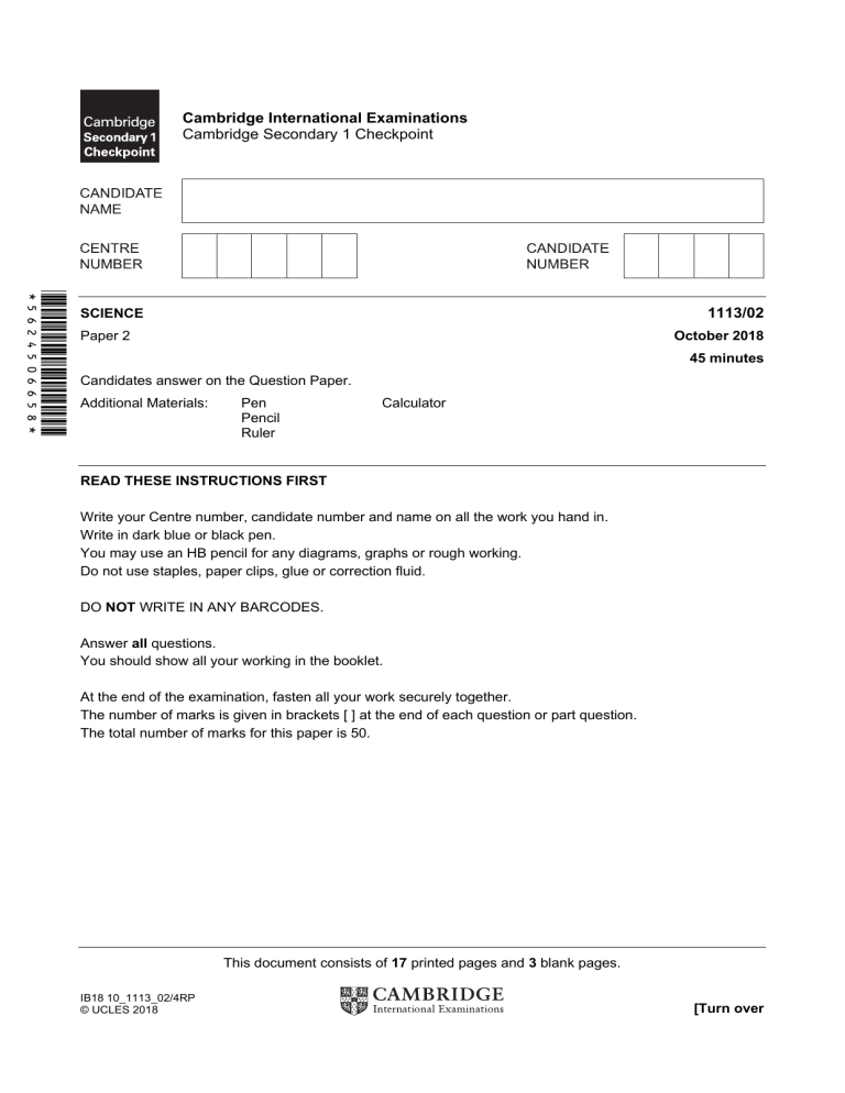 Cambridge International Examinations Cambridge Secondary 1 Checkpoint 1113/02 SCIENCE Paper 2 October 2018 45 minutes Candidates answer on the Question Paper. Additional Materials: Pen Pencil Ruler Calculator READ THESE INSTRUCTIONS FIRST Write your Centre number, candidate number and name on all the work you hand in. Write in dark blue or black pen. You may use an HB pencil for any diagrams, graphs or rough working. Do not use staples, paper clips, glue or correction fluid. DO NOT WRITE IN ANY BARCODES. Answer all questions. You should show all your working in the booklet. At the end of the examination, fasten all your work securely together. The number of marks is given in brackets [ ] at the end of each question or part question. The total number of marks for this paper is 50. This document consists of 17 printed pages and 3 blank pages. IB18 10_1113_02/4RP © UCLES 2018 [Turn over 2 1 Draw a straight line from each function to the correct plant cell. Draw only two lines. function plant cell absorbs water and minerals from soil transports water and minerals [2] © UCLES 2018 1113/02/O/N/18 3 2 Reactions between metals and non-metals form compounds. (a) Sulfur reacts with metals to form a type of compound called a sulfide. Complete the table to show the type of compound formed by different non-metals. One has been done for you. non-metal type of compound chlorine oxygen sulfur sulfide [2] (b) Iron reacts with a compound and oxygen to form rust. What is the name of this compound? [1] 3 Gabriella connects an electrical circuit. A1 A4 A2 A3 There are two lamps and four ammeters in the circuit. The lamps are identical. The reading on A1 is 0.8 A. What are the readings on the other ammeters? A2 is A. A3 is A. A4 is A. © UCLES 2018 [2] 1113/02/O/N/18 [Turn over 4 4 The diagram shows a frog. Scientists classify animals with backbones into five main vertebrate groups. Classify the frog into its correct vertebrate group. Give one reason for your answer. vertebrate group reason [2] © UCLES 2018 1113/02/O/N/18 5 5 Rajiv draws pictures of the stars in the night sky from his bedroom window. He draws a picture in January. He draws a picture in June. (a) Write down one difference between the two pictures. [1] (b) Rajiv draws another picture in January of the next year. Describe what the picture will look like. [1] © UCLES 2018 1113/02/O/N/18 [Turn over 6 6 (a) (i) Name the process that plants use to make their own food. [1] (ii) Name one other product of this process. [1] (b) In an investigation, identical plants are placed in three different gases. Each plant is given constant light. The plants are kept in the same conditions for one week. The diagram shows the results of this investigation. at start gas A gas B gas C gas A gas B gas C after one week © UCLES 2018 1113/02/O/N/18 7 Describe the results of this investigation. plant kept in gas A plant kept in gas B plant kept in gas C [3] © UCLES 2018 1113/02/O/N/18 [Turn over 8 7 Carlos investigates the reaction of zinc with dilute sulfuric acid. He puts zinc into a conical flask and then adds 25 cm3 of cold dilute sulfuric acid. The diagram shows his apparatus. 10 20 30 40 50 60 70 80 90 100 gas syringe zinc dilute sulfuric acid Carlos then records the volume of gas in the syringe each minute. The diagrams below show some of his results. 10 20 30 40 50 60 70 80 90 100 10 20 30 40 50 60 70 80 90 100 1 minute 2 minutes 10 20 30 40 50 60 70 80 90 100 10 20 30 40 50 60 70 80 90 100 4 minutes 6 minutes (a) Write down the volume of gas collected after 6 minutes. cm3 [1] (b) Carlos repeats the investigation using 25 cm3 of warm dilute sulfuric acid. Predict the volume of gas collected after 2 minutes. cm3 © UCLES 2018 1113/02/O/N/18 [1] 9 (c) Carlos then repeats the investigation using 25 cm3 of more concentrated sulfuric acid. Explain why the reaction is faster. Use ideas about particles and collisions in your answer. [2] 8 Yuri draws a picture to show the air particles in front of a loudspeaker. air particles loudspeaker Write the letter C on the diagram where there is a compression of air particles. Write the letter R on the diagram where there is a rarefaction of air particles. [2] © UCLES 2018 1113/02/O/N/18 [Turn over 10 9 The picture shows a mountaineer climbing Mount Everest. Mount Everest is nearly 9 km high. The air pressure at the top of the mountain is very low. This makes breathing very difficult. The mountaineer wears a tight fitting mask connected to a breathing apparatus. A chemical in the breathing apparatus removes waste gas from his breath. (a) Name the life process which provides the mountaineer with the energy for climbing. [1] (b) Which gas, found in the air, is needed for this process? [1] (c) Which waste gas needs to be removed from the mountaineer’s breath? [1] (d) Suggest why low air pressure at the top of mountains makes breathing more difficult. [2] © UCLES 2018 1113/02/O/N/18 11 10 Youssef and Blessy investigate the reaction of metals with dilute hydrochloric acid. They put 10 cm3 of hydrochloric acid into four test-tubes. They then add 0.1g of a different metal to each test-tube. Youssef and Blessy measure the time it takes for the metal to react completely. This is the reaction time. The table shows their results. metal reaction time in s calcium 15 iron 290 magnesium 23 zinc 230 (a) Put the metals in the table in order of reactivity. most reactive [1] least reactive (b) Write the word equation for the reaction between magnesium and hydrochloric acid. + + [3] (c) Youssef and Blessy wear safety glasses during the investigation. Explain why. [1] © UCLES 2018 1113/02/O/N/18 [Turn over 12 11 White light can be split into different colours by a glass prism. white light glass prism (a) Write down the name given to this splitting of white light. [1] (b) The white light is split into seven different colours. Complete the order of the seven colours. red yellow blue violet [2] © UCLES 2018 1113/02/O/N/18 13 12 Substances are