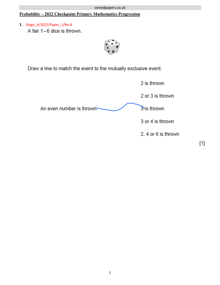 solvedpapers.co.uk Probability – 2022 Checkpoint Primary Mathematics Progression 1. Stage_6/2022/Paper_1/No.8 1 solvedpapers.co.uk 2. Stage_6/2022/Paper_1/No.10 2 solvedpapers.co.uk 3. Stage_5/2022/Paper_1/No.9 as there is an equal chance so it may land on white side up also 3 solvedpapers.co.uk 4. Stage_5/2022/Paper_1/No.28 4 solvedpapers.co.uk 5. Stage_5/2022/Paper_1/No.30 5 solvedpapers.co.uk 6. Stage_5/2022/Paper_1/No.32 6 solvedpapers.co.uk 7. Stage_4/2022/Paper_2/No.4 8. Stage_4/2022/Paper_2/No.25 7 solvedpapers.co.uk 9. Stage_3/2022/Paper_2/No.14 8