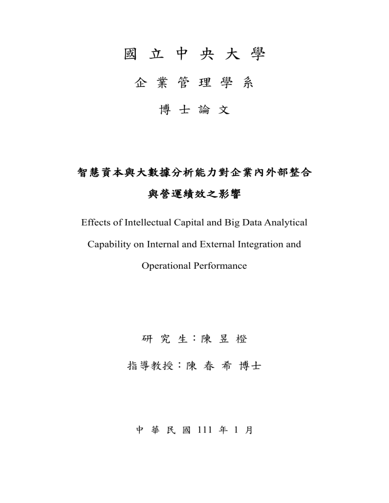 國 立 中 央 大 學 企 業 管 理 學 系 博 士 論 文 智慧資本與大數據分析能力對企業內外部整合 與營運績效之影響 Effects of Intellectual Capital and Big Data Analytical Capability on Internal and External Integration and Operational Performance 研 究 生:陳 昱 橙 指導教授:陳 春 希 博士 中 華 民 國 111 年 1 月 智慧資本與大數據分析能力對企業內外部整合 與營運績效之影響 中文摘要 隨著人工智慧應用的盛行,企業具備的大數據分析能力與智慧資本,在數位 經濟發展中的重要性與日俱增。本研究透過問卷調查進行資料蒐集,研究樣本為 亞洲企業 257 名高階主管,以驗證性因素分析和結構方程模型來檢視智慧資本、 大數據分析能力和企業整合對營運績效所產生的影響和效益。 研究結果發現,人力資本、結構資本與大數據分析能力正向關係,但社會資 本與大數據分析能力無正向關係。另一方面,大數據分析能力與內部整合正向關 係,但與外部整合無正向關係。除此之外,內部整合和外部整合兩者皆與營運績 效有正向關係,以及內部整合會中介影響大數據分析能力對於營運績效的影響。 本研究從智慧資本的角度進行嘗試,提供了無形資源幫助企業建立大數據分析能 力的實證,並證實了大數據分析能力與供應鏈整合、營運績效之間的關係,研究 結果彌補了現有文獻的缺口,並提供管理實務與未來研究之建議。 關鍵詞:智慧資本、內部整合、外部整合、大數據分析能力。 II Effects of Intellectual Capital and Big Data Analytical Capability on Internal and External Integration and Operational Performance Abstract Along with the development of digital economy and artificial intelligence applications, the importance of the big data analytical capability (BDAC) and intellectual capital is a pressing issue for corporates. This study examines the potential benefits and effects of intellectual capital, BDAC, and integrations on corporate’s performance. Data are collected from the distribution of questionnaires to senior managers of the corporates in Asia. 257 copies of valid questionnaire are obtained and analyzed. Confirmatory factor analysis (CFA) and structural equation modeling (SEM) are adopteded for data analysis. It is found that human capital, structural capital is positively correlated to BDAC, whereas social capital is not positively correlated to BDAC. Moreover, BDAC is positively related to internal integration, and both internal integration and external integration are positively correlated to corporate’s performance. In addition, internal integration mediates the relationship between BDAC and operational performance. Drawn on the findings, managerial implications and suggestions for future research are thus discussed. Keywords: intellectual capital, internal integration, external integration, big data analytical capability III 致謝 博班四年半,眨眼間就過去了,謝謝這段路程幫助過我的人。 博一剛入學時,脖子的老毛病再度惡化,每天不是在學校的路上,就是在 醫院的看診間。經過將近一年的時間,終於找到原因,並決定在升三年級的暑 假開刀處理,徹底解決影響我將近十年的痛苦。然而,術後的生活是一段相當 艱難的過程,不僅身體要適應裝在頸椎的醫療器材,同時也要面對課業上期刊 發表的壓力。即使知道非常辛苦,但我決定不逃避,既然選擇要讀博士班,那 就盡自己的全力來取得學位。 這段路程上,最要感謝的是我的指導老師,陳春希教授。陳老師無論是在 學術或是生活上,都給與我相當大的幫助,我永遠記得 2019 年 7 月 15 日,當 我要面對人生第一場大手術時,老師出現在北榮幫我加油打氣,告訴我手術會 成功,以及在期刊論文撰寫遇到困難時,和我一起思考要如何進行,並無私分 享自身的經驗與做法,使後續期刊論文能順利被 SSCI 期刊接受。除了學術知 識的教導,陳老師私底下也是一位良師益友,每次論文討論結束後總會聊起生 活上的許多事情,從做人處事至兩性交友,成為我往後發展職場關係與異性相 處的養分。真的非常謝謝陳老師,若沒有您,博士學位沒有辦法順利完成。 口試能順利通過,也要謝謝口試委員,臺科大企管系葉穎蓉教授、中央人 資所房美玉教授、中央資管系周惠文教授、元智大學企管系張玉萱教授。口委 們的意見非常寶貴,使論文能夠更臻完善,倘若未來還有機會,希望能夠再向 各位前輩請益學習。 謝謝我的家人,在我讀博士班時給了許多的鼓勵,尤其是我的父親,總是 不辭辛勞的台北-中壢來回開車載我,以後就換我開車載您了。 謝謝閔肖蔓夥伴兩年半的協助,讓我擺脫過去的陰影,重新開始做自己。 謝謝工研院產科國際所 政策組的英崑、清萍與怡萍,給了我這個機會,能 在畢業前為國家獻一份心力,也謝謝 400 部門的筑翔、佳姸、韋廷、佳楹,平 日工作任務繁多時總是互相扶持,臭皮匠小組絕非浪得虛名。 謝謝詩涵,在我於論文與工作之中忙得不可開交時,總是來新竹給我加油 打氣,你的陪伴給了我很大的勇氣來面對難關,往後的日子也要一起走下去。 最後,謝謝自己,過程雖然辛苦,也有許多挫折,但在四年半的努力與堅 持,最終也做出了一點成績,期許自己未來能發揮所學,幫助國家變得更好。 陳昱橙 謹誌於國立中央大學企管系 中華民國 111 年 1 月 8 日 IV 智慧資本與大數據分析能力對企業內外部整合 與營運績效之影響 目 錄 中文摘要........................................................... II ABSTRACT ........................................................ III 目 錄.........................