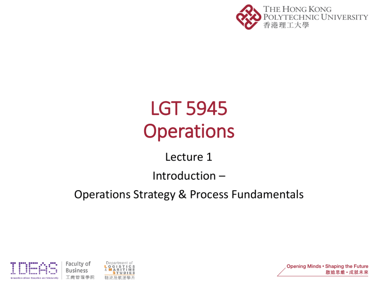 LGT 5945 Operations Lecture 1 Introduction – Operations Strategy & Process Fundamentals Typical MBA Students Reaction to Operations Management What is behind every successful product and service? What is Operations? “The process of bringing goods and services to customers” Firm infrastructure Technology development Procurement value Human resources management Inbound logistics Operations Outbound logistics Marketing and sales Service Value-added = the benefit of the product to customer – its cost Customer Course Motivation Firms that are better at managing their operations enjoy a significant competitive advantage. How to teach this course? • We feel that professional training requires tools and strategies that students can implement in practice. • Real operations, real solutions • Quantitative models • Use as little mathematical notation as possible, provide many real-world examples, while maintaining analytical rigors. Basic Economic Order Quantity (EOQ) Model Total = Annual + Annual + Annual annual purchase ordering holding cost cost cost cost Three Modules • Module 1 (M1): Designing and Managing Processes - operations strategy, and process analysis, waiting line theory, quality management and statistical quality control, lean operations, Toyota production system, business process reengineering • Module 2 (M2): Matching Supply with Demand - Capacity management, revenue management, inventory management • Module 3 (M3): Managing Supply Chains - Supply chain design, risks, supply chain coordination Lecture Topics Topic 1 Introduction to OM, operations strategies, and process fundamentals 2 Process analysis and bottlenecks in processes 3 Capacity management and revenue management 4 Inventory management 5 Waiting line theory: the impact of variability 6 Quality management 7 Lean operations and Toyota Production System 8 Supply chain management 9 Supply chain coordination 10 Innovative business models Grading Assessment Components Class participation (attend., discuss., games) 20% Two quizzes 20% Group writings 20% Group project (presentation & report) 20% Individual assignment 20% Course Materials • Required Reading: - Lecture notes and other materials posted on Blackboard • Main References: - Cachon, G. & Terwiesch, C. (2024), Matching Supply With Demand (5th ed.), McGraw-Hill. - Krajewski, L. J., Ritzman, L. P., Malhotra, M. K., (2022), Operations management: processes and supply chains (13th ed.), Pearson/Prentice Hall. - Chopra, S. (2019) Supply Chain Management: Strategy, Planning, and Operation (7th ed.), Pearson. • Other References: - Anupindi, R., Chopra, S., Deshmukh, S.D., Van Mieghem , J.A. & Zemel, E. (2012), Managing Business Process Flows (3rd ed.), Prentice Hall. - Jacobs, F. R., and Chase, R. B., (2021), Operations and Supply Chain Management (16th Global ed.), McGraw-Hill. - Heizer, J., Render, B., Munson C., (2022), Operations Management: Sustainability and Supply Chain Management (14th ed.), Pearson/Prentice Hall. - Schroeder, R. G., Rungtusanatham, M. J., Goldstein, S. M., (2021), Operations management in the supply chain: decisions and cases, McGraw-Hill. Your Participation • Students are expected to take an active role in classroom activities. • Participation includes: - Asking questions - Answering questions - Extending further ideas presented by others - Offering examples - Proposing different points of view - Encouraging others to speak by directing questions in their ways - Demonstrating that you have prepared for class • Use your laptop computer and tablet only for class-related purposes. What prevents you from better learning? Multi-Tasking “A Microsoft study on office interruptions found that workers experienced an average of four interruptions per hour. For every 30-second distraction, the research firm Basex estimates it takes 5 minutes for workers to return to work. That’s 22 minutes wasted every hour which, according to Basex, adds up to almost $1 trillion in productivity losses each year.” Source: C. Suddath, Bloomberg Businessweek, October 29 – November 4, 2012 Lecture 1 – Learning Outcome • Understand what operations management is • Discuss operations and supply chain strategies • Understand why strategies have implications relative to business risk • Form a process view of organization • Evaluate process performance • Beware of ethics issues in decision making What Is Operations Management? • Operations Management - Management of the conversion process which transforms inputs such as raw material and labor into outputs in the form of finished goods and services. Value-added* Inputs (customers and/or materials) Transformation Process (components) Outputs (goods and services) Resources (capital & labor) *Value-added: The difference between the cost of inputs and the value or price of outputs. Producing Burger Input-Transformation-Output Relationships for Typical Systems The Goods–Services Continuum Most Products Are a “Bundle” of Goods and Services US Service Industry vs Manufacturing Employment Growth Since 1939 Differences Between Goods and Services Goods Services Tangible Intangible Can be inventoried Cannot be inventoried Less interaction between customer Direct interaction between and process customer and process Operations and Supply Chain Management Operations Manufacturing and service processes used to transform resources into products Supply Chain Processes that move information and material to and from the firm Operations and Supply Chain Management • The design, operation, and improvement of the systems that create and delivery the firm’s primary products and services • Operations and supply chain management (OSCM) is – A functional field of business – With clear lines management responsibilities – Concerned with the management of the entire production/delivery system Supply Chain Processes The Process View of Organization • A process is any transformation that conver