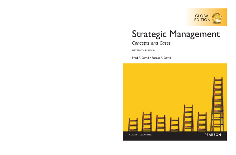 GLOBAL EDITION Strategic Management Concepts and Cases FIFTEENTH EDITION 'SFE3%BWJEr'PSFTU3%BWJE %BWJEr%BWJE Whatever your course goals, we’ve got you covered! Use MyManagementLab® to improve student results! S Study Plan – Help students build a basic understanding of key concepts. Students start by taking a pretest to gauge initial understanding of key concepts. Upon completion, they receive a personalized path of study based on the areas where they would benefit from additional study and practice. S Business Today – Bring current events alive in your classroom with videos, discussion questions, and author blogs. Be sure to check back often; this section changes daily. S Decision-making Simulations – Place your students in the role of a key decision-maker, where they are asked to make a series of decisions. The simulation will change and branch based on the decisions students make, providing a variation of scenario paths. Upon completion of each simulation, students receive a grade, as well as a detailed report of the choices they made during the simulation and the associated consequences of those decisions. S Dynamic Study Modules – Through adaptive learning, students get personalized guidance where and when they need it most, creating greater engagement, improving knowledge retention, and supporting subject-matter mastery. Ultimately, students’ self-confidence increases and their results improve. Also available on mobile devices. S Writing Space – Better writers make great learners—who perform better in their courses. Providing a single location to develop and assess concept mastery and critical thinking, the Writing Space offers assisted graded and create-your-own writing assignments, enabling you to exchange personalized feedback with students, quickly and easily. Writing Space can also check students’ work for improper citation or plagiarism by comparing it against the world’s most accurate text comparison database, available from Turnitin. http://www.pearsonmylabandmastering.com Comprehensive Model of the Chapter 2: The Internal Audit Chapter 6 Vision and Mission Analysis Chapter 5 Types of Strategies Chapter 4 Strategy Generation and Selection Chapter 8 The External Audit Chapter 7 Chapter 3: Strategy Formulation USED WIDELY AMONG BUSINESSES AND ACADEMIA WORLDWIDE Strategic-Management Process Outside-USA Strategic Planning SIMPLE AND STRAIGHTFORWARD APPROACH TO STRATEGIC PLANNING Strategy Implementation Chapter 9 Strategy Execution Chapter 10 Strategy Monitoring Chapter 11 Ethics/Social Responsibility/Sustainability Strategy Implementation Strategy Evaluation USED TO INTEGRATE AND ORGANIZE ALL CHAPTERS IN THIS TEXT STRATEGIC MANAGEMENT Concepts and Cases A COMPETITIVE ADVANTAGE APPROACH Editor in Chief: Stephanie Wall Program Management Lead: Ashely Santora Program Manager: Sarah Holle Editorial Assistant: Bernard Ollila Head of Learning Asset Acquisition, Global Editions: Laura Dent Senior Acquisitions Editor, Global Editions: Steven Jackson Project Editor, Global Editions: Laura Thompson Assistant Project Editor, Global Editions: Paromita Banerjee Marketing Director: Maggie Moylan Senior Marketing Manager: Erin Gardner Senior Production Manufacturing Controller, Global Editions: Trudy Kimber Project Management Lead: Judy Leale Project Manager: Ann Pulido Procurement Specialist: Michelle Klein Art Director, Interior: Kenny Beck Designer, Interior: Laura Ierardi Creative Director, Cover: Jayne Conte Designer, Cover: Bruce Kenselaar Cover Image: © Nonnakrit/Shutterstock VP, Director of Digital Strategy & Assessment: Paul Gentile Digital Editor: Brian Surette Digital Development Manager: Robin Lazrus Digital Project Manager: Alana Coles MyLab Product Manager: Joan Waxman Digital Production Project Manager: Lisa Rinaldi Media Production Manager, Global Editions: Vikram Kumar Full-Service Project Management and Composition: Integra Credits and acknowledgments borrowed from other sources and reproduced, with permission, in this textbook appear on the appropriate page within text. Microsoft® and Windows® are registered trademarks of the Microsoft Corporation in the U.S.A. and other countries. Screen shots and icons reprinted with permission from the Microsoft Corporation. This book is not sponsored or endorsed by or affiliated with the Microsoft Corporation. Pearson Education Limited Edinburgh Gate Harlow Essex CM20 2JE England and Associated Companies throughout the world Visit us on the World Wide Web at: www.pearsonglobaleditions.com © Pearson Education Limited 2015 The rights of Fred R. David and Forest R. David to be identified as authors of this work have been asserted by them in accordance with the Copyright, Designs and Patents Act 1988. Authorized adaptation from the United States edition, entitled Strategic Management: A Competitive Advantage Approach, Concepts & Cases, 15th Edition, ISBN 978-0-13-344479-7 by Fred R. David and Forest R. David, published by Pearson Education © 2015. All rights reserved. No part of this publication may be reproduced, stored in a retrieval system, or transmitted in any form or by any means, electronic, mechanical, photocopying, recording or otherwise, without either the prior written permission of the publisher or a license permitting restricted copying in the United Kingdom issued by the Copyright Licensing Agency Ltd, Saffron House, 6–10 Kirby Street, London EC1N 8TS. All trademarks used herein are the property of their respective owners. The use of any trademark in this text does not vest in the author or publisher any trademark ownership rights in such trademarks, nor does the use of such trademarks imply any affiliation with or endorsement of this book by such owners. ISBN 10: 1-292-01689-2 ISBN 13: 978-1-292-01689-4 British Library Cataloguing-in-Publication Data A catalogue record for this book is available from the British Library 10 9 8 7 6 5 4 3 2 1 Typeset in 10/12 Times LT Std by Integra Printed and bound 