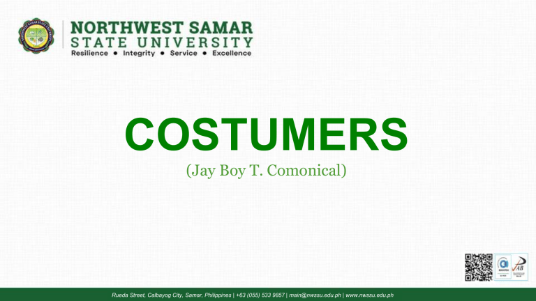 COSTUMERS (Jay Boy T. Comonical) Rueda Street, Calbayog City, Samar, Philippines | +63 (055) 533 9857 | main@nwssu.edu.ph | www.nwssu.edu.ph WHAT IS COSTUMERS? In the simplest terms, a customer is someone who receives a good, service, or product from a seller in exchange for something of value, usually money. This can be a person or even another business. WHAT ARE THE TYPES OF COSTUMERS? Loyal customers: These are your repeat customers who consistently buy from you and are often your biggest advocates. Impulse buyers: These customers make decisions on the spot, often without much thought or planning. They're attracted to eye-catching displays, limited time offers, and emotional appeals. Discount customers: These customers are primarily driven by price and are always looking for the best deal. They're likely to compare prices across different stores and may only buy from you when you have a sale. Need-based customers: These customers know exactly what they want and need and are not swayed by impulse or emotion. They're focused on practicality and value and are likely to do their research before making a purchase. Wandering customers: These customers are unsure of what they want and are browsing for inspiration. They may need help from salespeople to find the right product. COSTUMERS VS CONSUMER Costumers Consumer • Focuses on purchase • Focuses on usage • Can be anyone • Typically, the end user • Motivation can vary • Motivation is consumption • Not always the end user • Can overlap with customer Customer needs, Pain points, and Demographics Costumer needs Customer needs are the underlying motivations and desires that drive customers to purchase products or services. They represent the problems, goals, and challenges that your customers hope to solve or achieve through your offerings. Understanding these needs is crucial for any business success, as it allows you to develop products and services that truly resonate with your target audience. Functional needs: These are the practical and tangible needs that a product or service must fulfill. They relate to the specific features and functionalities that customers expect and rely on. Social needs: These are the needs related to belonging, status, and identity. Customers might be motivated by a desire to fit in with a certain group, project a certain image, or feel good about themselves through their purchases. Emotional needs: These are the needs related to feelings, experiences, and personal well-being. Customers might be looking for products or services that evoke positive emotions like happiness, excitement, or peace of mind. Latent needs: These are the unspoken and often unrecognized needs that customers may not even be aware of themselves. They can be discovered through careful research and observation and understanding them can lead to innovative products and services that fulfill desires customers didn't know they had. Pain Points Business pain points are the specific challenges, issues, or problems that hinder a business's growth, profitability, or overall success. These pain points can manifest in various ways, impacting different aspects of business operations. Identifying and addressing these pain points effectively is crucial for any business to optimize its performance and achieve its goals. Customer Related Low customer satisfaction: This pain point can stem from various issues like poor product quality, inadequate customer service, or inconvenient buying experiences. It can lead to negative brand perception, lost customers, and decreased revenue. Customer acquisition challenges: Difficulty attracting new customers can hinder growth and limit market share. This could be due to ineffective marketing strategies, irrelevant products, or high competition. Customer churn: Losing existing customers can be even more detrimental than acquiring new ones. Understanding the reasons behind customer churn, like high pricing, lack of loyalty programs, or competitor offerings, is crucial for retention strategies. Operational Plan Inefficient processes: Manual tasks, outdated systems, and poor communication can lead to wasted time, increased costs, and errors. Streamlining processes can improve efficiency, productivity, and accuracy. Talent management challenges: Finding, hiring, and retaining skilled employees can be a major pain point for many businesses. This can affect productivity, innovation, and overall business performance. Technological limitations: Outdated technology, lack of automation, and data silos can hinder growth and competitiveness. Investing in modern technology can improve efficiency, data analysis, and customer experience. Financial Pain: Low profitability: Insufficient revenue, high expenses, and inefficient cost management can lead to financial challenges. Analyzing operating costs, optimizing budgeting, and exploring new revenue streams are crucial for financial stability. Limited access to capital: Lack of funding can restrict growth opportunities and hinder expansion plans. Securing loans, exploring alternative funding sources, or improving financial statements can alleviate this pain point. Cash flow issues: Inconsistent income or high upfront costs can lead to cash flow problems. Implementing sound financial planning, managing payables and receivables efficiently, and exploring flexible payment options can help address this issue. Demographics In business, demographics refer to the statistical characteristics of a population: its measurable and observable traits. By understanding these traits, businesses can gain valuable insights into their target audience, tailor their marketing and sales strategies, and make informed decisions about product development and resource allocation Identifying Target Audience Age: Targeting products and services based on age groups, like toys for children or retirement planning services for seniors. Gender: Marketing campaigns can be designed to resonate with specific 