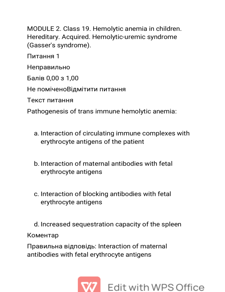 MODULE 2. Class 19. Hemolytic anemia in children. Hereditary. Acquired. Hemolytic-uremic syndrome (Gasser's syndrome). Питання 1 Неправильно Балів 0,00 з 1,00 Не поміченоВідмітити питання Текст питання Pathogenesis of trans immune hemolytic anemia: a. Interaction of circulating immune complexes with erythrocyte antigens of the patient b. Interaction of maternal antibodies with fetal erythrocyte antigens c. Interaction of blocking antibodies with fetal erythrocyte antigens d. Increased sequestration capacity of the spleen Коментар Правильна відповідь: Interaction of maternal antibodies with fetal erythrocyte antigens Питання 2 Неправильно Балів 0,00 з 1,00 Не поміченоВідмітити питання Текст питання What causes the destruction of erythrocytes in G-6-FDG deficiency: a. Toxic effect on erythrocytes b. Increasing the sequestration capacity of the spleen c. Decrease in the number of erythropoiesis precursors in the bone marrow d. Hemolysis e. Delay of erythrocyte maturation in bone marrow Коментар Правильна відповідь: Hemolysis Питання 3 Неправильно Балів 0,00 з 1,00 Не поміченоВідмітити питання Текст питання Microspherocytosis is observed in: a. Decreases in cholesterol and phospholipids in blood plasma and erythrocyte membrane b. Absence of spectrin protein in the erythrocyte membrane c. Decreases in ATP and 2,3-DFG in erythrocytes d. Anomalies of rhesus system antigens Коментар Правильна відповідь: Absence of spectrin protein in the erythrocyte membrane Питання 4 Правильно Балів 1,00 з 1,00 Не поміченоВідмітити питання Текст питання Laboratory parameters for anemia associated with G-6- FDG deficiency: a. Pancytopenia, reticulocytosis, high normoblastosis b. Anemia, thrombocytopenia, leukocytosis c. Anemia, planocytosis, severe hypochromia of erythrocytes d. Sharp decrease in the number of erythrocytes, hemoglobin, reticulocytosis, macrocytosis, normoblastosis e. Megaloblastoid hematopoiesis Коментар Правильна відповідь: Sharp decrease in the number of erythrocytes, hemoglobin, reticulocytosis, macrocytosis, normoblastosis Питання 5 Неправильно Балів 0,00 з 1,00 Не поміченоВідмітити питання Текст питання Stomatocytosis occurs in: a. Anomalies of rhesus system antigens b. Changes in cholesterol and phospholipids in blood plasma and erythrocyte membrane c. Absence of spectrin protein in the erythrocyte membrane d. Primary disruption of membrane protein structure and increased sodium erythrocyte uptake Коментар Правильна відповідь: Primary disruption of membrane protein structure and increased sodium erythrocyte uptake Питання 6 Правильно Балів 1,00 з 1,00 Не поміченоВідмітити питання Текст питання The thickness of erythrocytes in Minkowski-Schoffar disease is: a. 2.5 - 3 microns b. 0.7 - 1.5 microns c. 1.5 - 1.9 microns d. 1.9 - 2.1 microns Коментар Правильна відповідь: 2.5 - 3 microns Питання 7 Правильно Балів 1,00 з 1,00 Не поміченоВідмітити питання Текст питання A characteristic feature of autoimmune hemolytic anemia with thermal hemolysins is: a. Hyperbilirubinemia b. Decrease in osmotic resistance of erythrocytes c. Stigmas of dysembryogenesis d. Excretion of black urine e. High content of histamine in blood serum Коментар Правильна відповідь: Excretion of black urine Питання 8 Неправильно Балів 0,00 з 1,00 Не поміченоВідмітити питання Текст питання Time of onset of hemolysis due to medication for G-6FDG deficiency: a. Immediately b. 48 hours c. After 2-3 hours d. During the day e. 3 - 5 day Коментар Правильна відповідь: 3 - 5 day Питання 9 Правильно Балів 1,00 з 1,00 Не поміченоВідмітити питання Текст питання The main pathogenetic mechanism in hereditary elliptocytosis: a. Violation of erythrocyte membrane structure b. Intoxication c. Lesions at the level of cells - the precursor of myelopoiesis d. Presence of circulating antierythrocyte antibodies Коментар Правильна відповідь: Violation of erythrocyte membrane structure Питання 10 Неправильно Балів 0,00 з 1,00 Не поміченоВідмітити питання Текст питання Hypovolemic (circulatory) collapse (shock) in SKA - a manifestation of the crisis: a. Sequestration b. Hemorrhagic c. Aplastic d. Hemolytic e. Vase-occlusive Коментар Правильна відповідь: Sequestration Питання 11 Неправильно Балів 0,00 з 1,00 Не поміченоВідмітити питання Текст питання The most effective treatment for Minkowski-Schoffar disease: a. Glucocorticoid hormones b. Transfusions of erythrocyte mass c. Vitamin therapy d. Splenectomy Коментар Правильна відповідь: Splenectomy Питання 12 Правильно Балів 1,00 з 1,00 Не поміченоВідмітити питання Текст питання Target erythrocytes are most characteristic of: a. Thalassemia b. Acquired hemolytic anemias c. B12-deficient anemia d. Intoxication e. Minkowski-Schoffar anemia Коментар Правильна відповідь: Thalassemia Питання 13 Неправильно Балів 0,00 з 1,00 Не поміченоВідмітити питання Текст питання Morphology of erythrocytes in Minkowski-Schoffar disease: a
