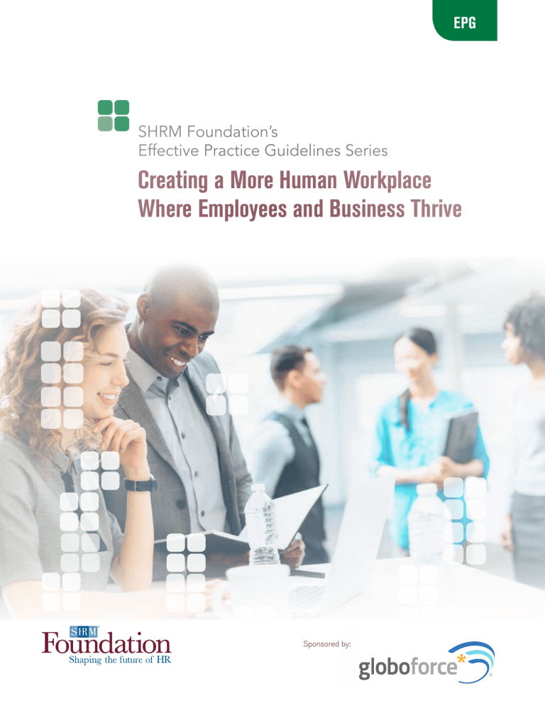 EPG EPG SHRM Foundation’s Effective Practice Guidelines Series Creating a More Human Workplace Where Employees and Business Thrive Sponsored by: Creating a More Human Workplace Where Employees and Business Thrive This publication is designed to provide accurate and authoritative information regarding the subject matter covered. Neither the publisher nor the authors are engaged in rendering legal or other professional service. If legal advice or other expert assistance is required, the services of a competent, licensed professional should be sought. Any federal and state laws discussed in this report are subject to frequent revision and interpretation by amendments or judicial revisions that may significantly affect employer or employee rights and obligations. Readers are encouraged to seek legal counsel regarding specific policies and practices in their organizations. This book is published by the SHRM Foundation, an affiliate of the Society for Human Resource Management (SHRM©). The interpretations, conclusions and recommendations in this report are those of the authors and do not necessarily represent those of the SHRM Foundation. ©2016 SHRM Foundation. All rights reserved. Printed in the United States of America. This publication may not be reproduced, stored in a retrieval system or transmitted in whole or in part, in any form or by any means, electronic, mechanical, photocopying, recording or otherwise, without the prior written permission of the SHRM Foundation, 1800 Duke Street, Alexandria, VA 22314. Selection of report topics, treatment of issues, interpretation and other editorial decisions for the Effective Practice Guidelines series are handled by SHRM Foundation staff and the report authors. Report sponsors may review the content prior to publication and provide input along with other reviewers; however, the SHRM Foundation retains final editorial control over the reports. Editorial decisions are based solely on the defined scope of the report, the accuracy of the information and the value it will provide to the readers. The SHRM Foundation does not explicitly or by implication endorse or make any representations or warranties of any kind regarding its sponsors or the products, services or claims made by its sponsors. The SHRM Foundation does not assume any responsibility or liability for the acts, omissions, products or services offered by its sponsors. For more information, contact the SHRM Foundation at 703.535.6020. Online at shrmfoundation.org 16-0222 Table of Contents iii Foreword v Acknowledgments vii About the Author 1Creating a More Human Workplace Where Employees and Business Thrive 2 Strategies That Pay Off 3 High Costs of Our Current Work Culture 3 Multiple Benefits of a Thriving Work Culture 7Seven Ways to Help Employees Thrive 7 Share Information About the Organization and Its Strategy 8 Provide Decision-Making Discretion and Autonomy 9 Create a Civil Culture and Positive Relationships 12 Value Diversity and Create an Inclusive Atmosphere 13 Offer Performance Feedback 15 Provide a Sense of Meaning 16 Boost Employee Well-Being 20 Individual Strategies for Thriving 22 S et the Example: The Importance of Leaders 25 Conclusion 27 Recommended Readings 28 References i Creating a More Human Workplace Where Employees and Business Thrive FOREWORD For many employees, the current state of the workplace is depleting, dispiriting and stressful. “Doing more with less” often means demands are exceeding capacity, draining people of the energy needed to fulfill their potential. Technology links us 24/7 to a flood of information, and Americans are spending more and more hours working with little downtime. How do we, as HR professionals, change this picture? Research has shown that creating a more human, caring workplace ultimately leads to improved customer service, better health outcomes and all-around satisfaction. A more human workplace is one that promotes people’s strengths and capabilities, leading to the high levels of engagement, productivity and retention businesses need. This new report, Creating a More Human Workplace Where Employees and Business Thrive, will provide you with detailed suggestions—many for little or no cost—on how to shape a culture of thriving so your organization can achieve these valuable outcomes that benefit both employees and the bottom line. Now used in college classrooms worldwide, the SHRM Foundation’s Effective Practice Guidelines series includes more than 20 titles. The series was created in 2004 for busy HR professionals. It integrates research findings with expert opinion in an easy-to-use format and provides the tools to successfully practice evidence-based management. Other recent reports include Talent Acquisition, Leading Change, and Cultural Intelligence: The Essential Intelligence for the 21st Century. To ensure the material is both practical and research-based, the reports are written by subject-matter experts and are then peer-reviewed by both academics and HR professionals. In addition to producing educational resources, the SHRM Foundation awards multiple scholarships annually to support education, conference attendance and SHRM certification for HR professionals. And all this good work is made possible by the generous support of donors like you. We encourage you to learn more. Please visit shrmfoundation.org to download other complimentary resources and to find out how you can get involved with the SHRM Foundation. Thank you! Mark Schmit, Ph.D., SHRM-SCP Executive Director SHRM Foundation iii Creating a More Human Workplace Where Employees and Business Thrive ACKNOWLEDGMENTS The SHRM Foundation is grateful for the assistance of the following individuals in producing this report: REVIEWERS Chu-Hsiang Chang, Ph.D. Associate Professor, Psychology Michigan State University East Lansing, MI Cynthia R. H. King, PHR, SHRM-CP Director of Human Resources Institute for Health and Recovery Cambridge, MA Kevin Mullins Senior 